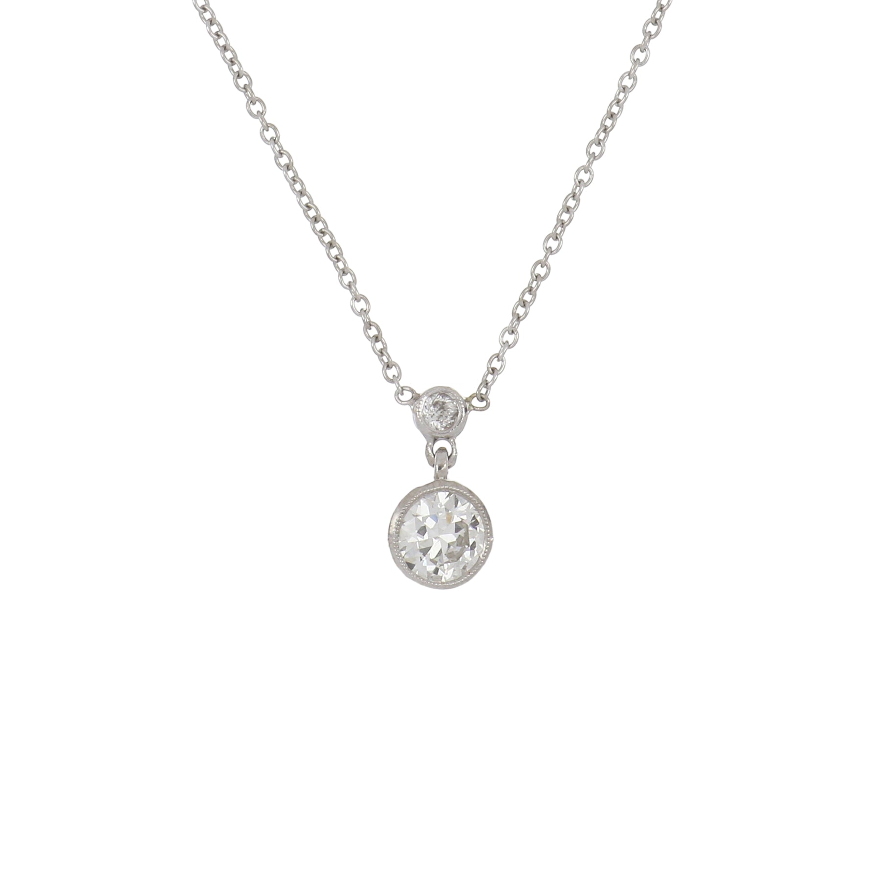 A bezel-set drop pendant necklace featuring antique Old European-Cut diamonds, set in a modern platinum setting.