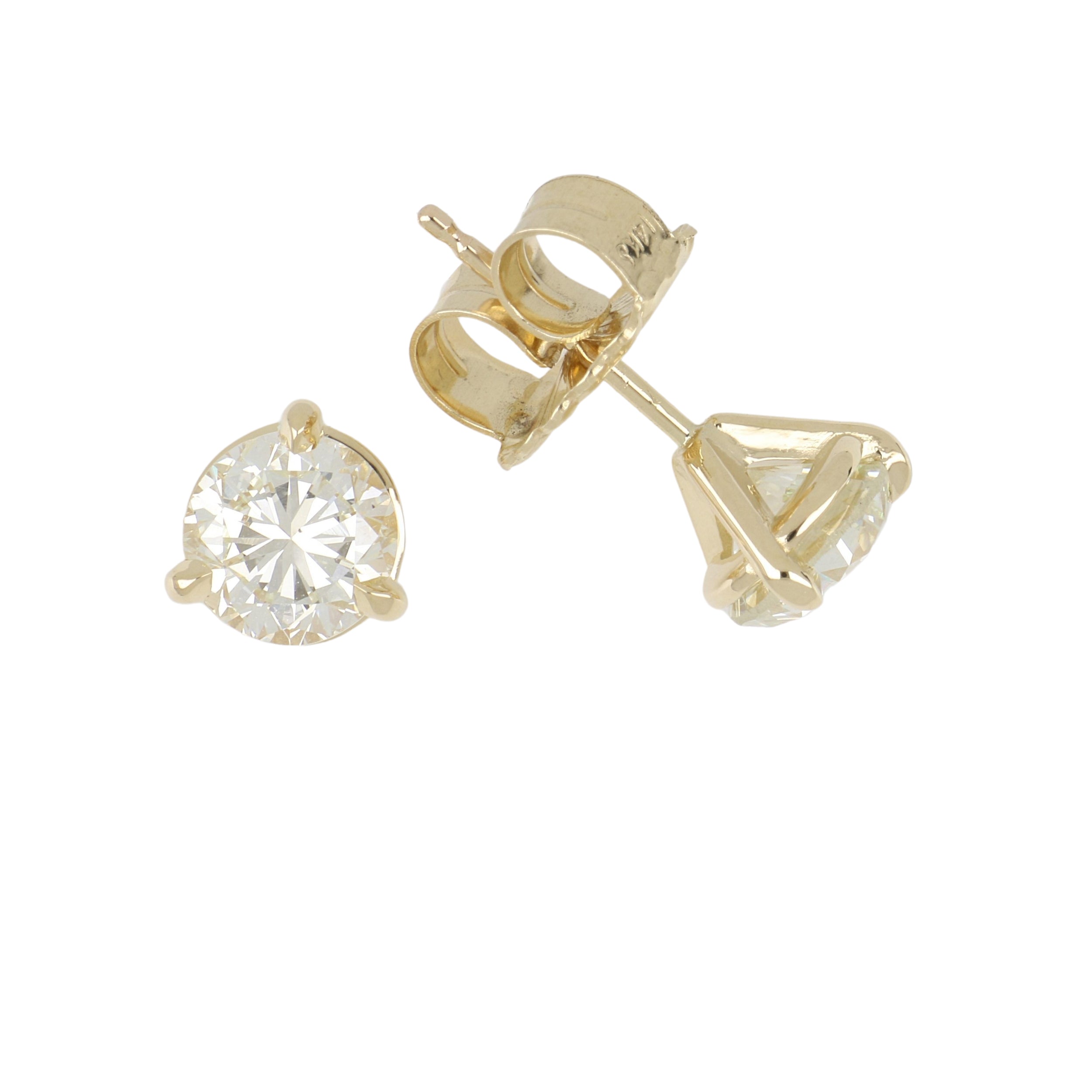 A pair of round brilliant-cut diamond stud earrings, set in 14k yellow gold.