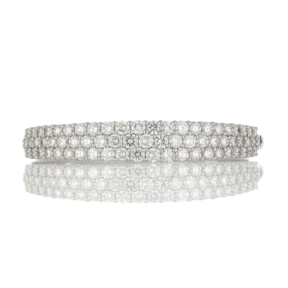 An estate classic modern, triple row, shared prong set round brilliant-cut diamond bangle in 18k white gold.