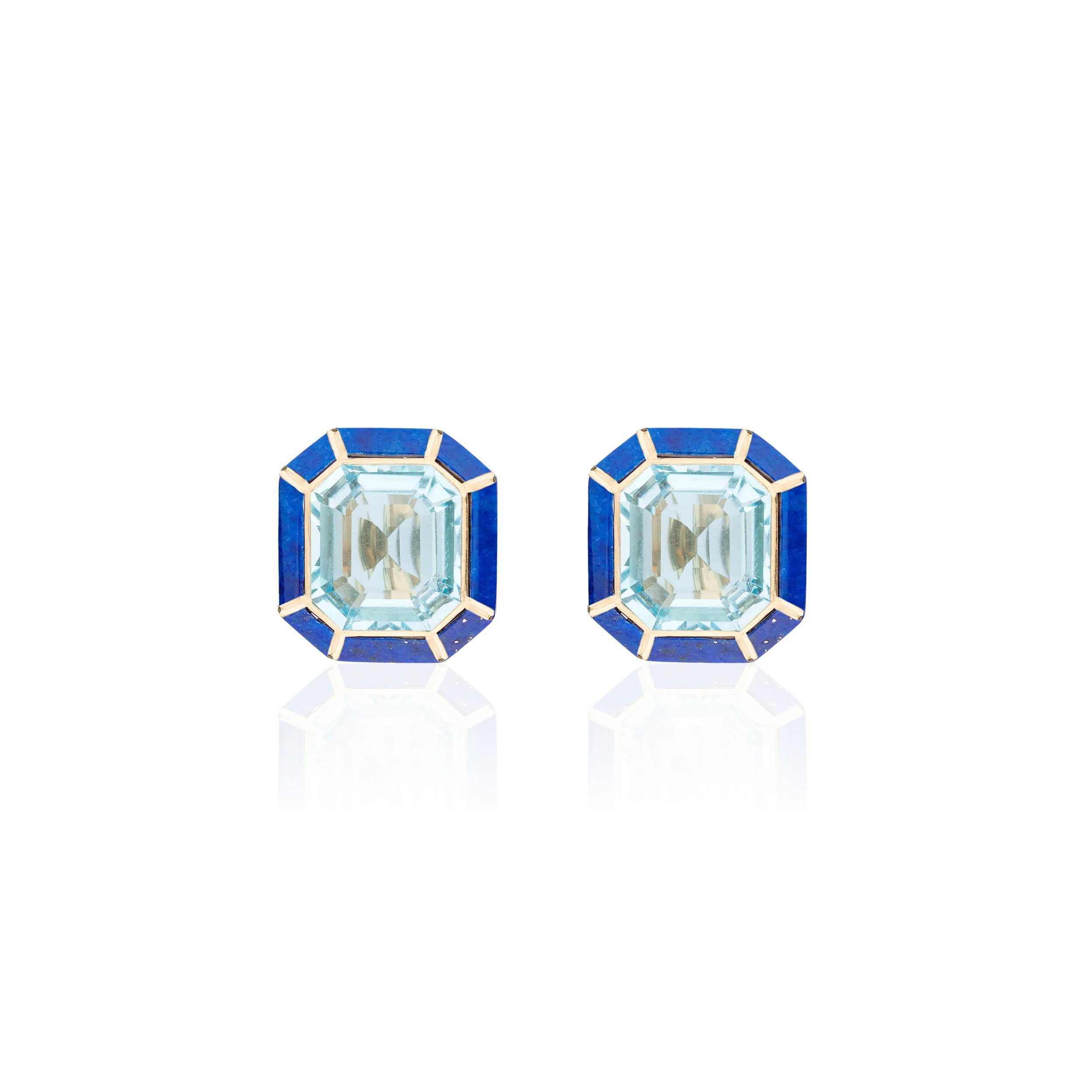 A pair of Goshwara 'Melange' Collection stud earrings featuring blue topaz framed with lapis inlay in 18K yellow gold.