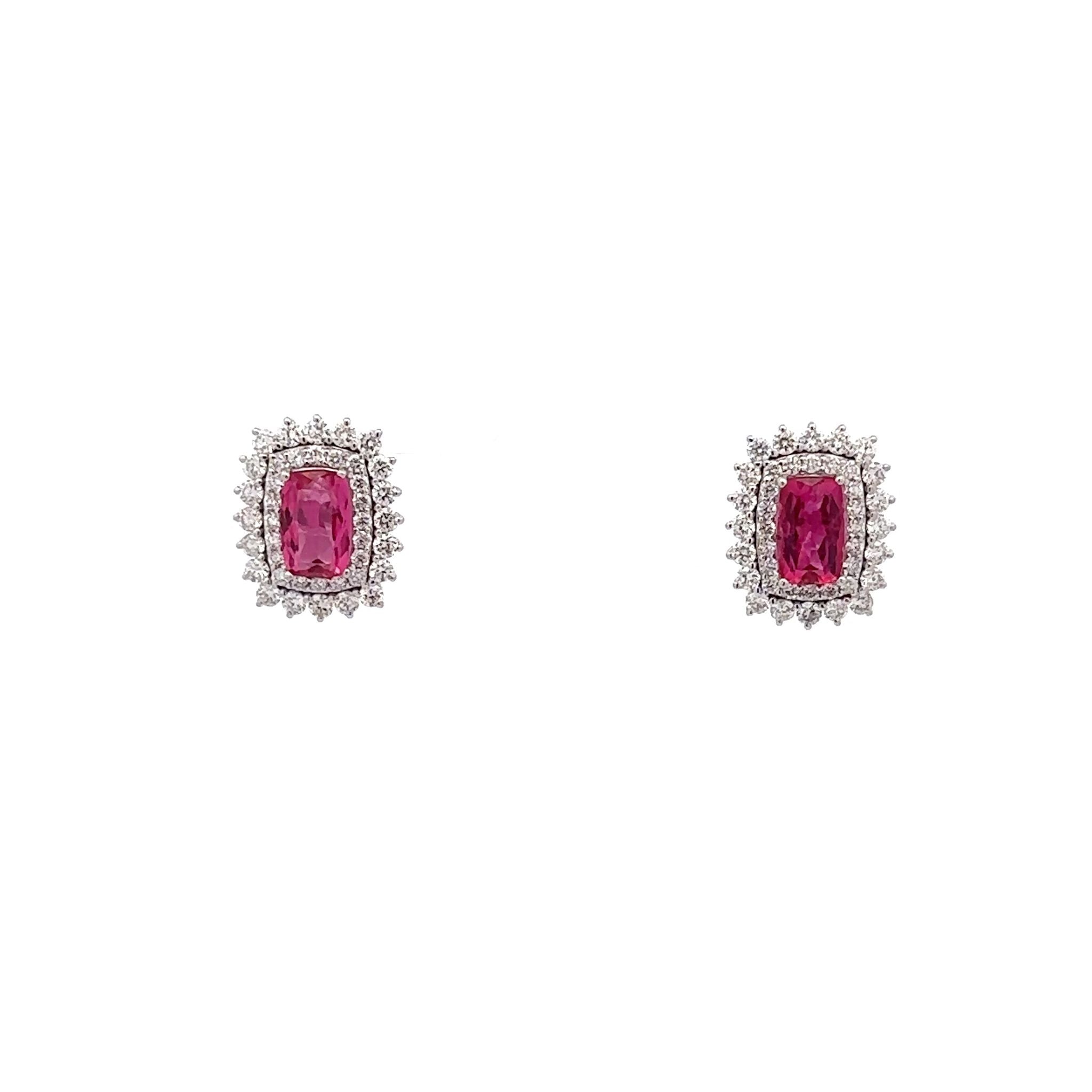 A pair of Maharaja rectangular pink tourmaline stud earrings with double round brilliant cut diamond halos, set in 18K white gold.
