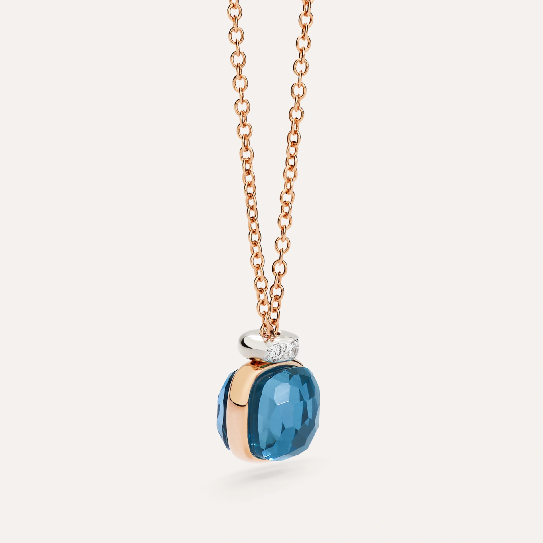 A Pomellato Nudo Mini necklace in London blue topaz with diamond accents, set in 18K rose and white gold.