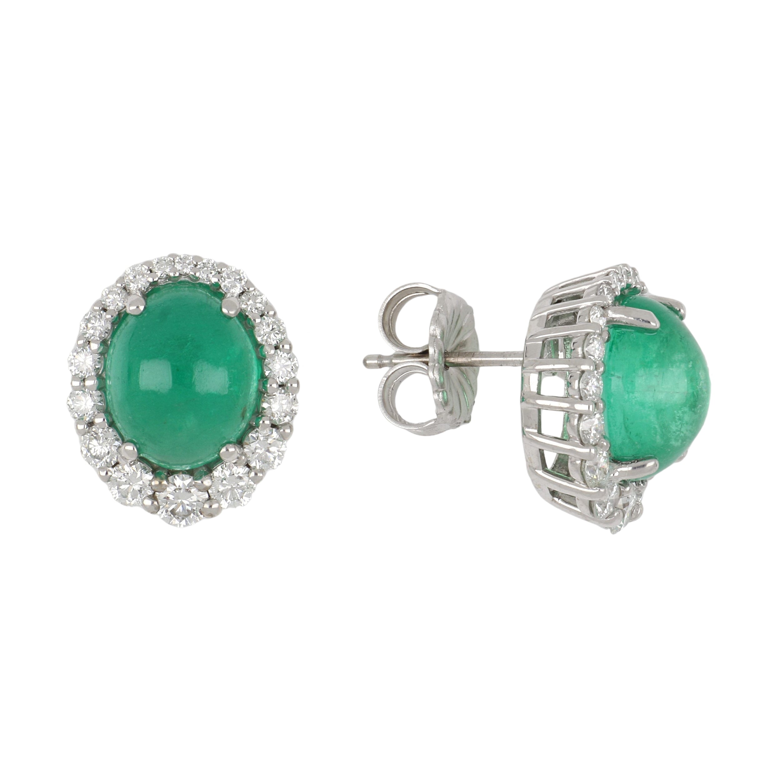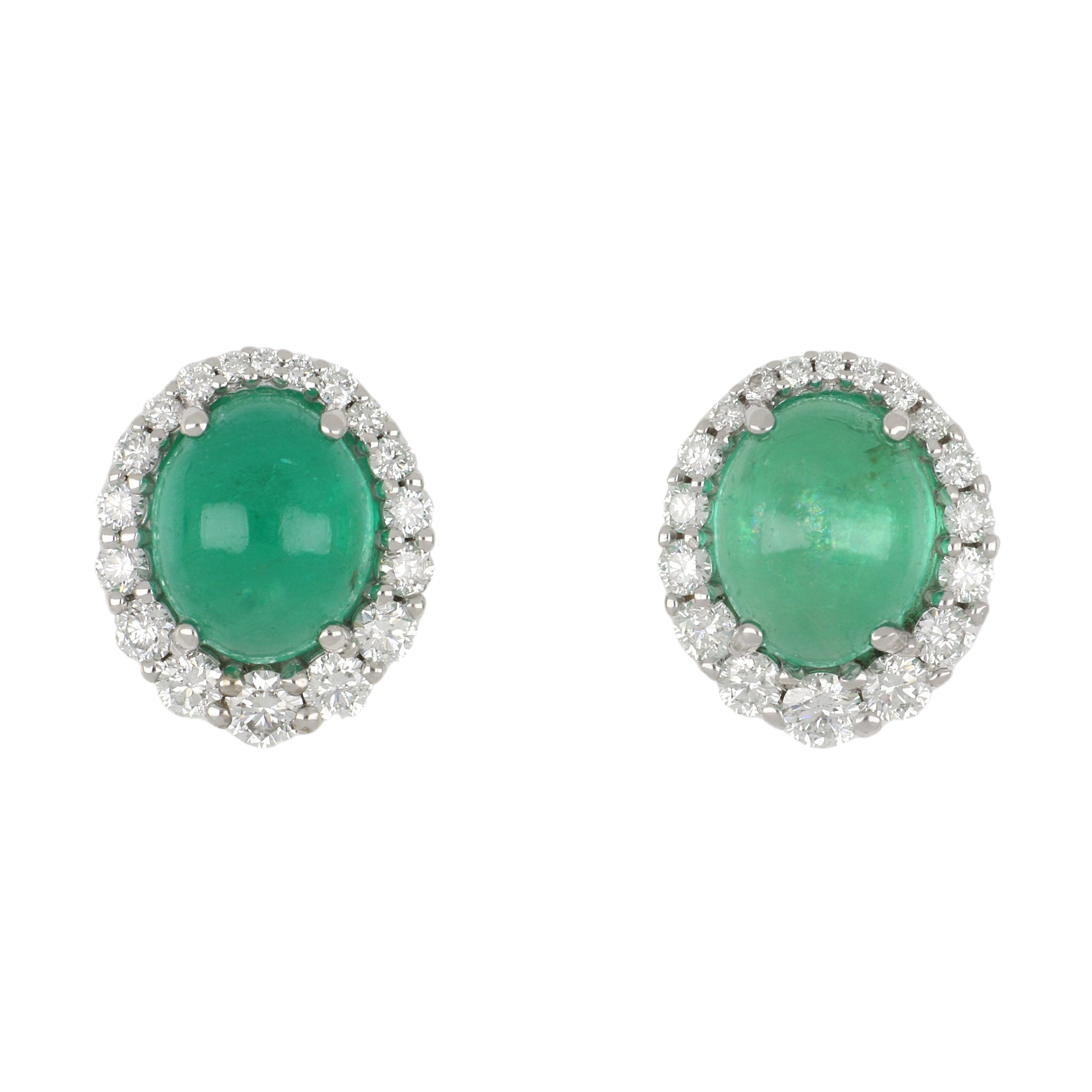 A pair of cabochon emerald earrings with round brilliant-cut diamond graduated halos, set in 14K white gold.
