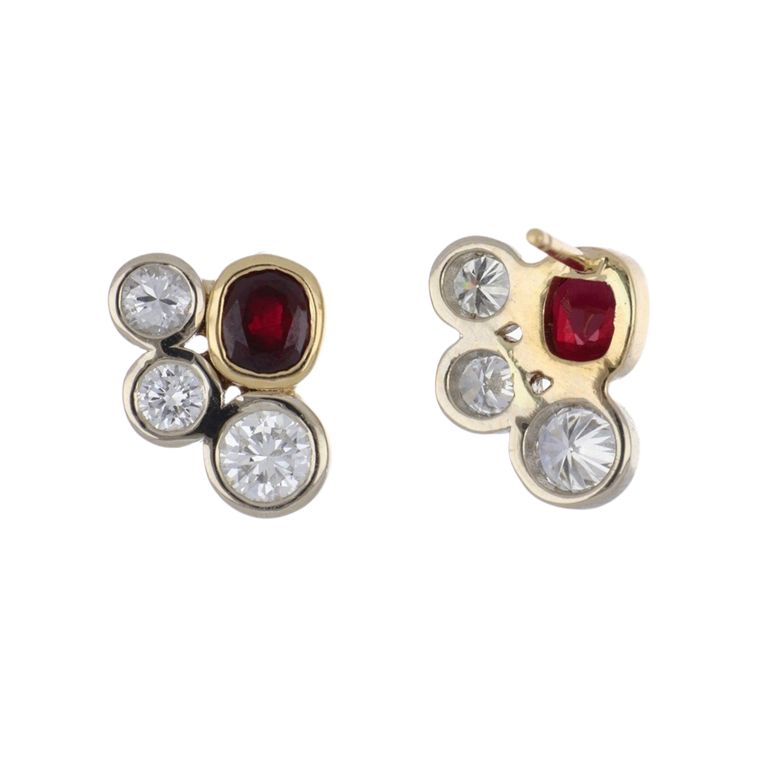 A pair of cushion-cut ruby and round brilliant-cut diamond cluster earrings, set in 18k yellow and white gold.
