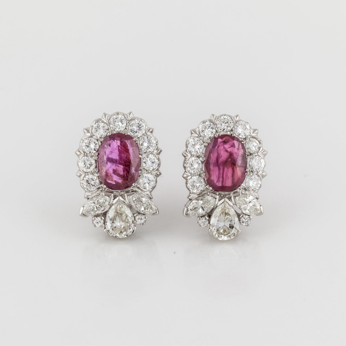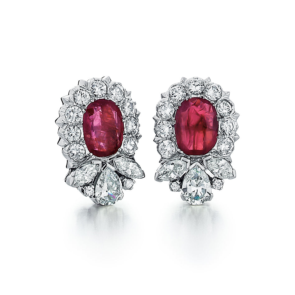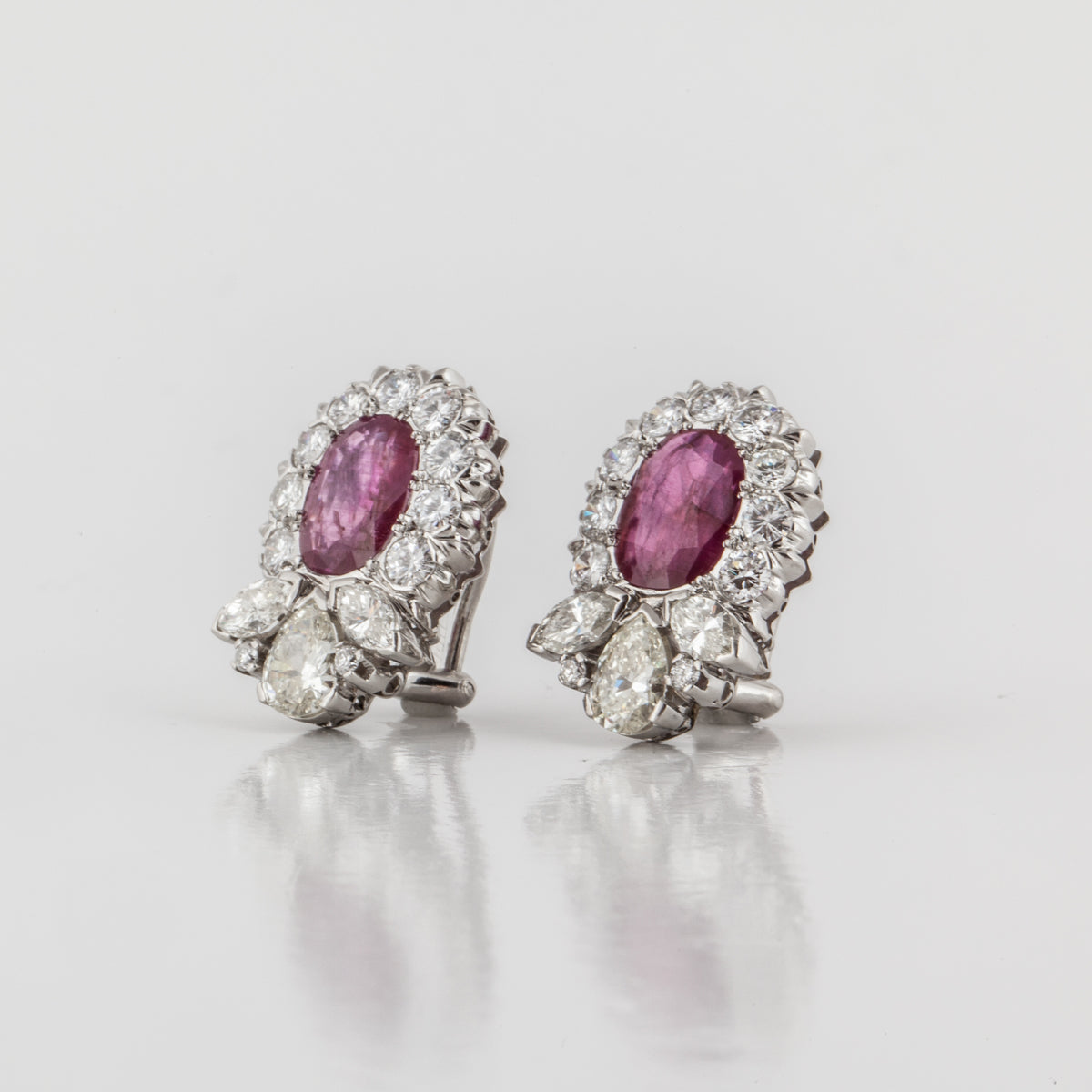 A pair of vintage earrings featuring oval rubies and round brilliant-cut, pear-shape, and marquise-cut diamonds, set in platinum. Circa 1980
