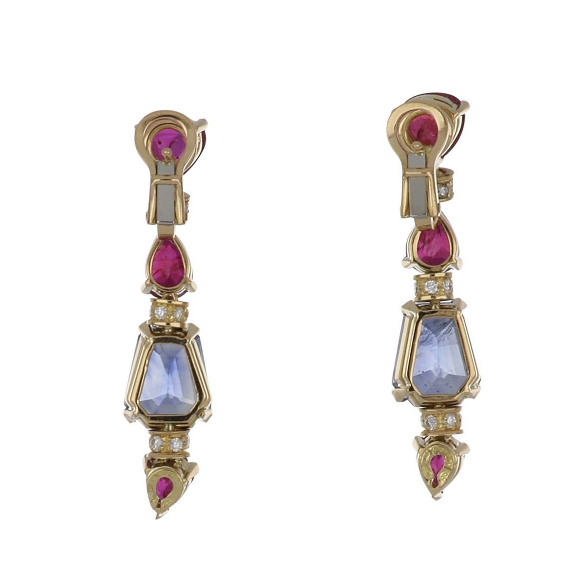 A pair of vintage Bulgari pear shape ruby and shield-cut sapphire earrings with diamonds set in 18K yellow gold. Circa 1980.