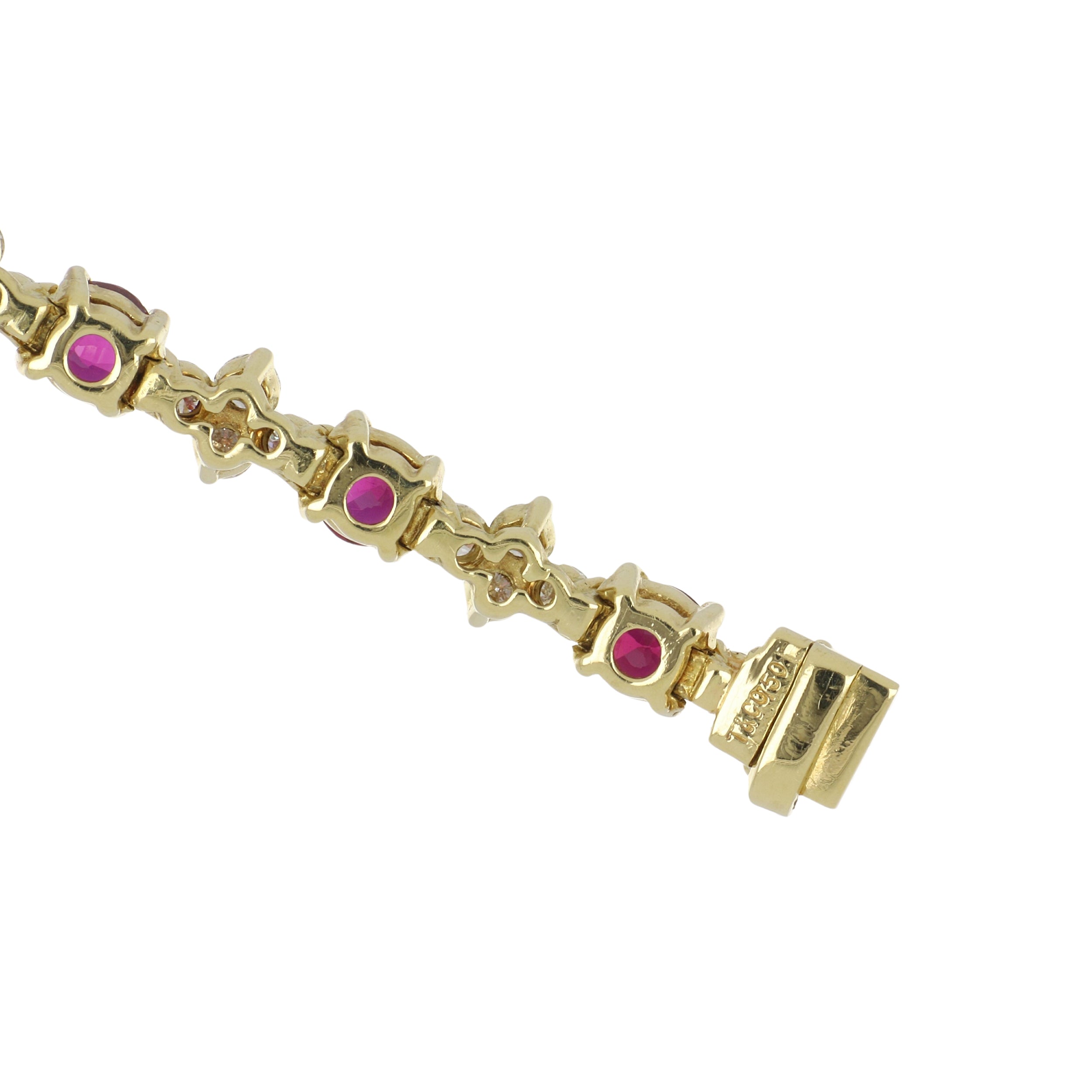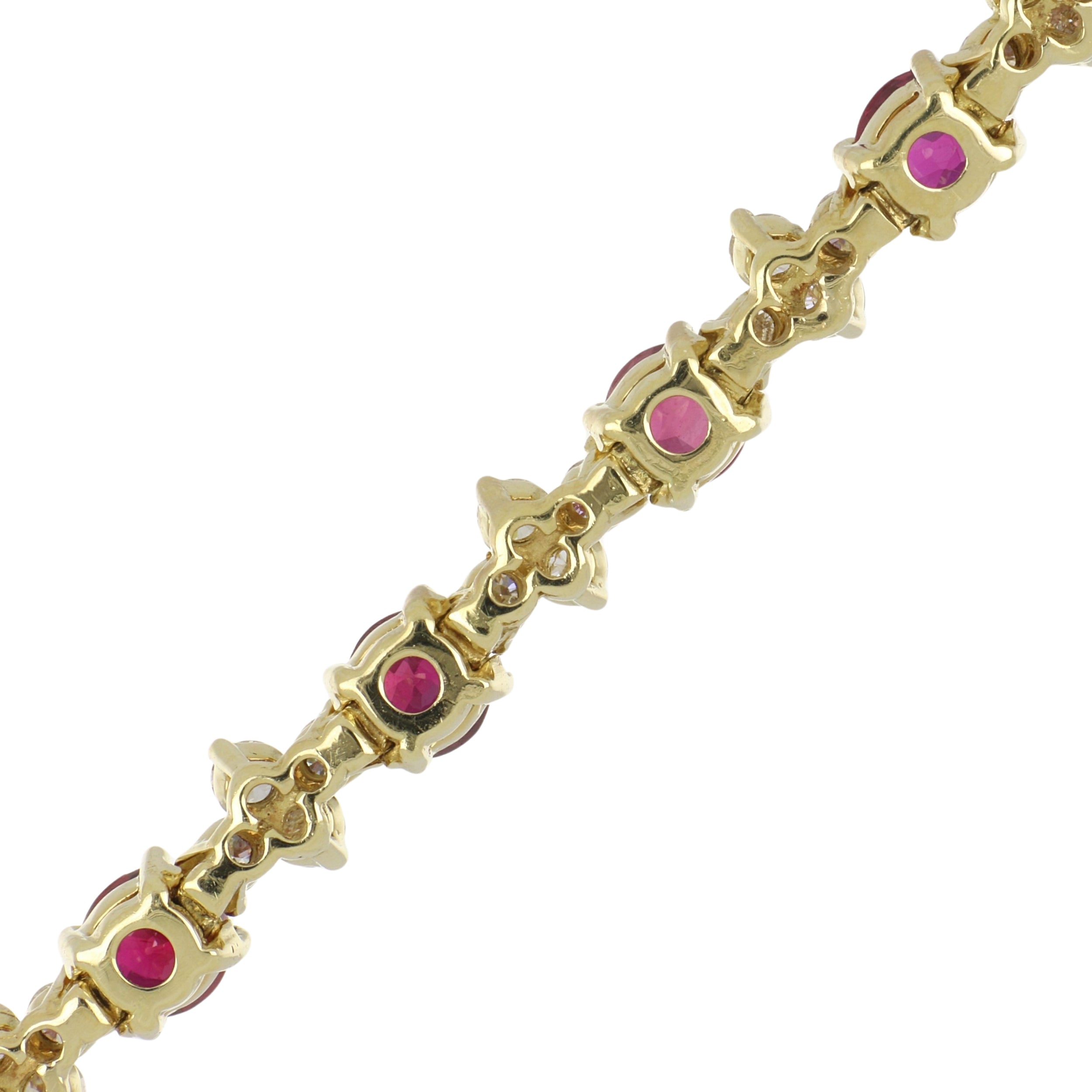 A vintage Tiffany & Co, alternating round-cut ruby and round brilliant-cut diamond link necklace set in 18K yellow gold. The necklace lays flat in one direction and curves in the other as to sit "upright" on the neck. Circa 1990.