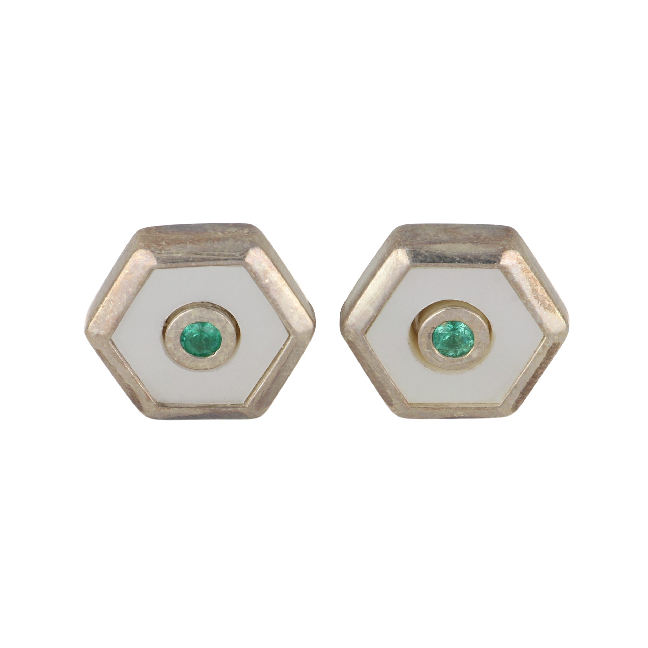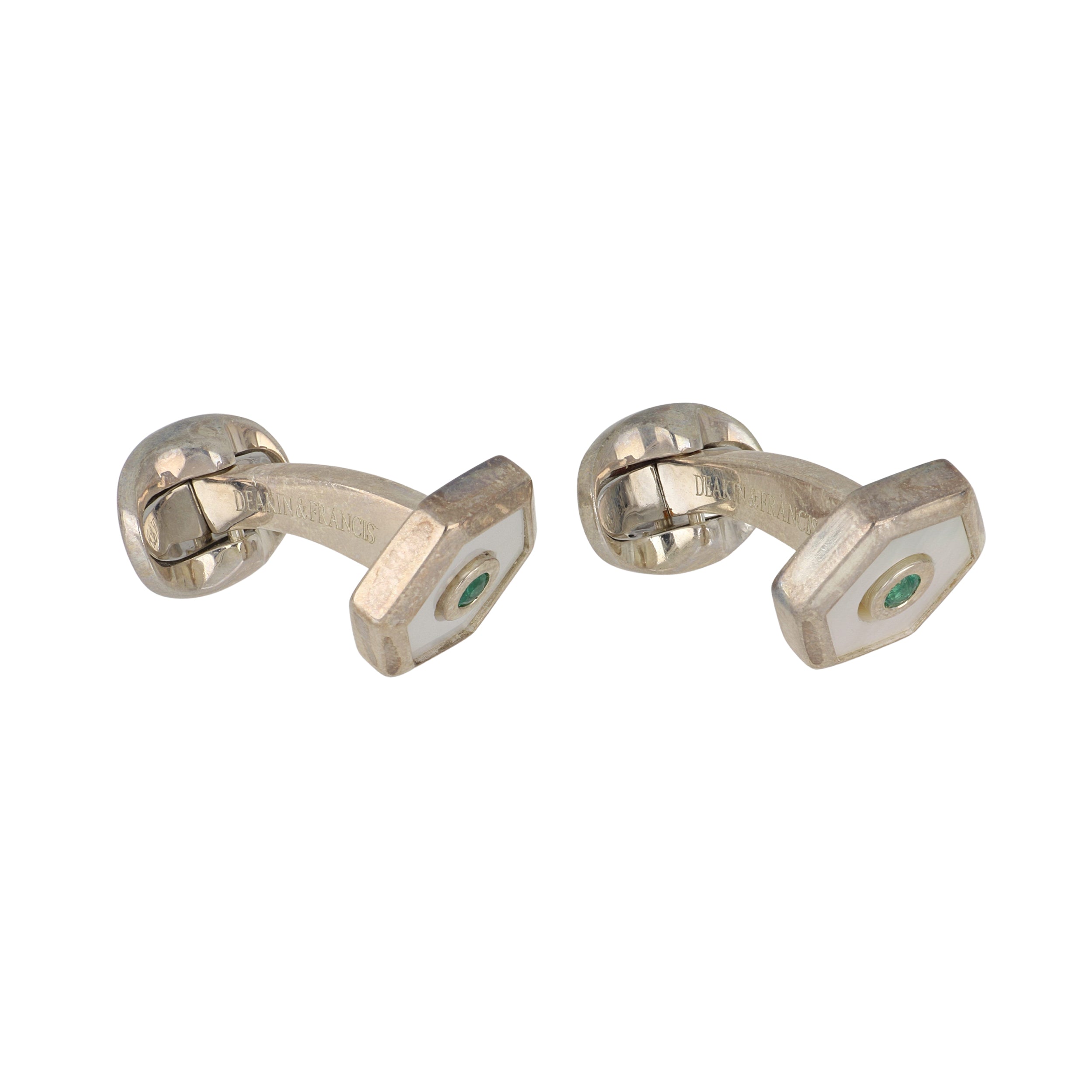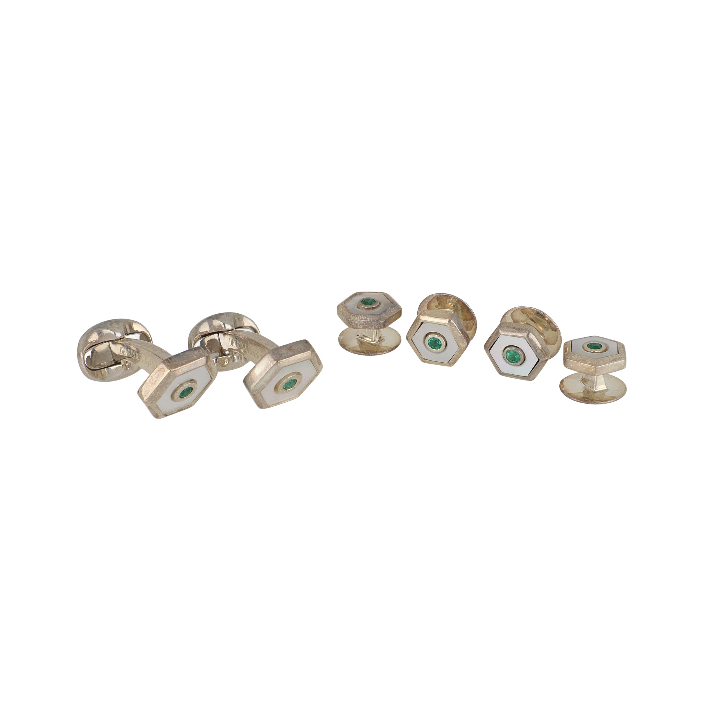 A Deakin & Francis sterling silver hexagonal mother of pearl and emerald dress set.
