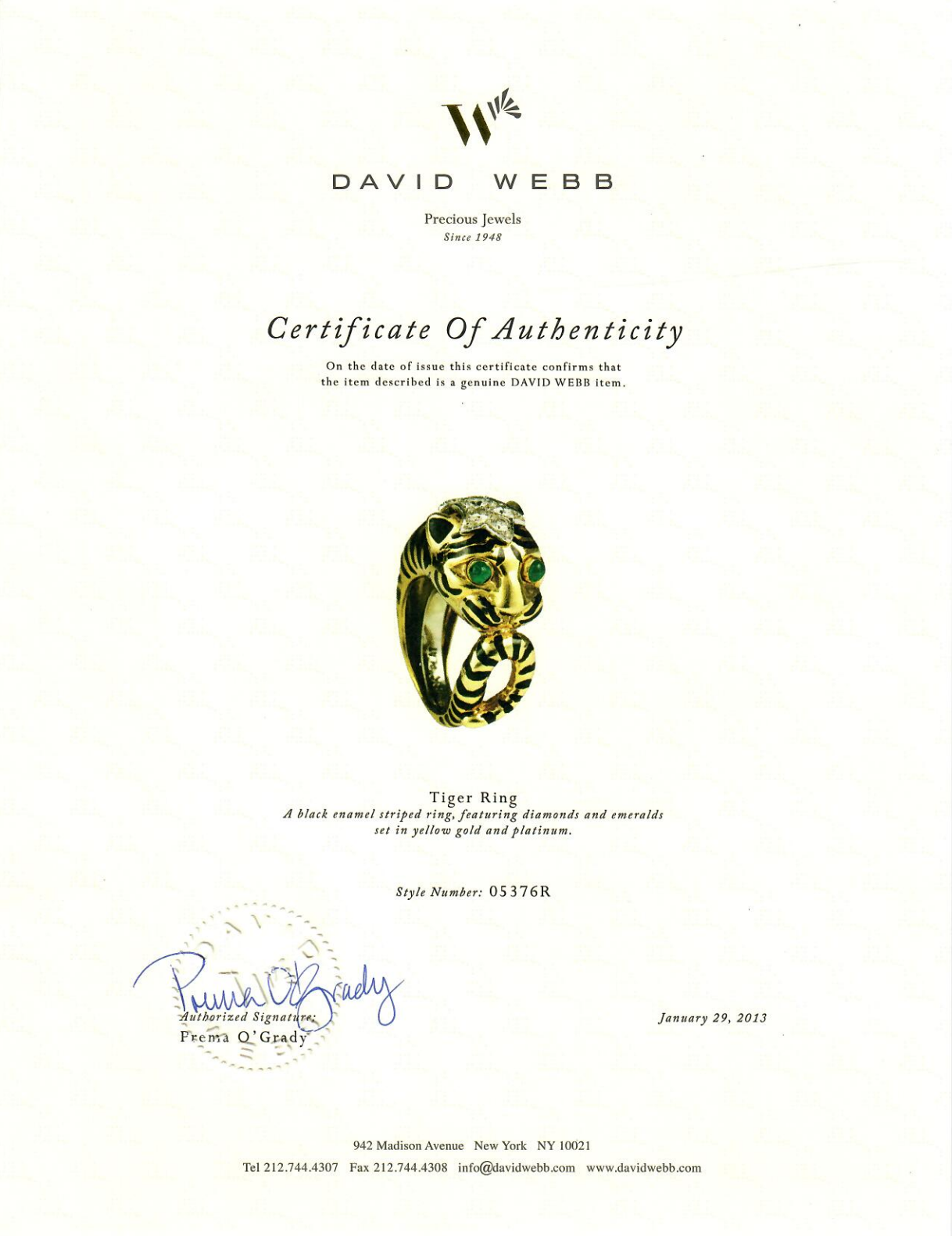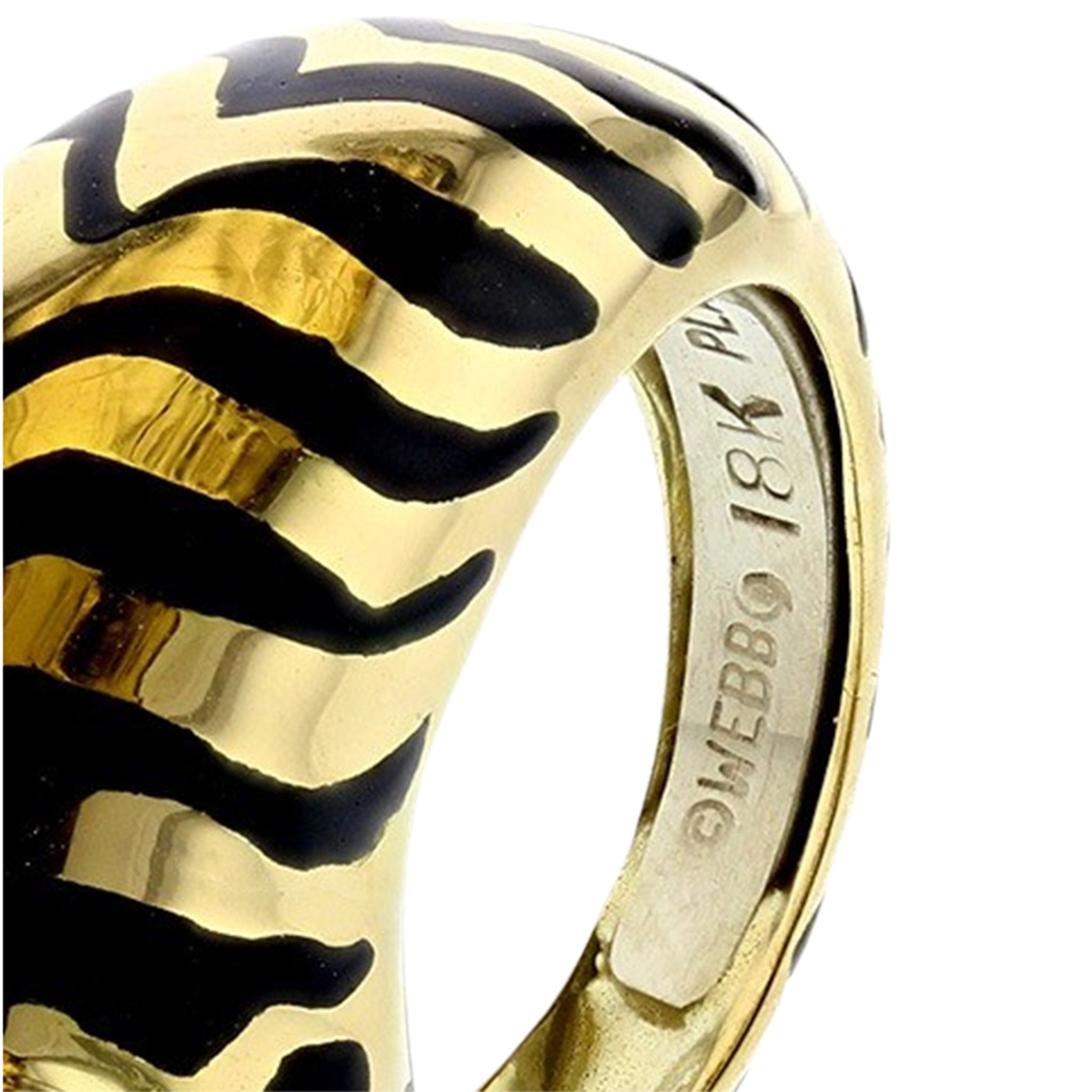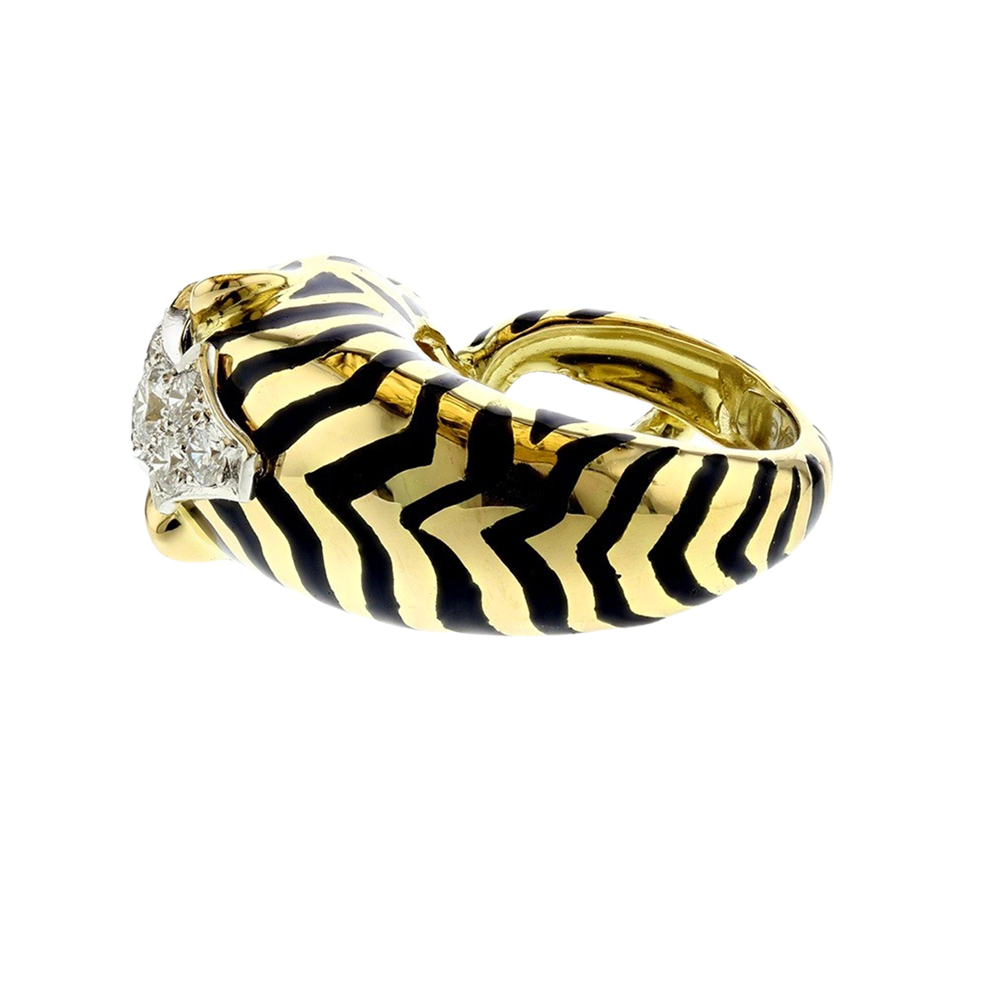 An estate David Webb enamel tiger ring with cabochon emerald eyes and round brilliant-cut diamonds set in, 18K yellow gold and platinum. Accompanied with the certificate of authenticity. Circa 1980s.