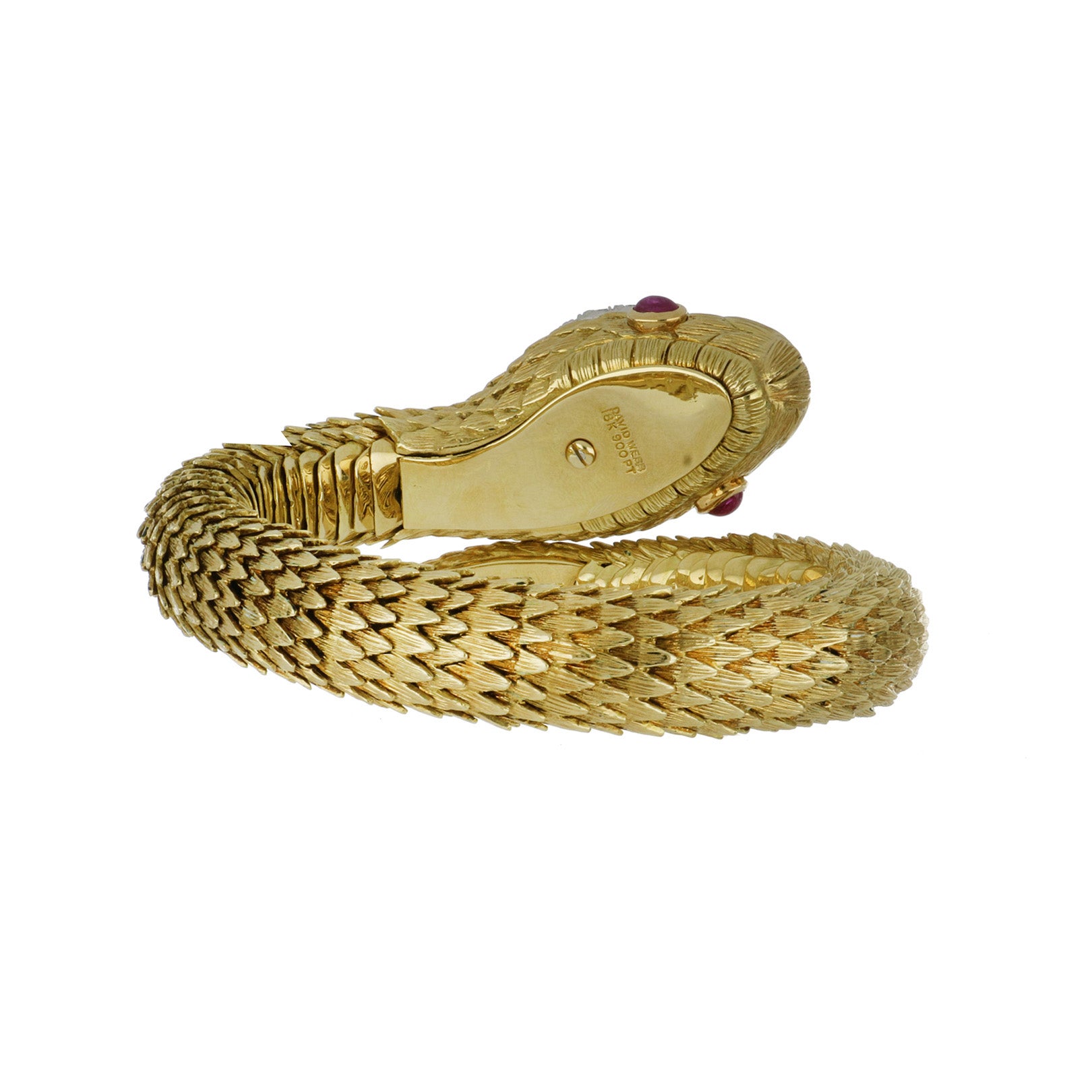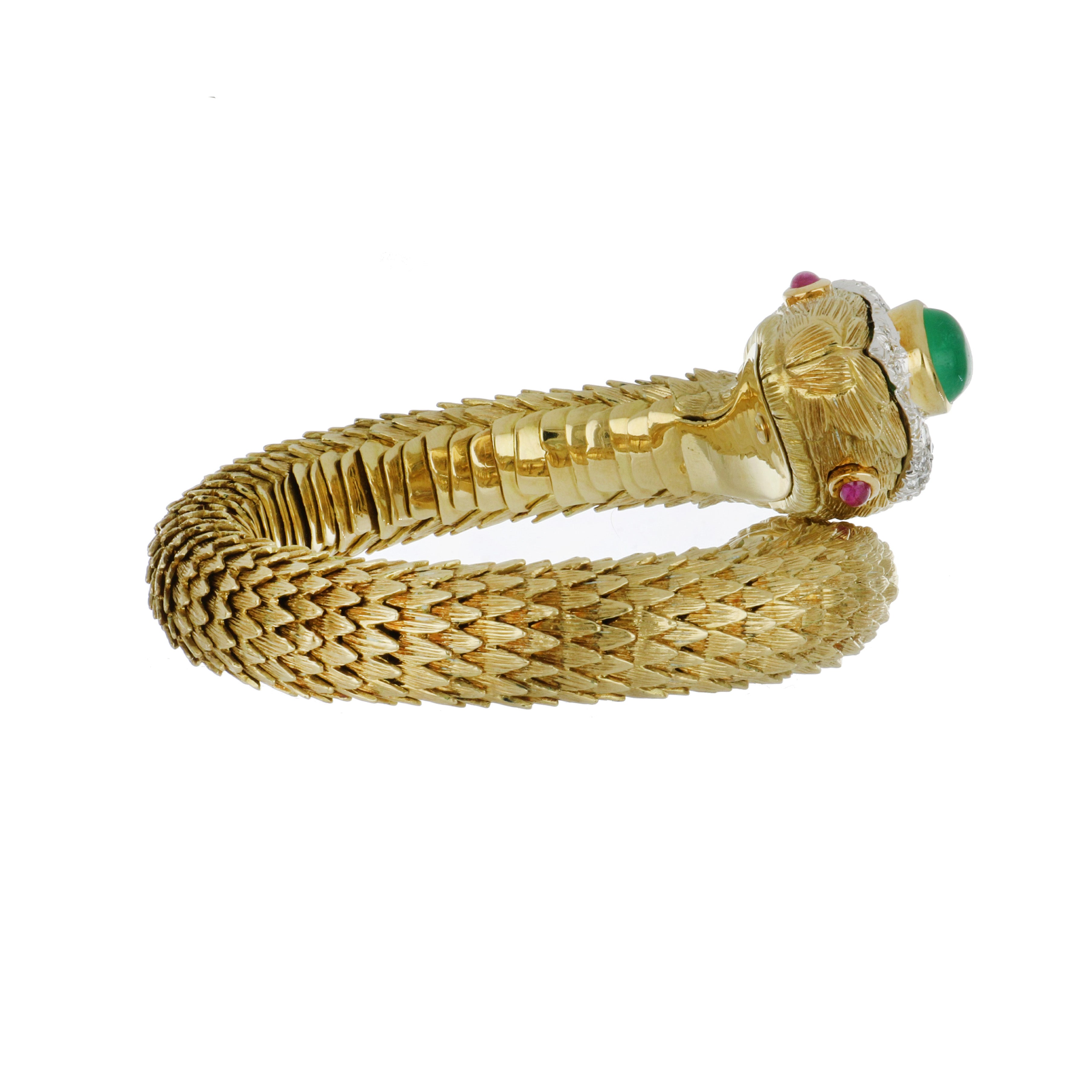 A vintage David Webb snake wrap bracelet from the Kingdom Collection. In 18K yellow gold and platinum, with a pear shaped emerald, oval cabochon-cut ruby eyes, and round brilliant-cut diamond accents. Circa 1990.