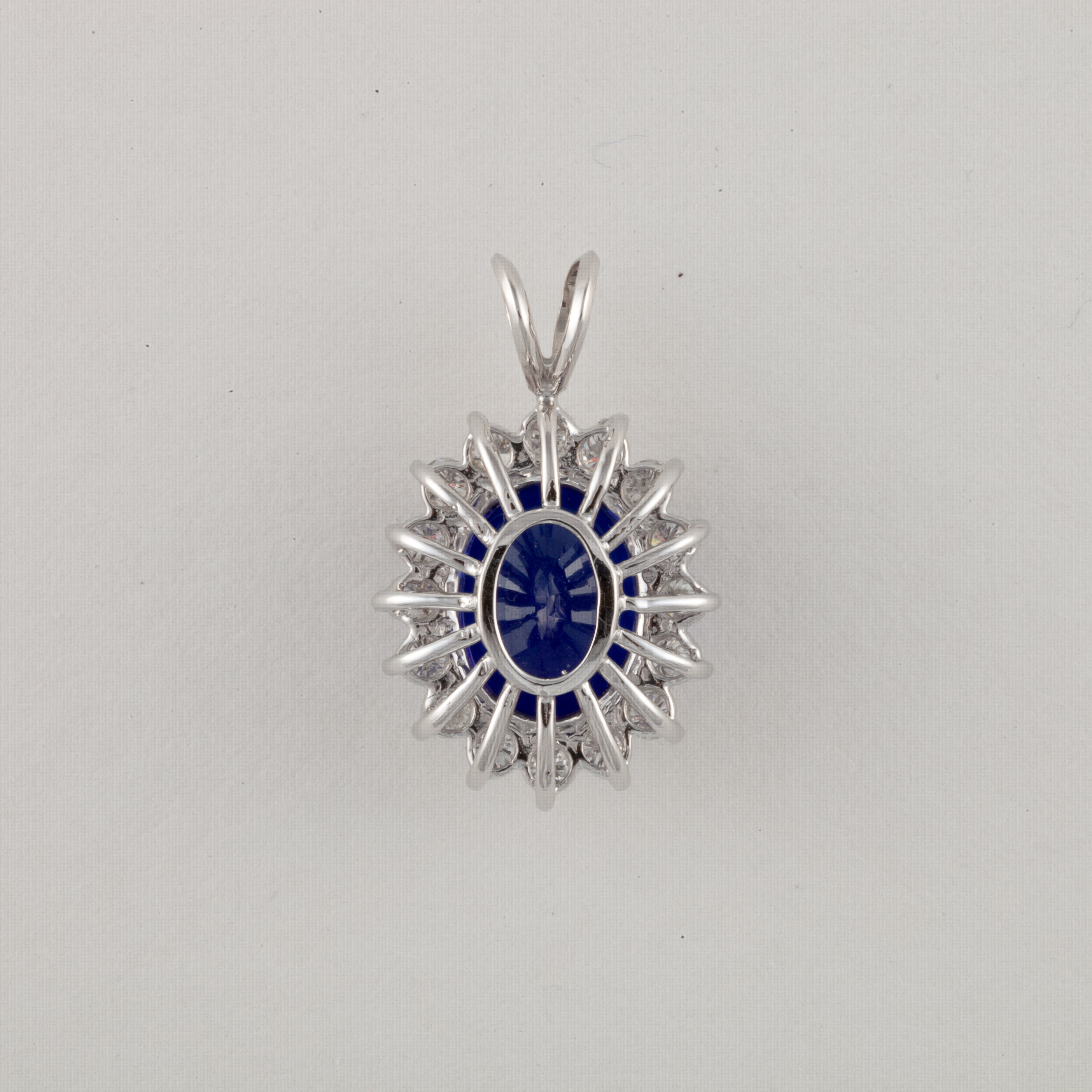 An estate oval-cut tanzanite pendant with a round-cut starburst halo, set in 18K white gold.