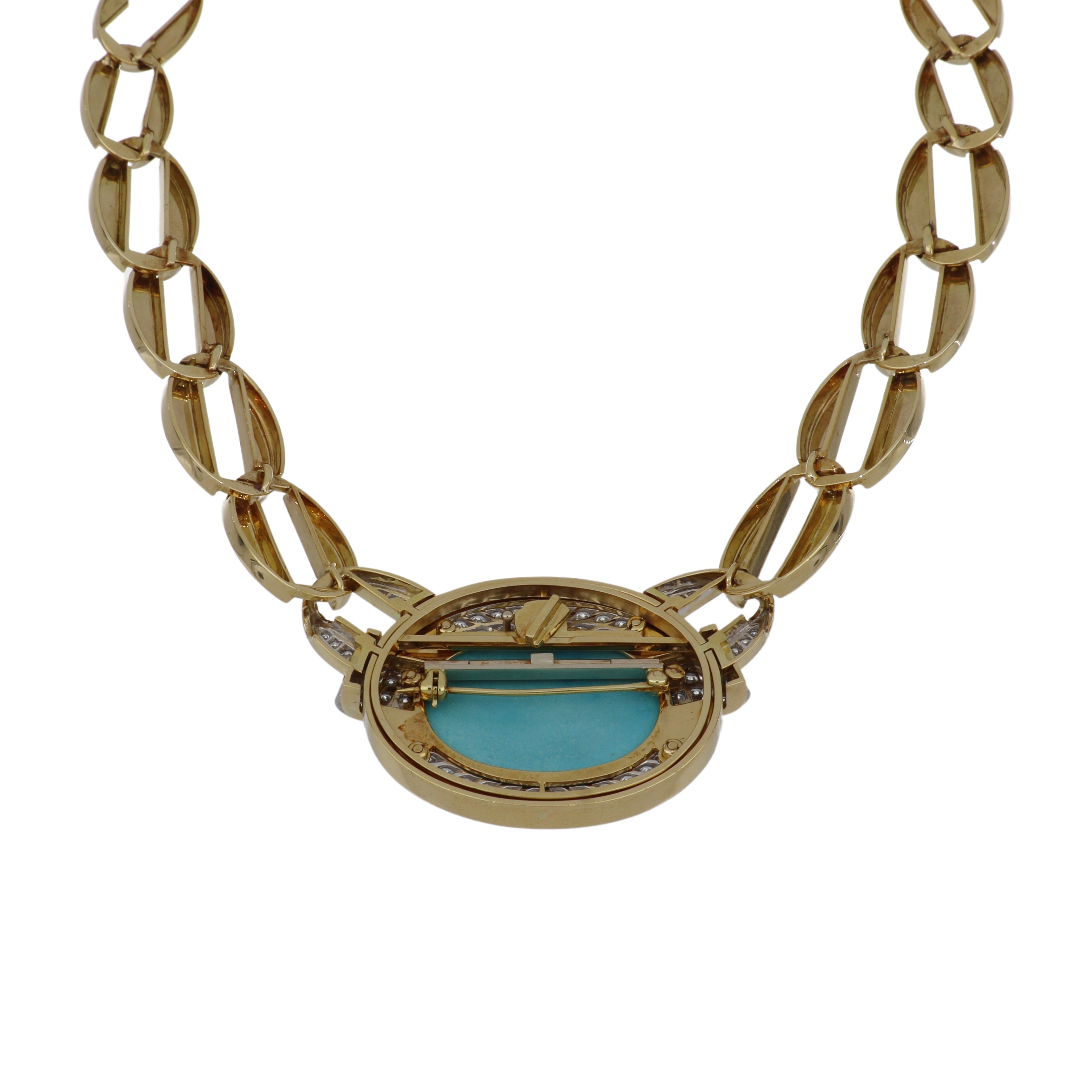 A vintage David Webb turquoise and diamond collar necklace with a cabochon turquoise centerpiece, framed by diamond details, set in 18K yellow gold. Centerpiece can be removed and worn as a brooch. From the Colors Collection.