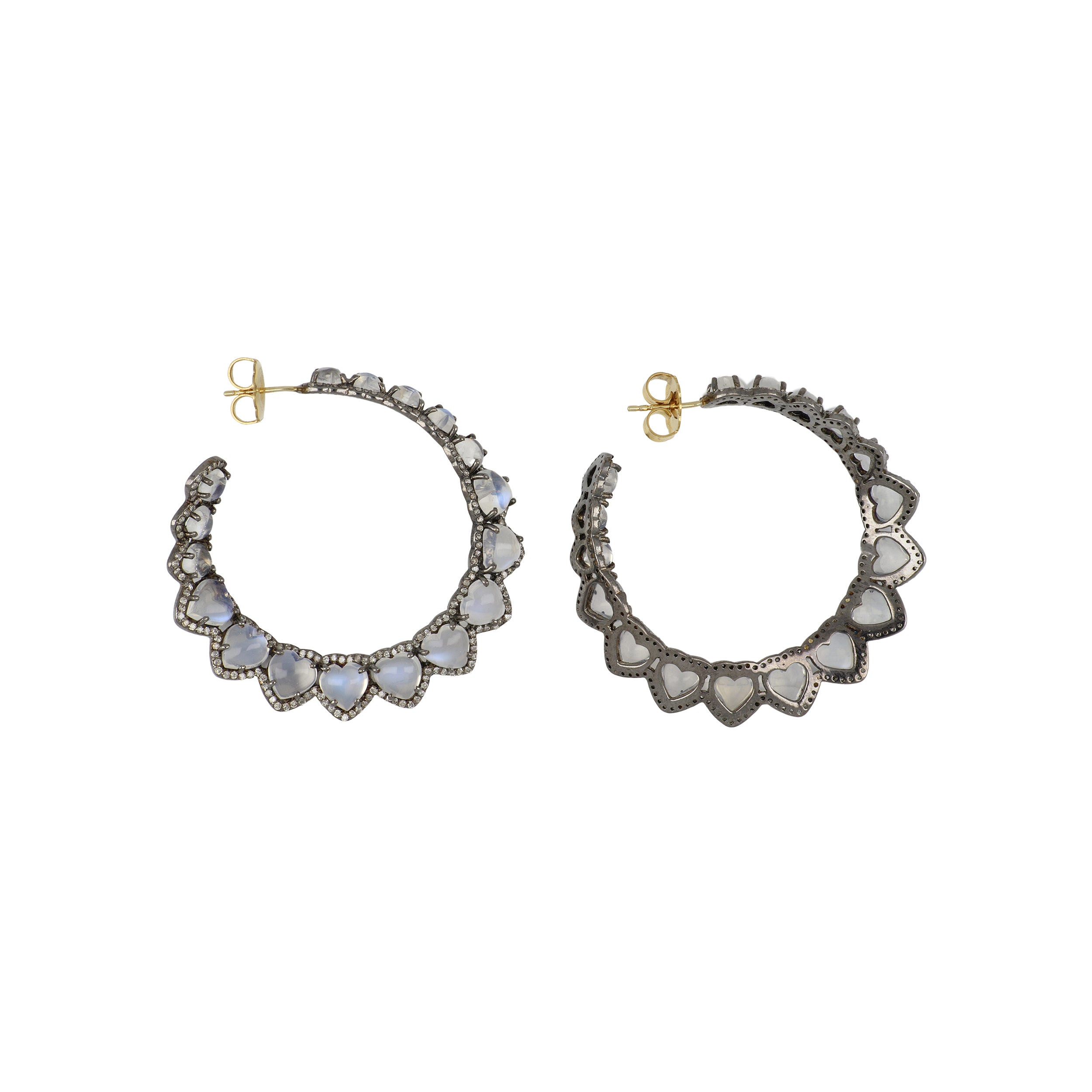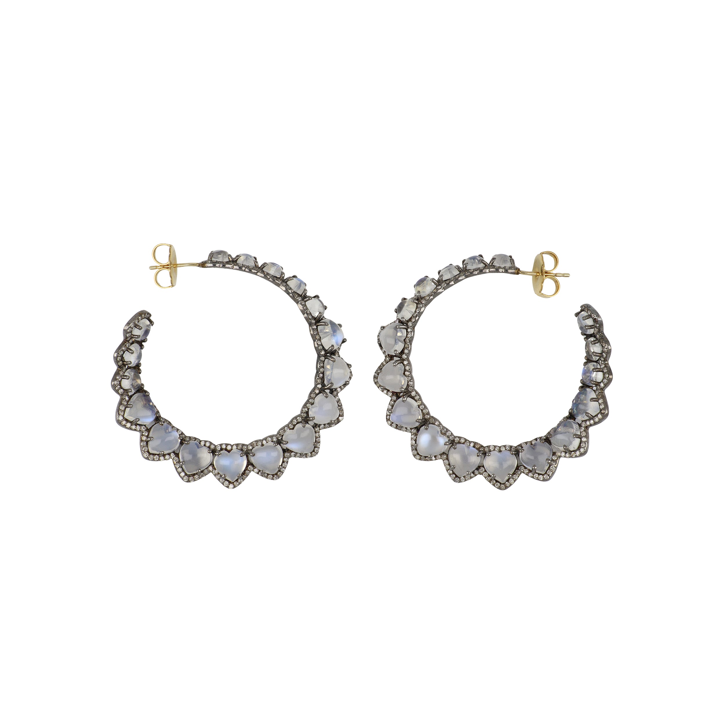 A pair of heart shape moonstone hoop earrings with round diamond borders, set in sterling silver.