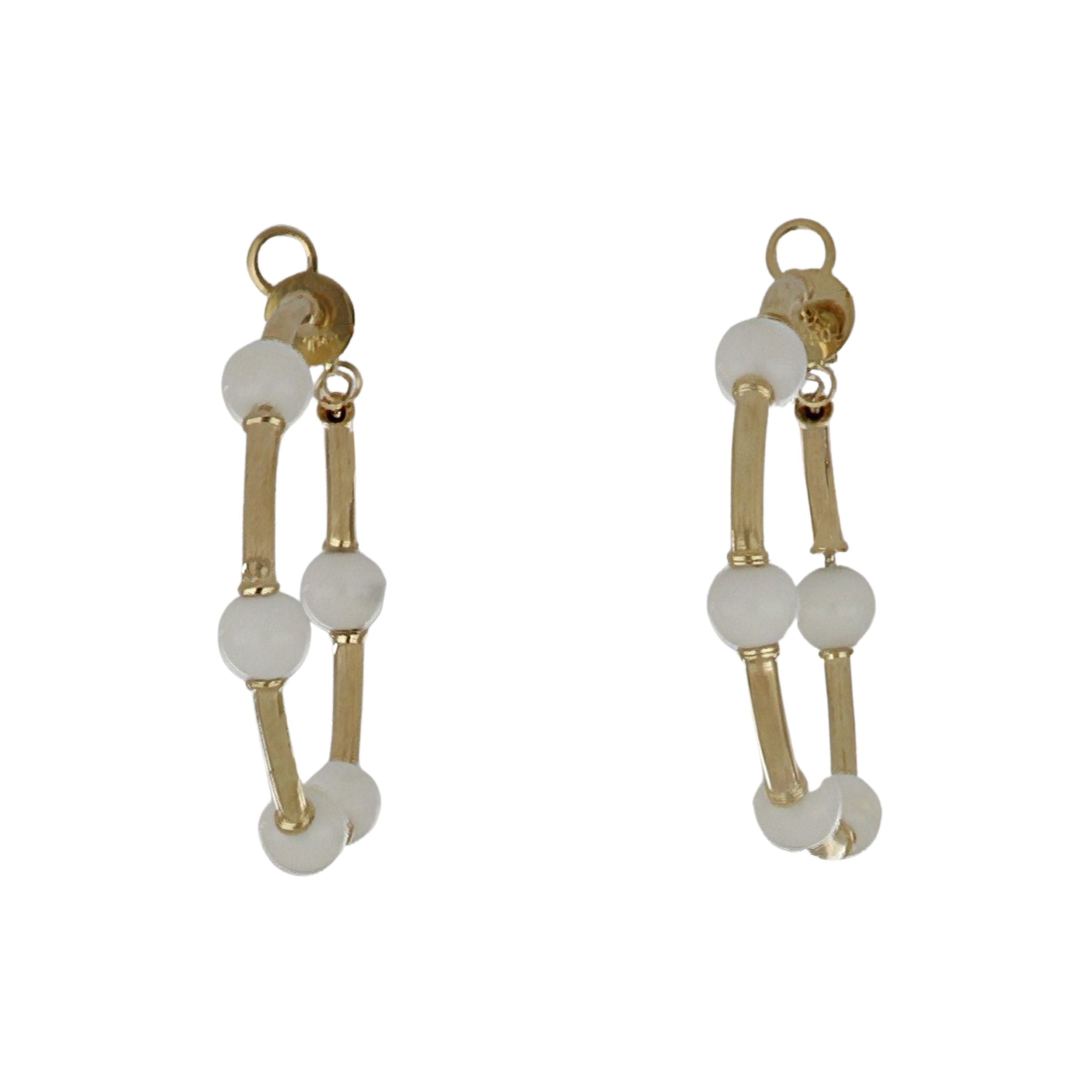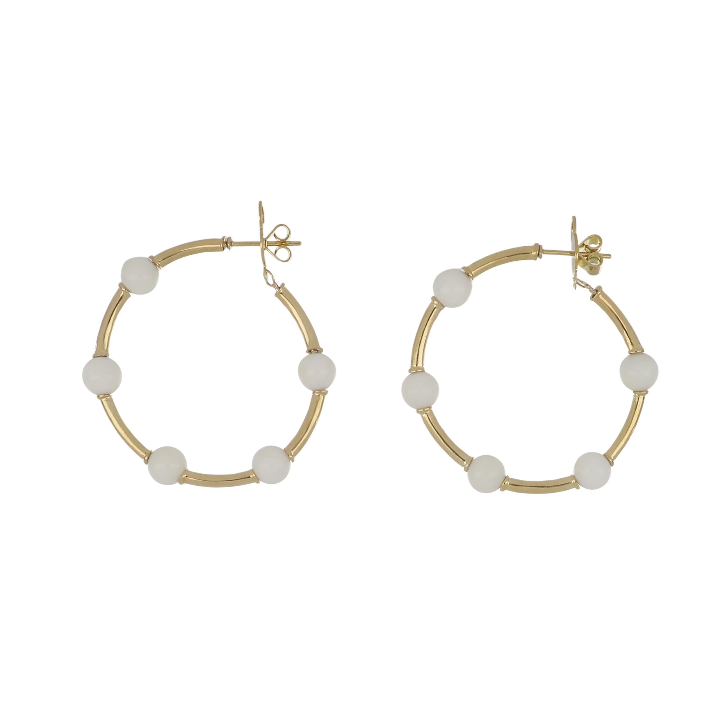 A pair of white coral bead hoop earrings set in 18K yellow gold.