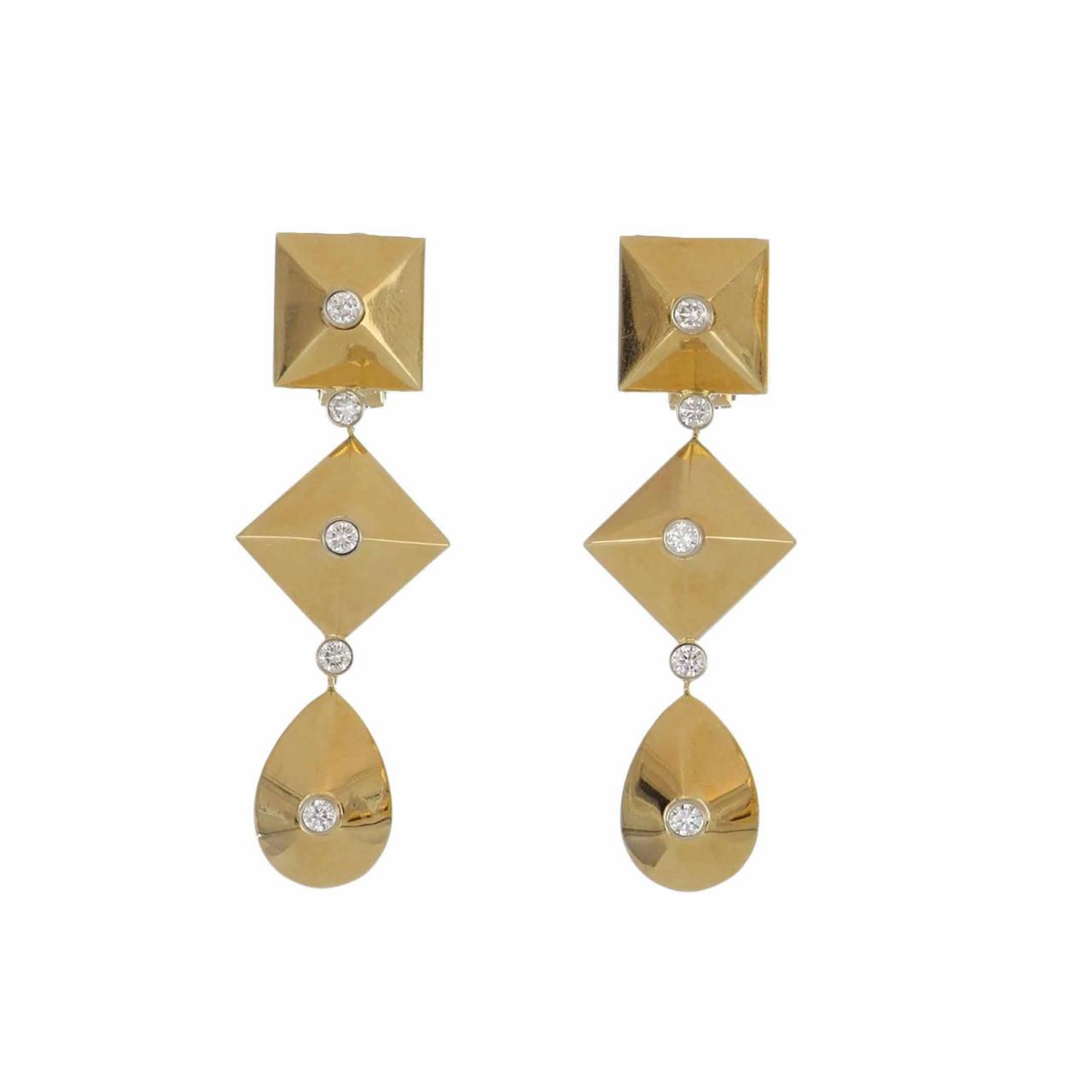 A new pair of Aletto Brothers, multi shape pyramid drop earrings set with round diamonds in 18K yellow gold.