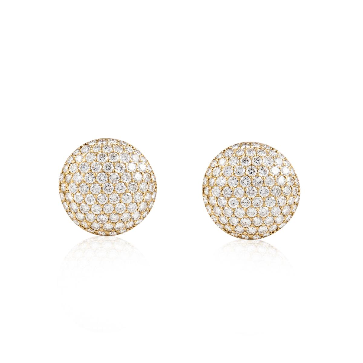 A pair of vintage pave round brilliant-cut diamond button earrings, set in 18k yellow gold. Circa 1990.