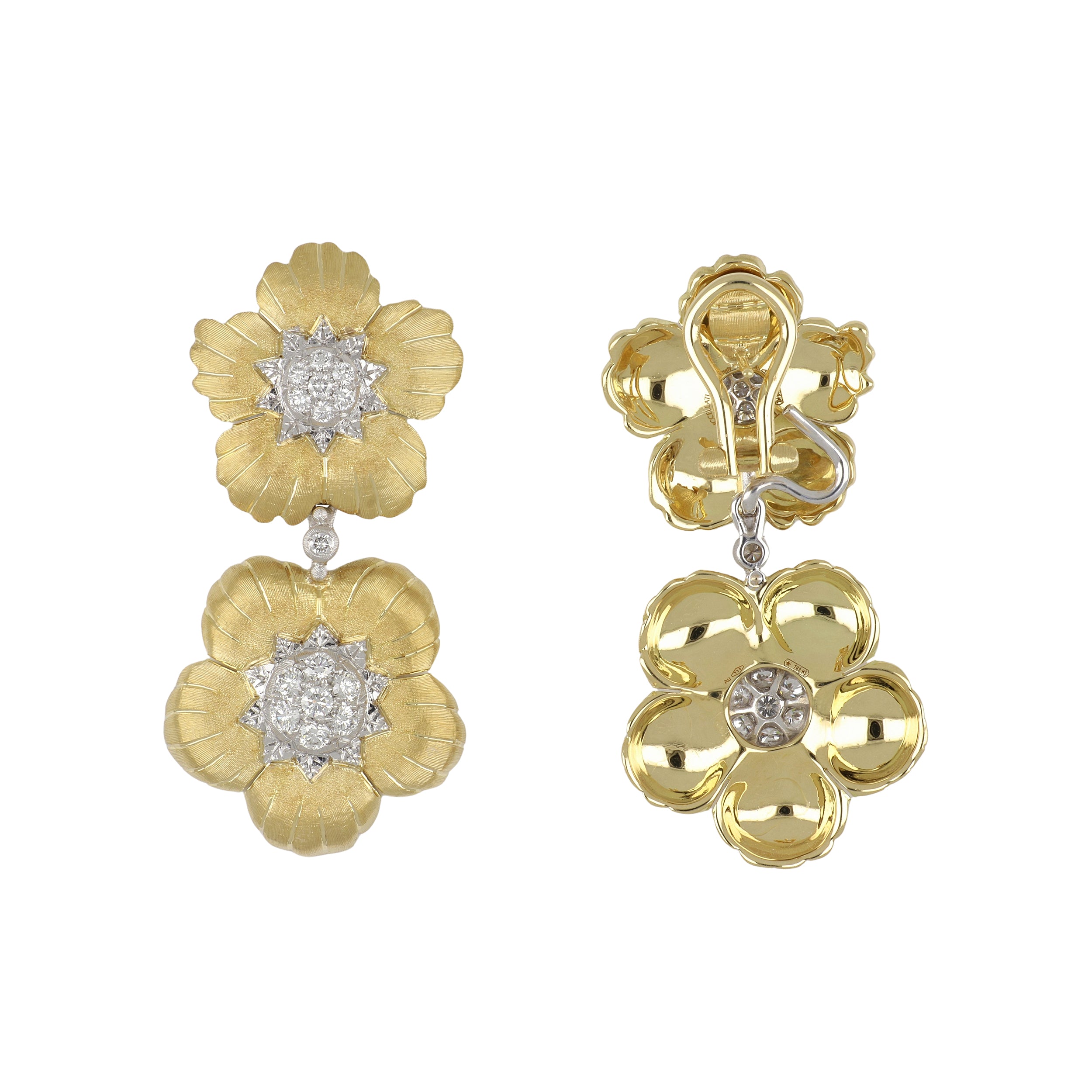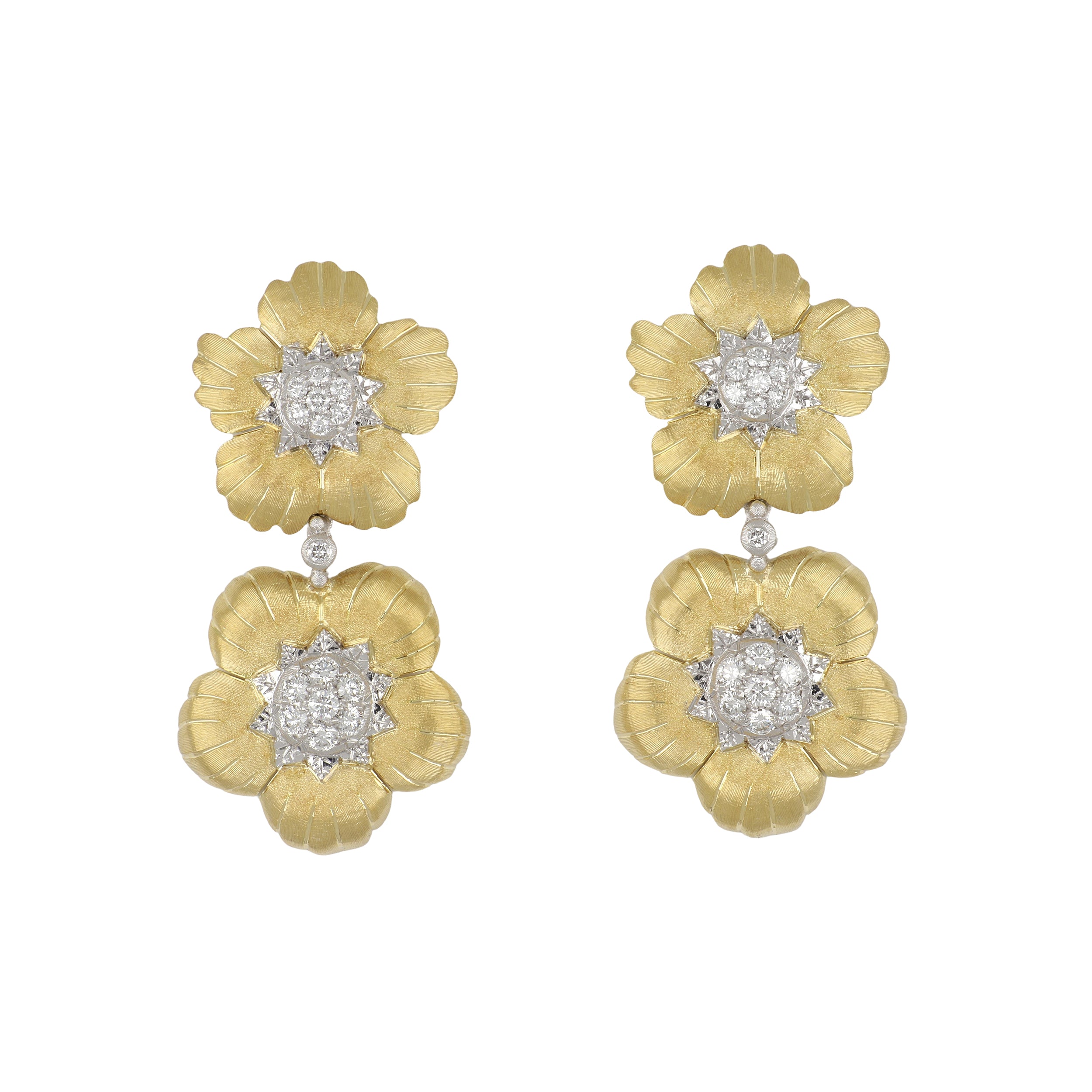 A pair of Buccellati Daphne double floral pendant earrings with diamonds, crafted in 18K yellow and white gold.Official RetailerDiamonds: 1.15 total carat weightLength: 2 inches