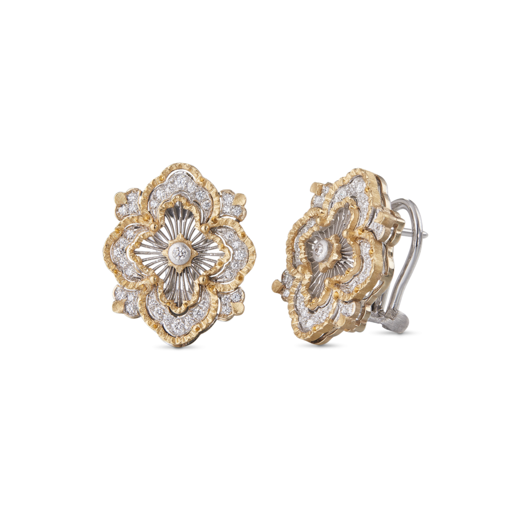 A pair of Buccellati Opera Tulle Premium Orrechini earrings in 18K yellow and white gold with diamonds.