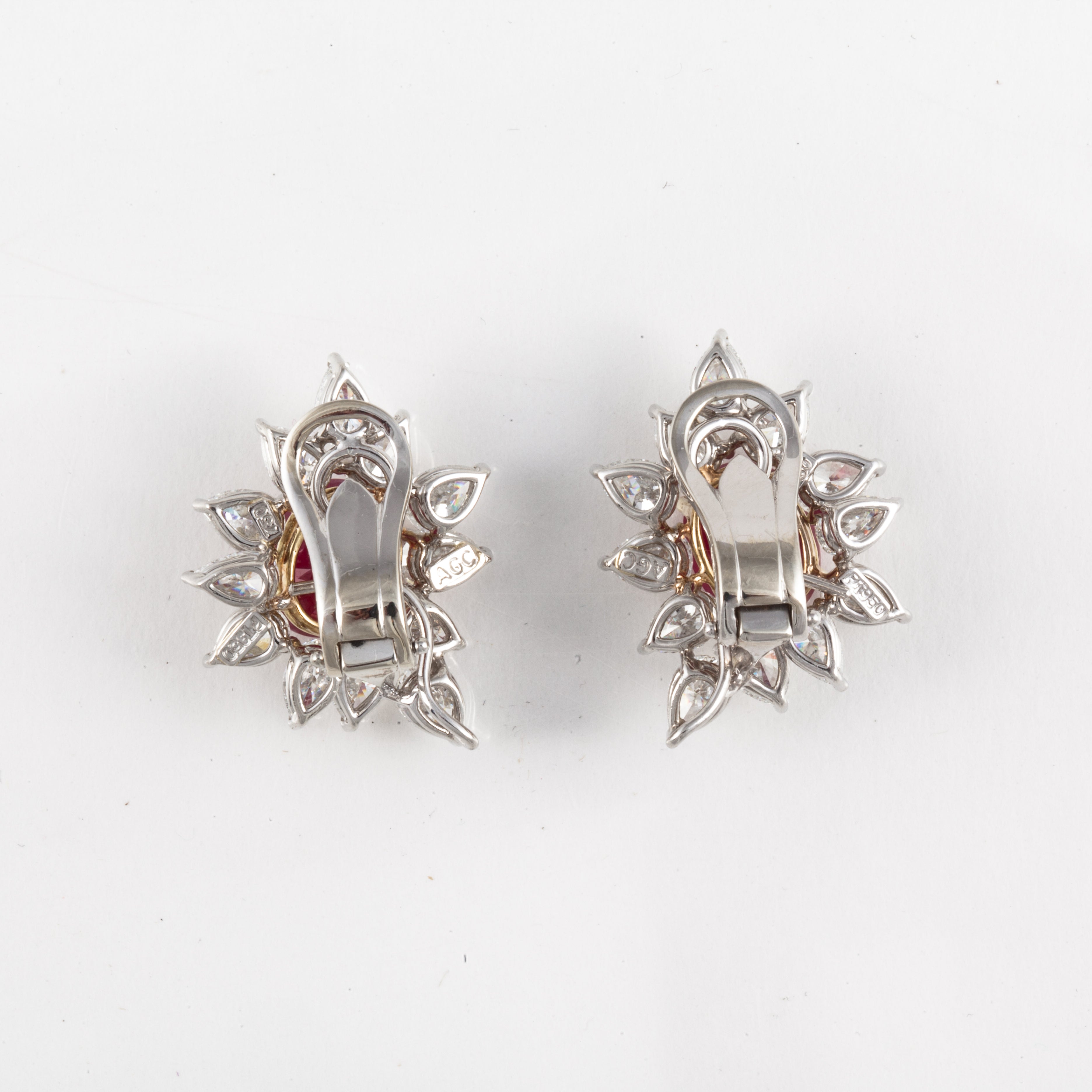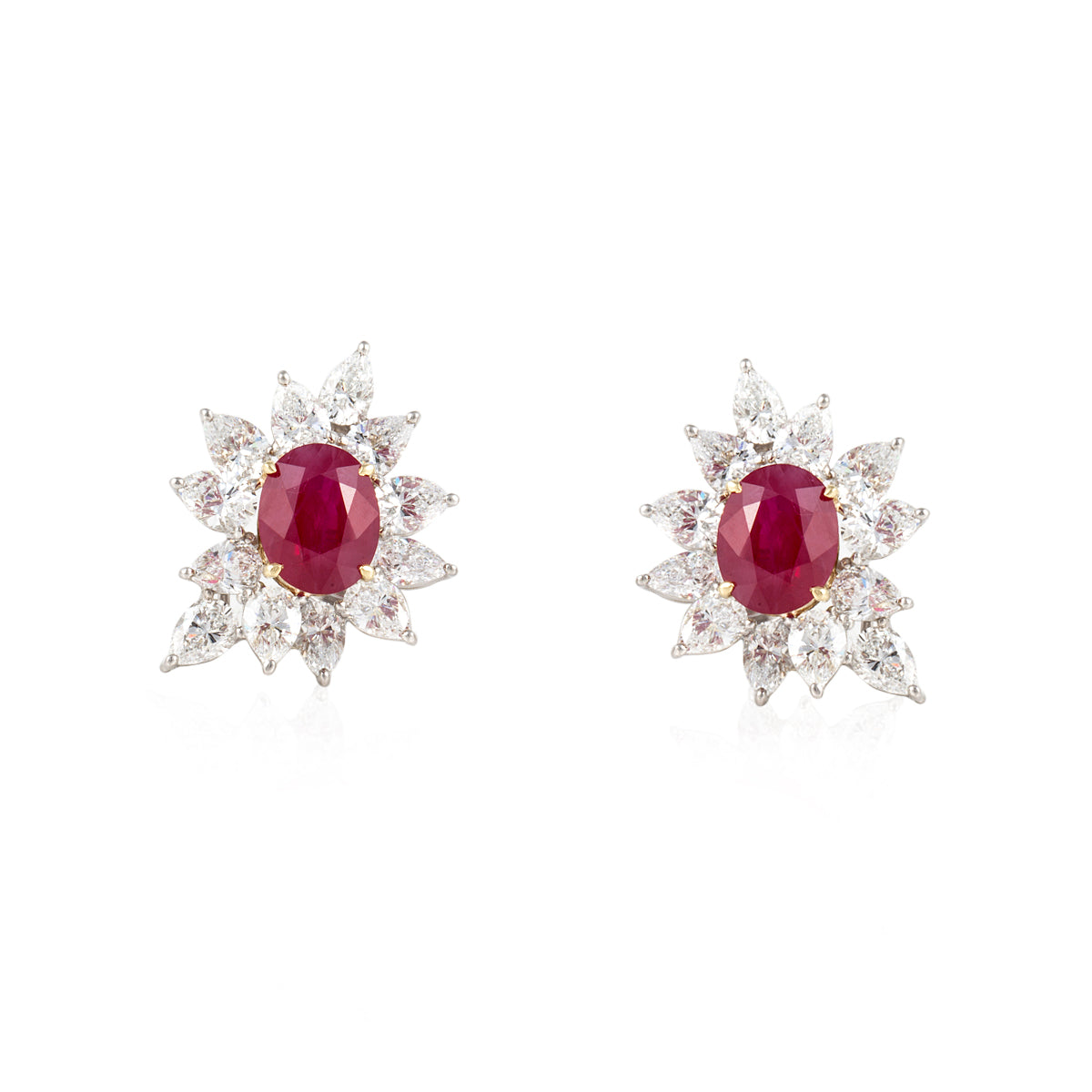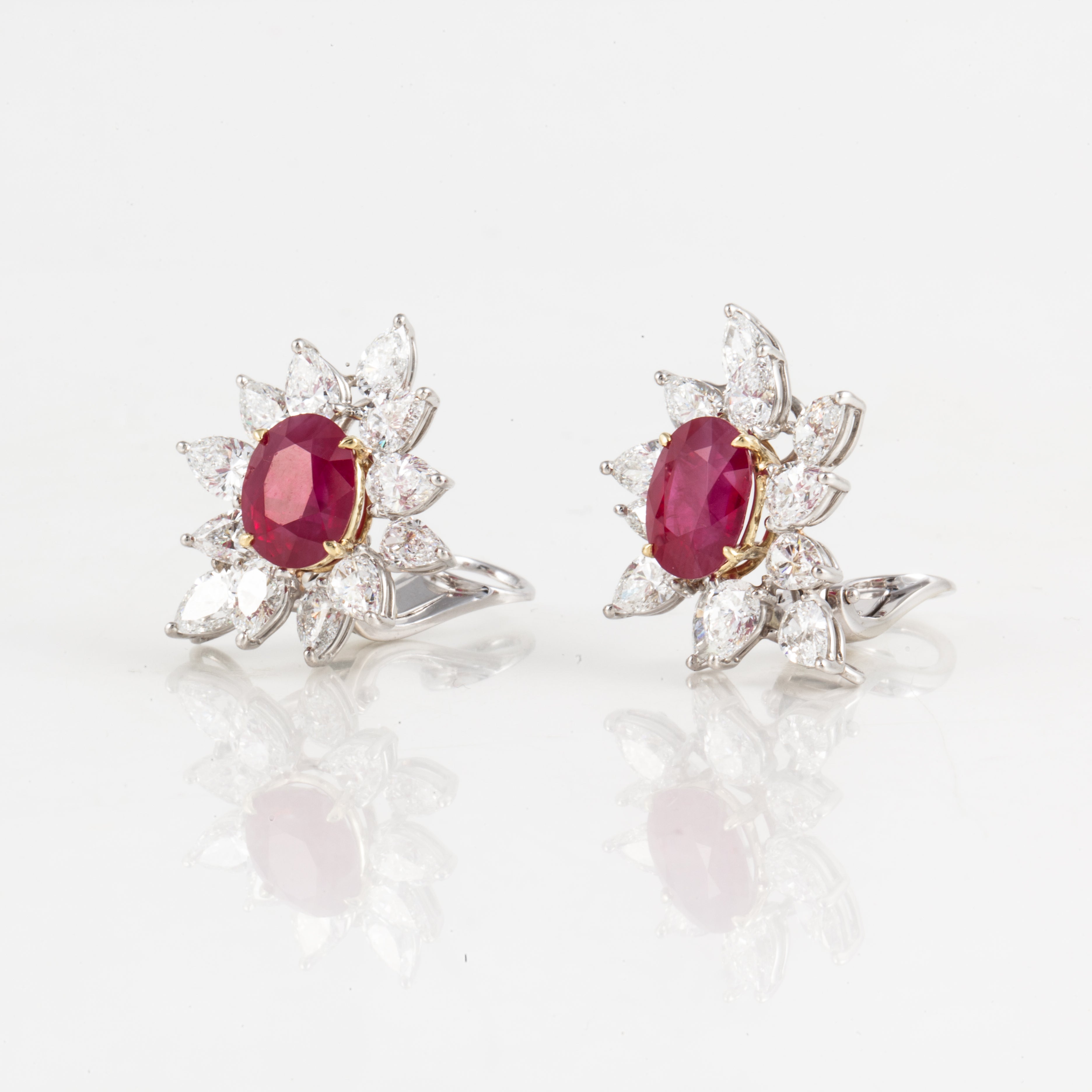 A pair of estate cluster-style earrings featuring oval-cut Burmese rubies accented by pear shaped diamonds, set in platinum and 18K yellow gold.