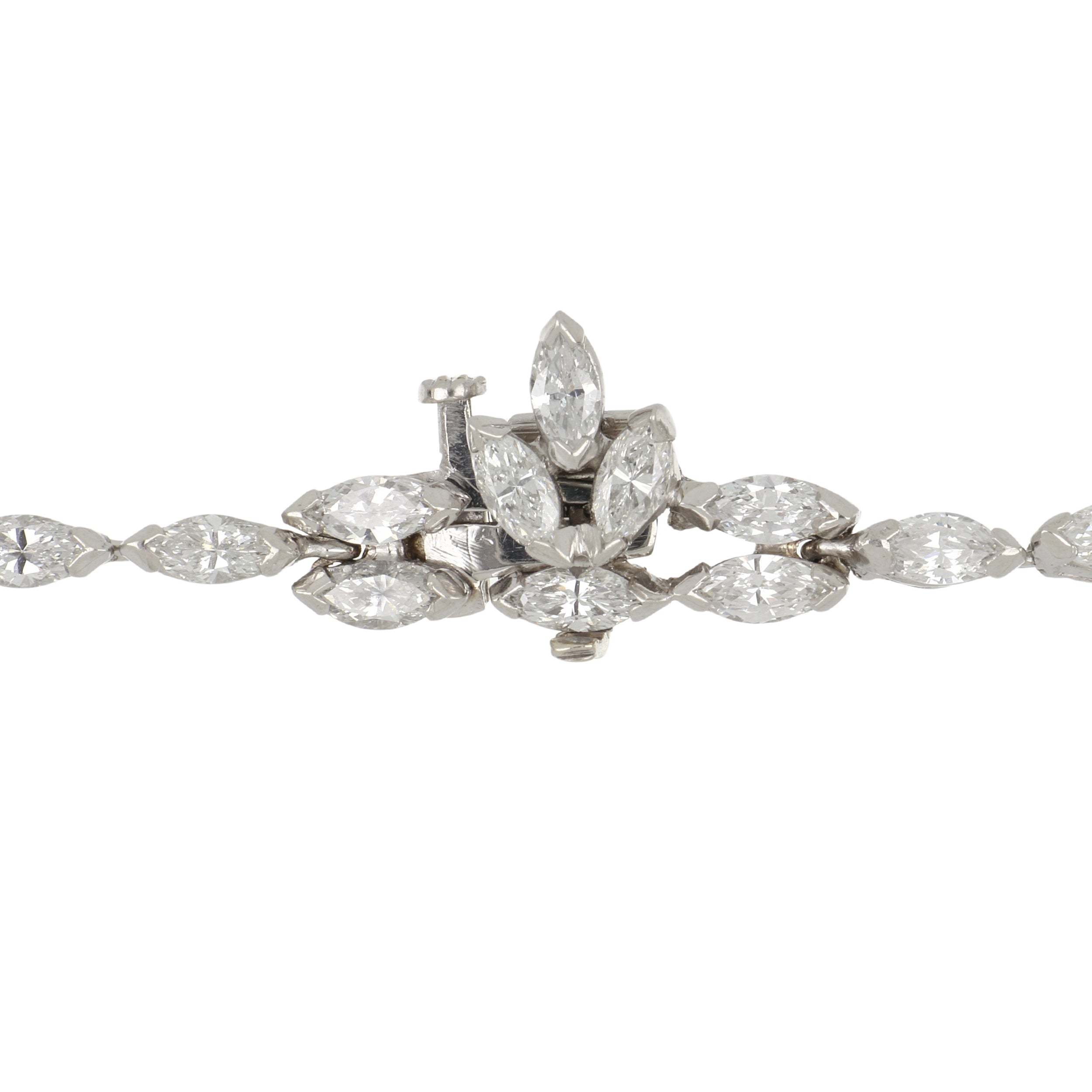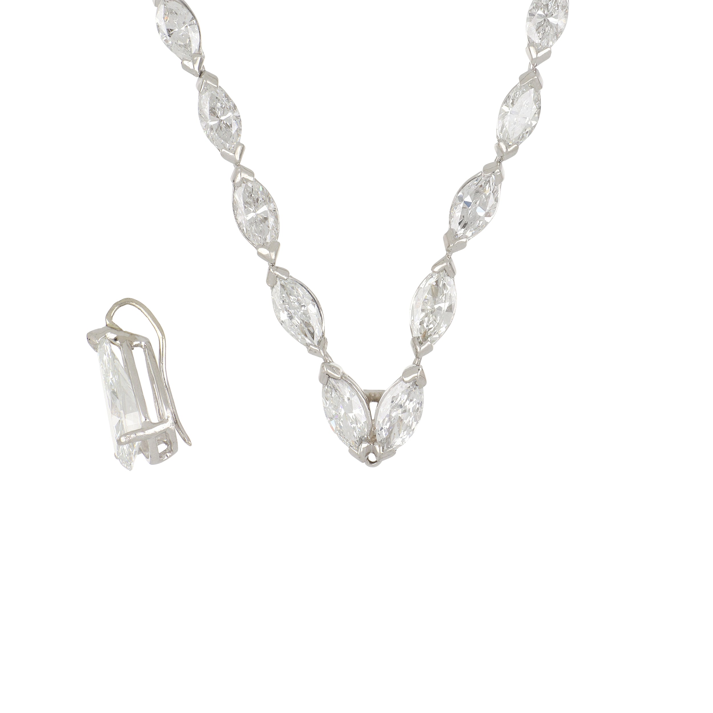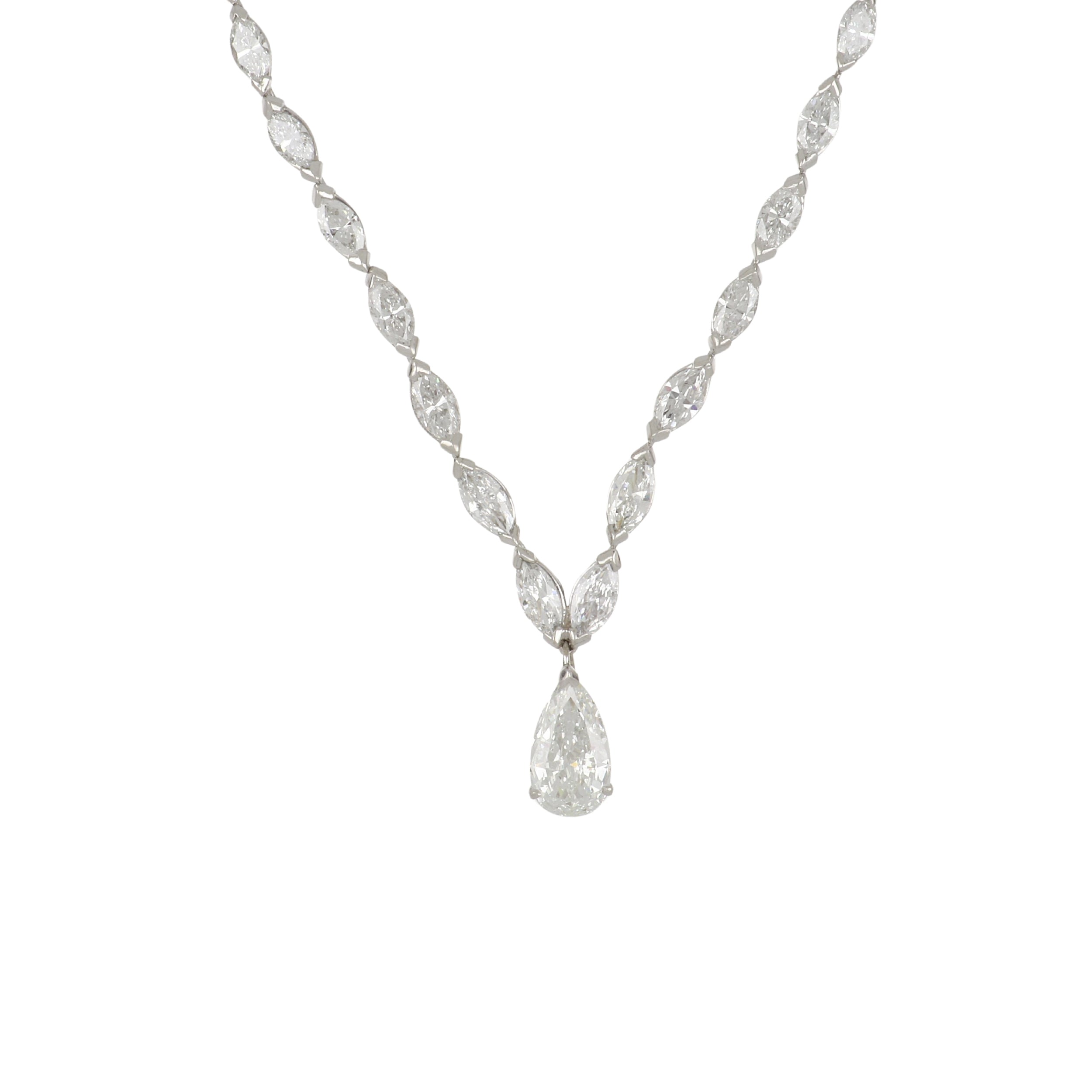 A vintage marquise brilliant-cut diamond riviera necklace set in platinum, with a detachable pear shape pendant. Circa 1970.