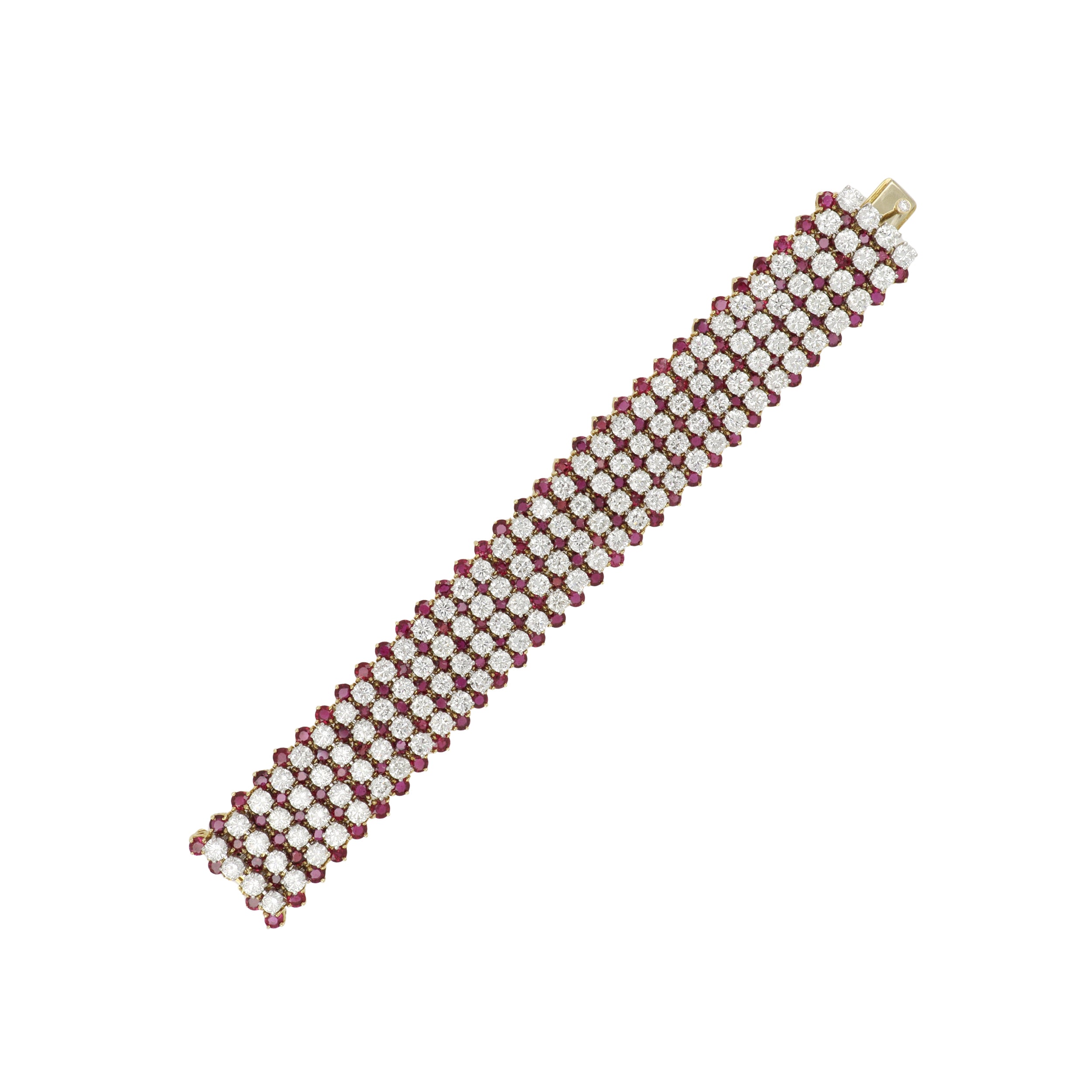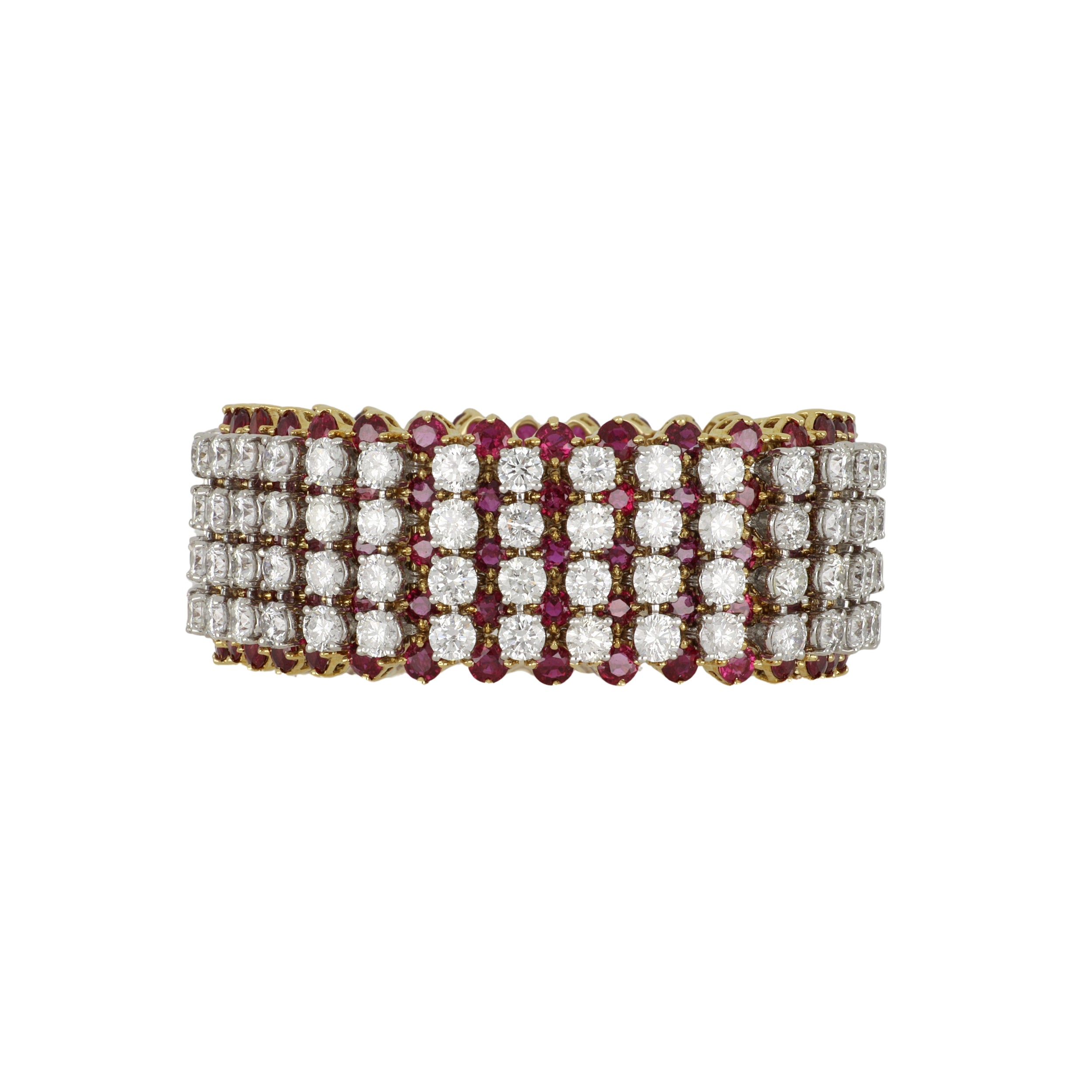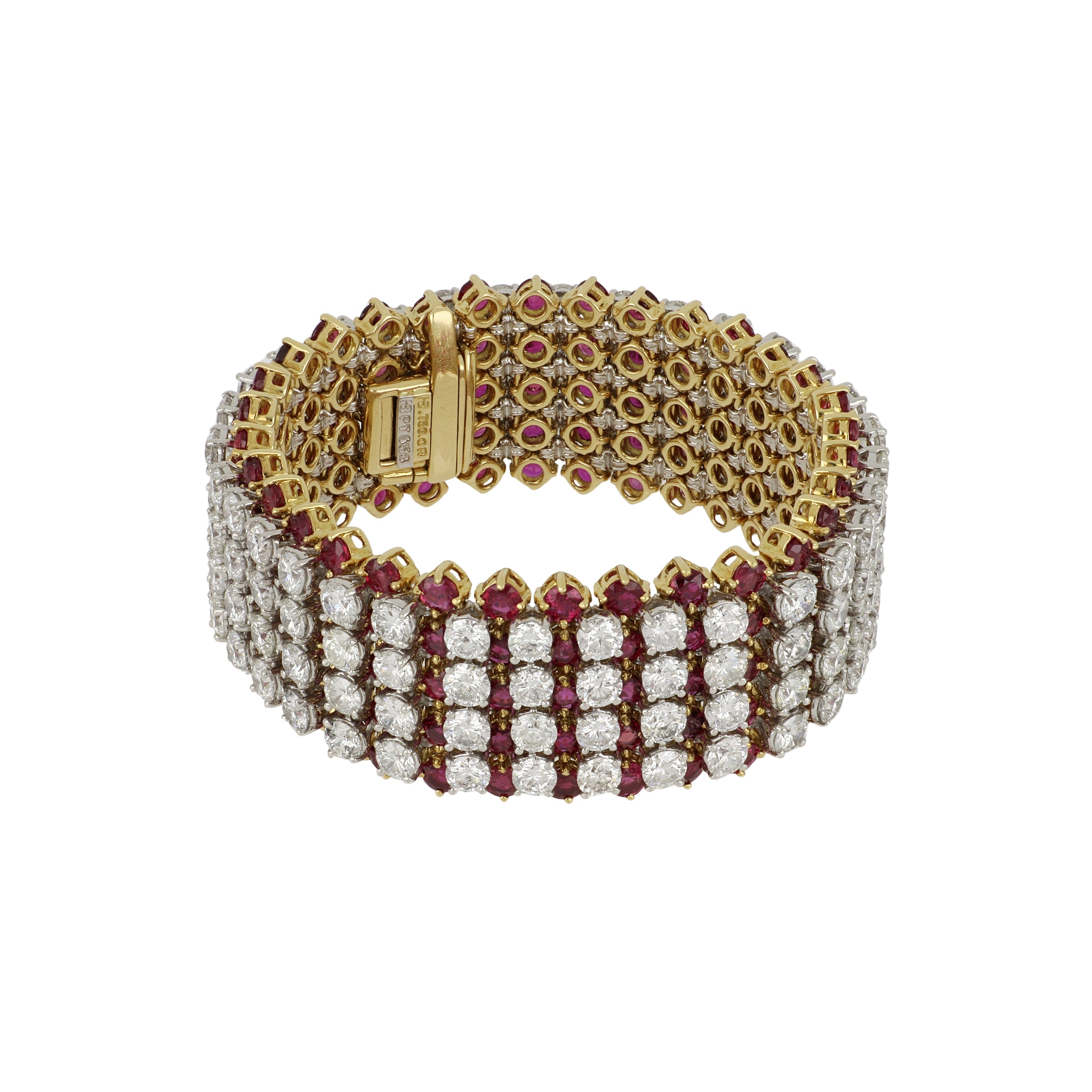 A vintage Hammerman Brothers wide round brilliant-cut diamond bracelet stacked on rubies, set in platinum and 18K yellow gold. Circa 1990.