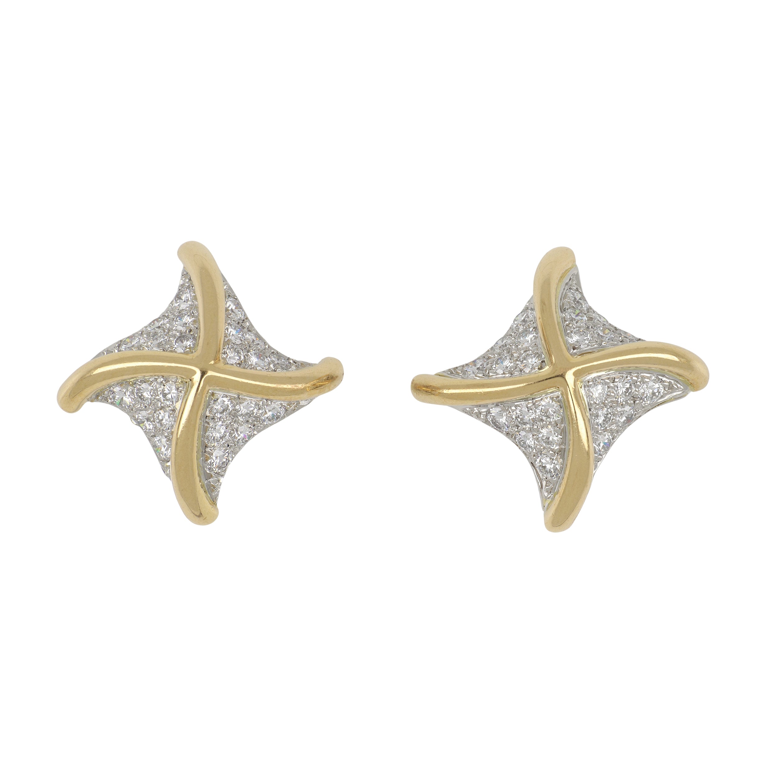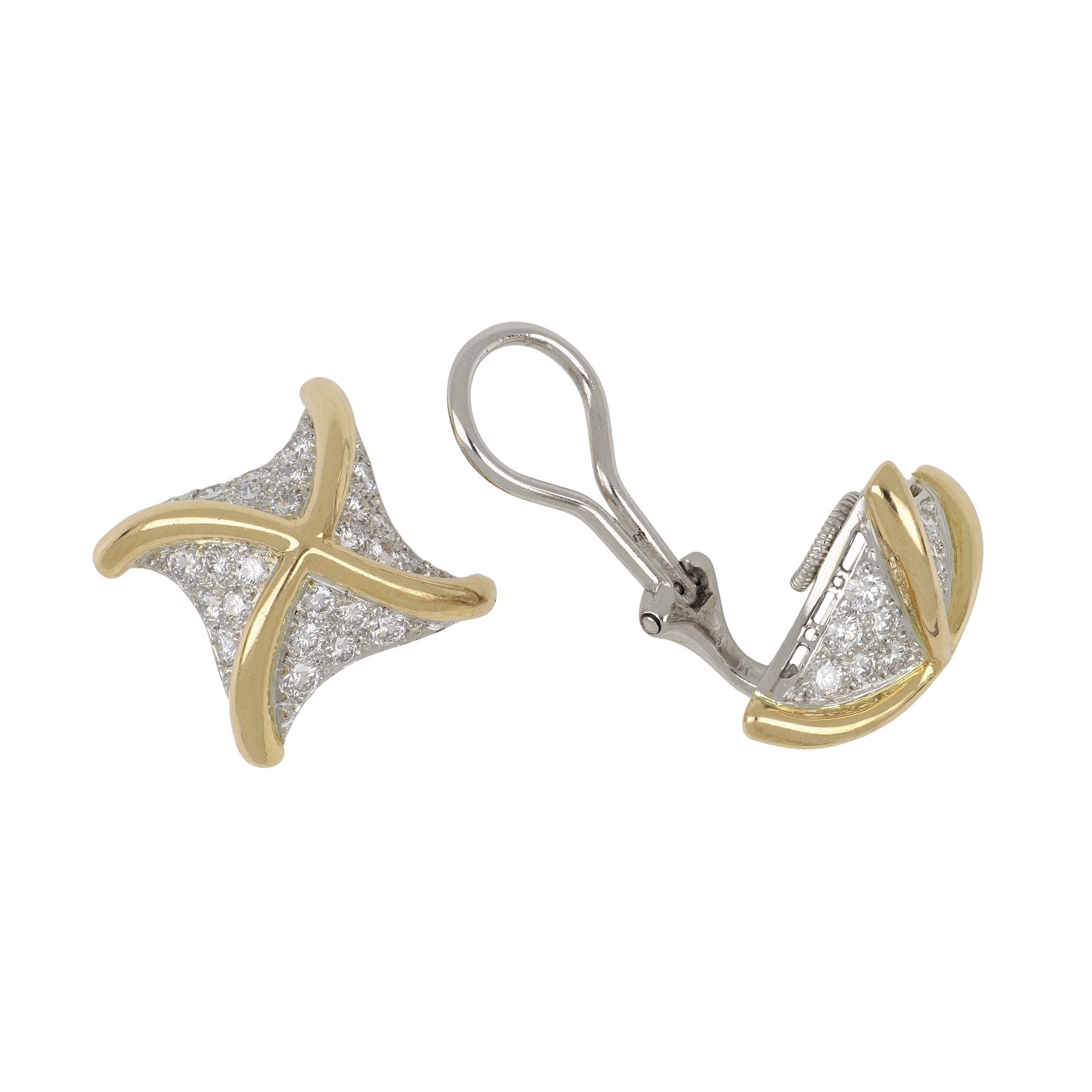A pair of mid-century Tiffany & Co. pave round brilliant-cut diamond pinwheel clip earrings, set in platinum and 18K yellow gold. Circa 1960.