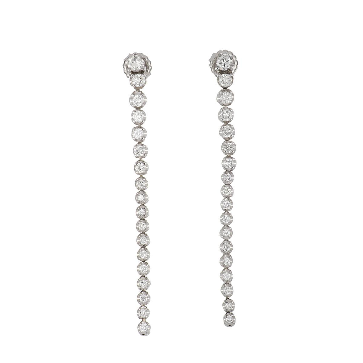 A pair of one-of-a-kind round brilliant-cut diamond graduated line drop earrings, set in 14K white gold. Crafted from Art Deco components