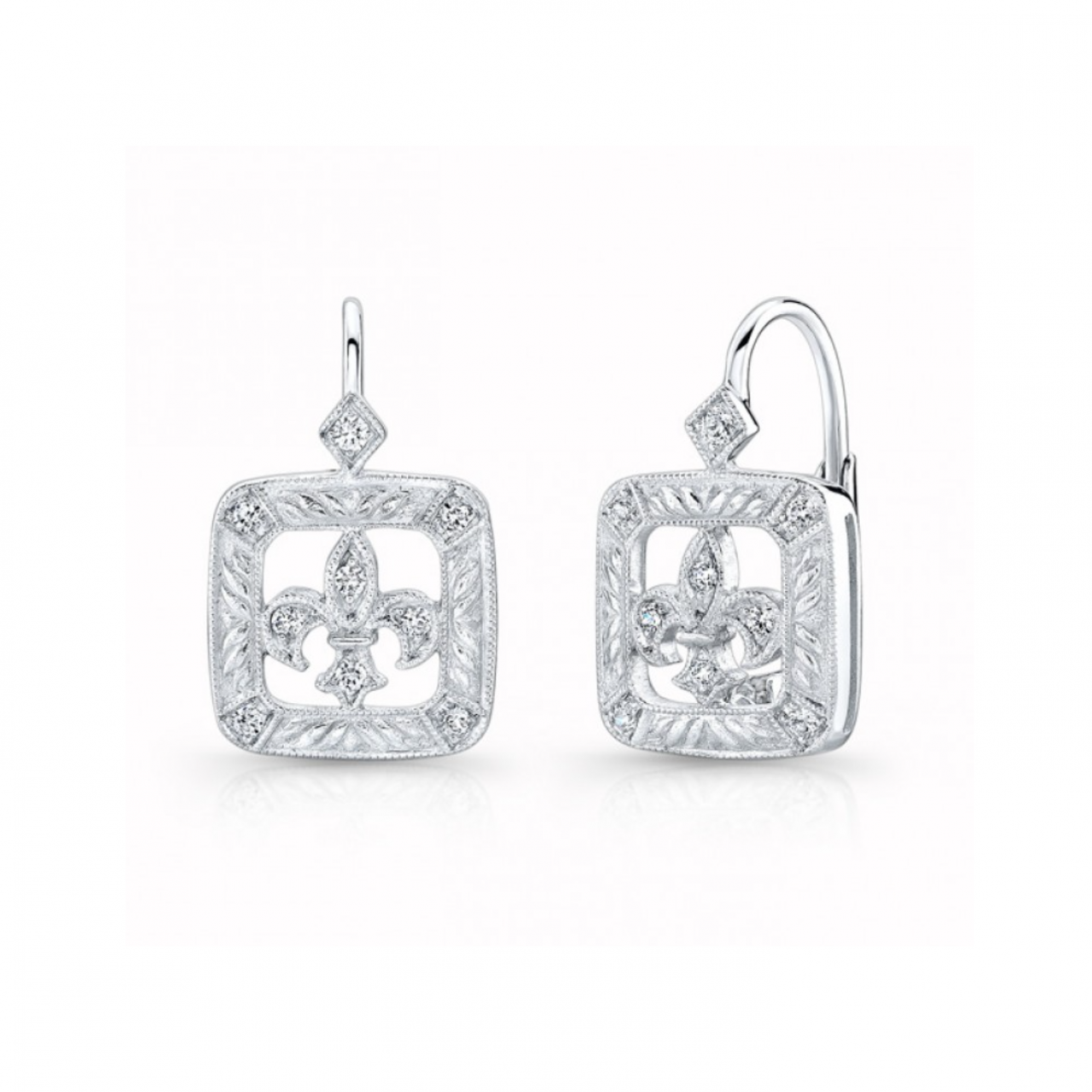 A new pair of 18k white gold openwork diamond fleur-de-lis earrings.