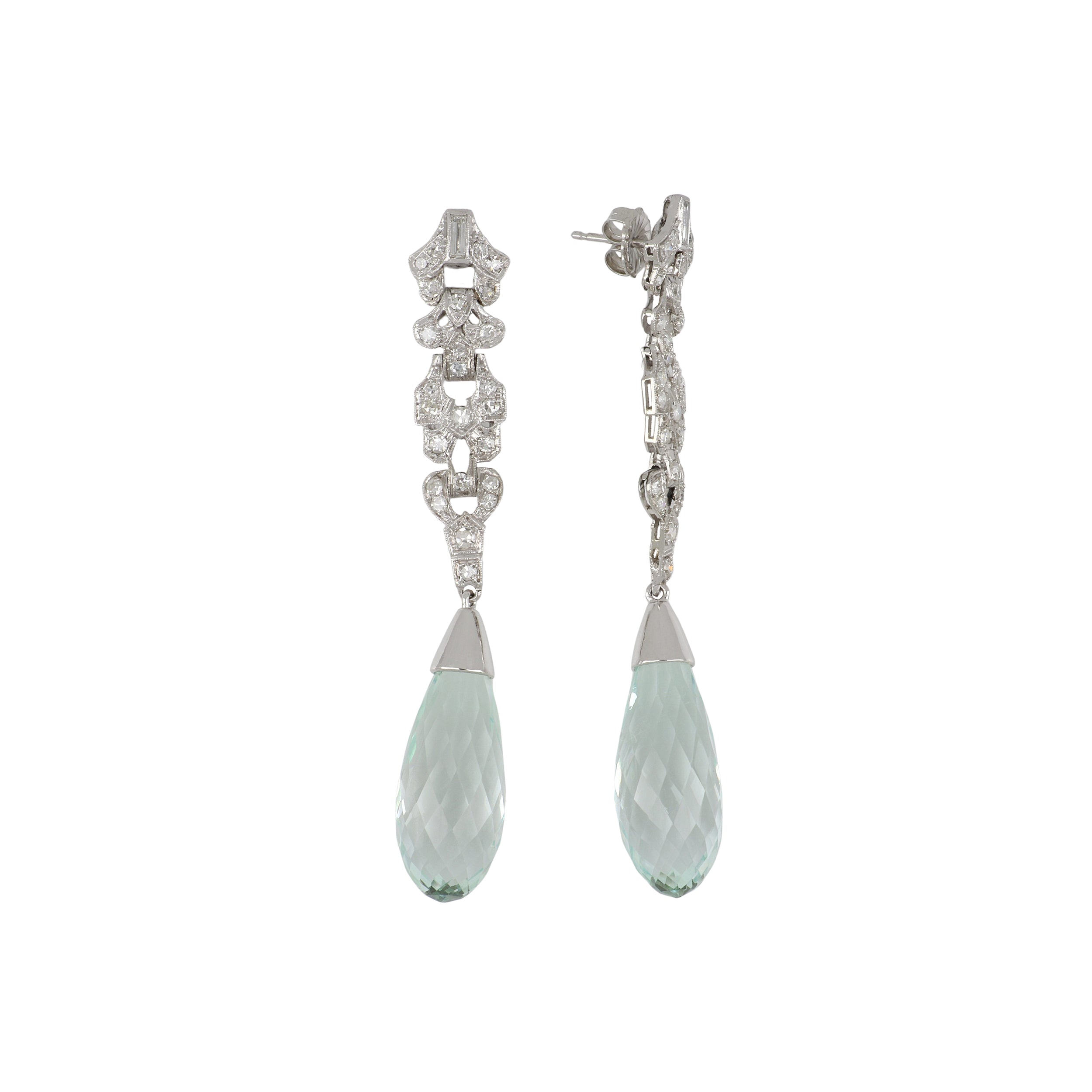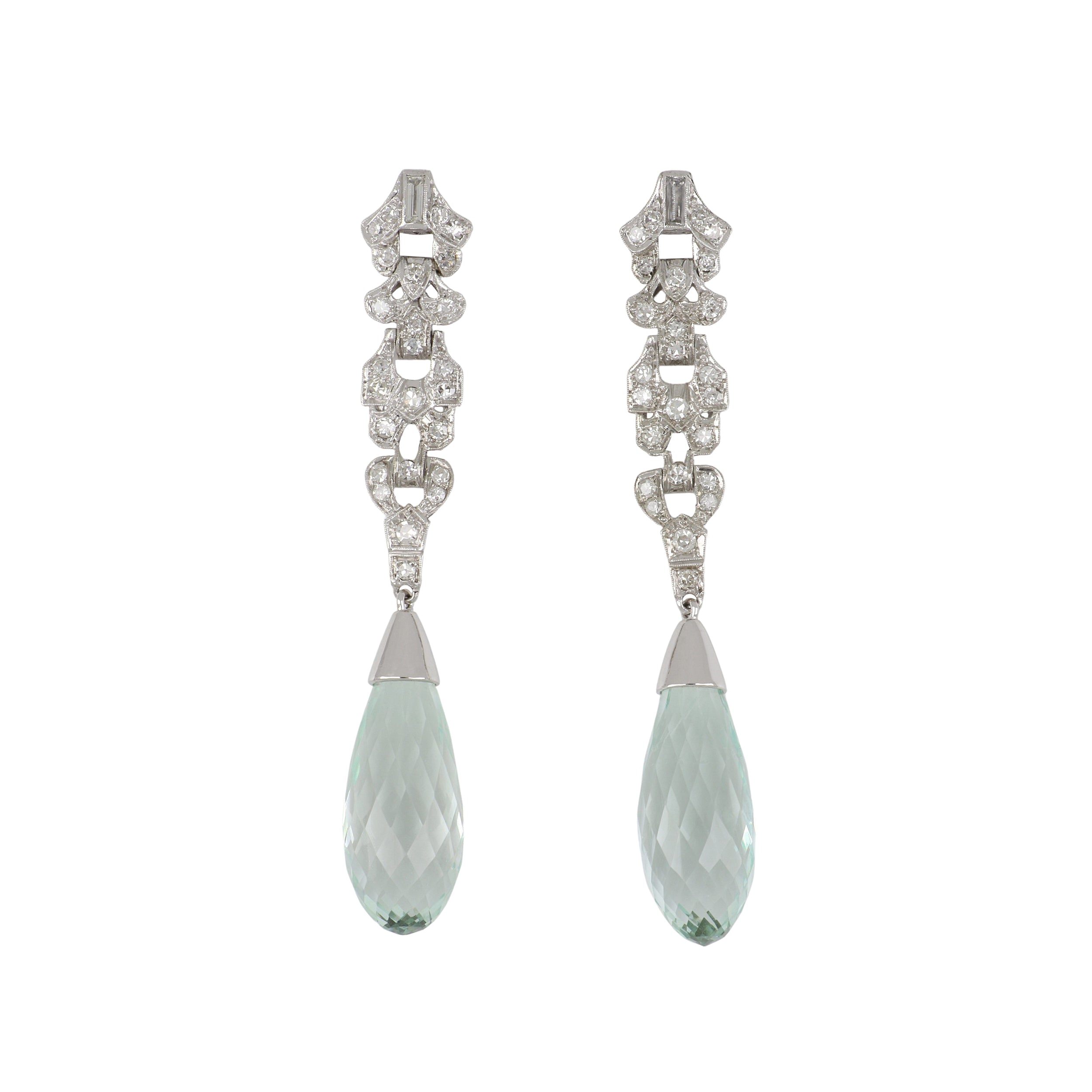 A pair of Art Deco aquamarine briolette drop earrings with baguette and Old European-cut diamond accents, set in platinum.