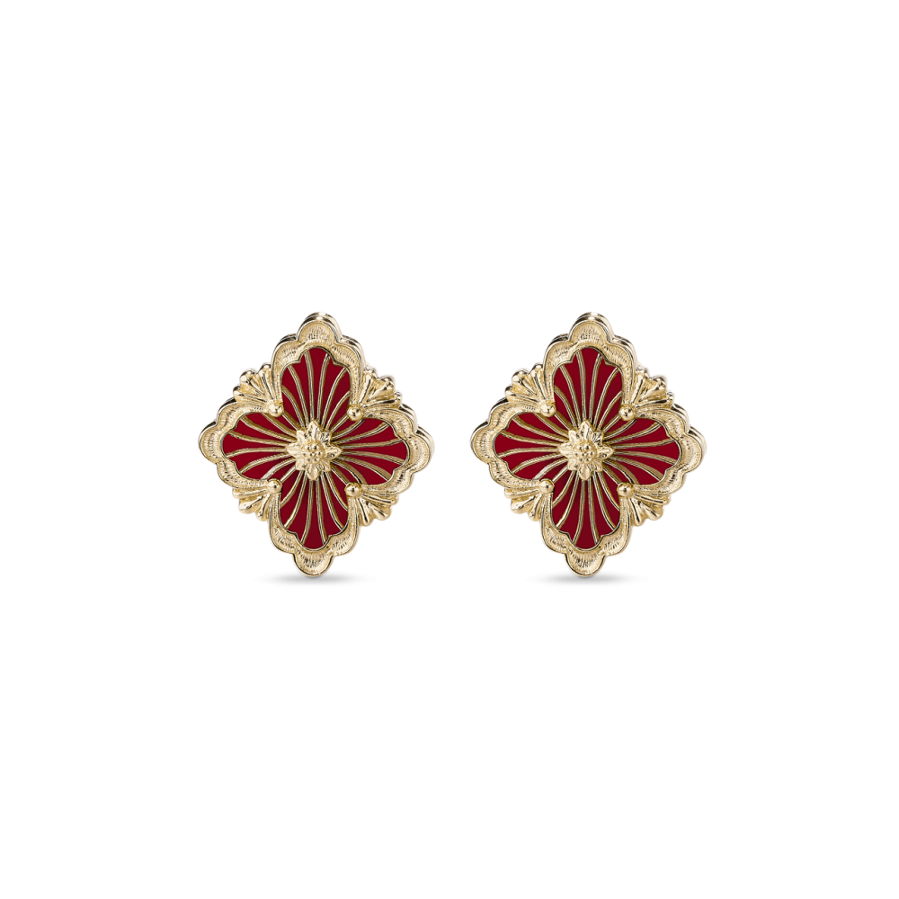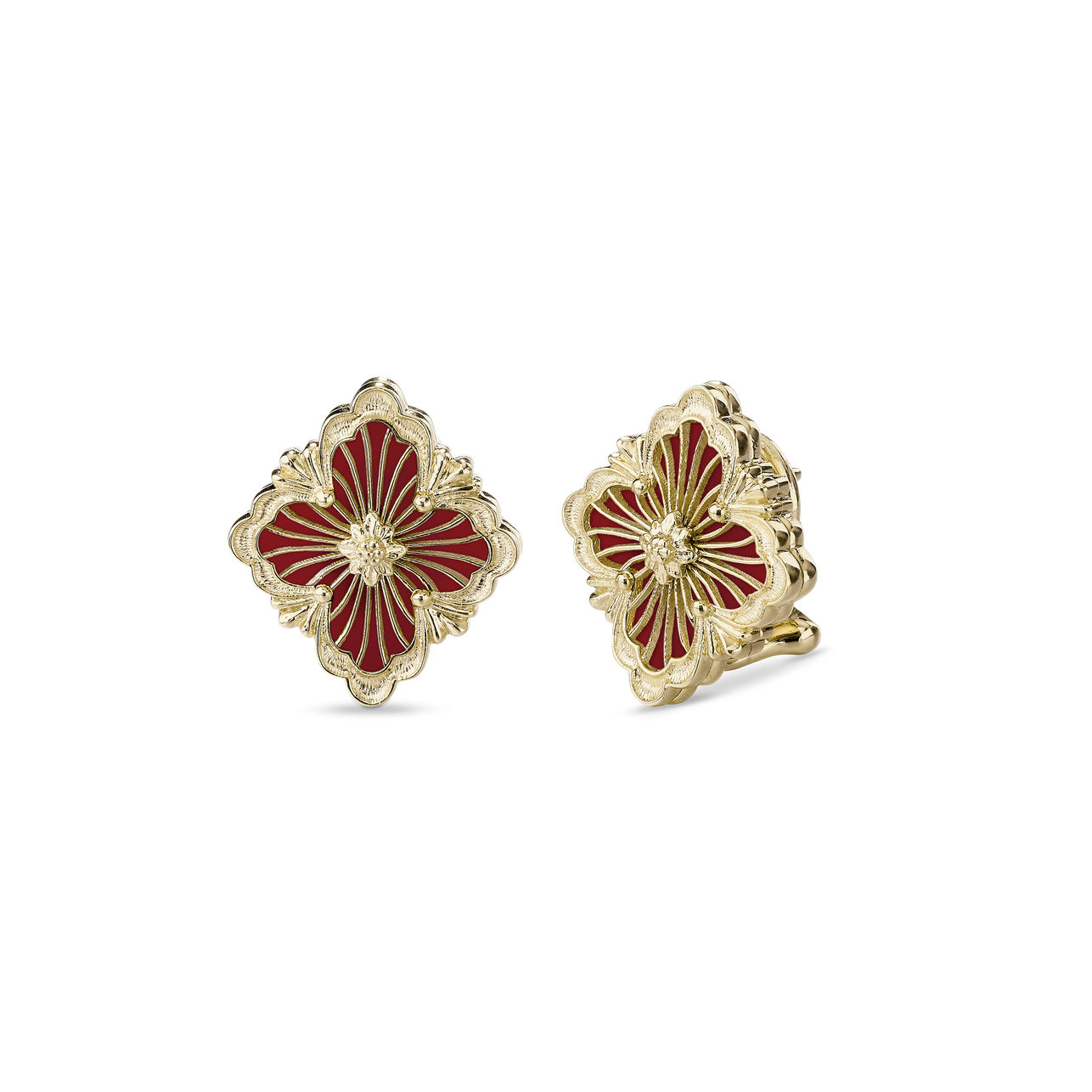 Opera Tulle button earrings composed of a logo element in yellow gold and fan-shaped scalloped borders. The red enamel element is topped with radial tulle, centering a yellow gold morette. Shiny beads in yellow gold.