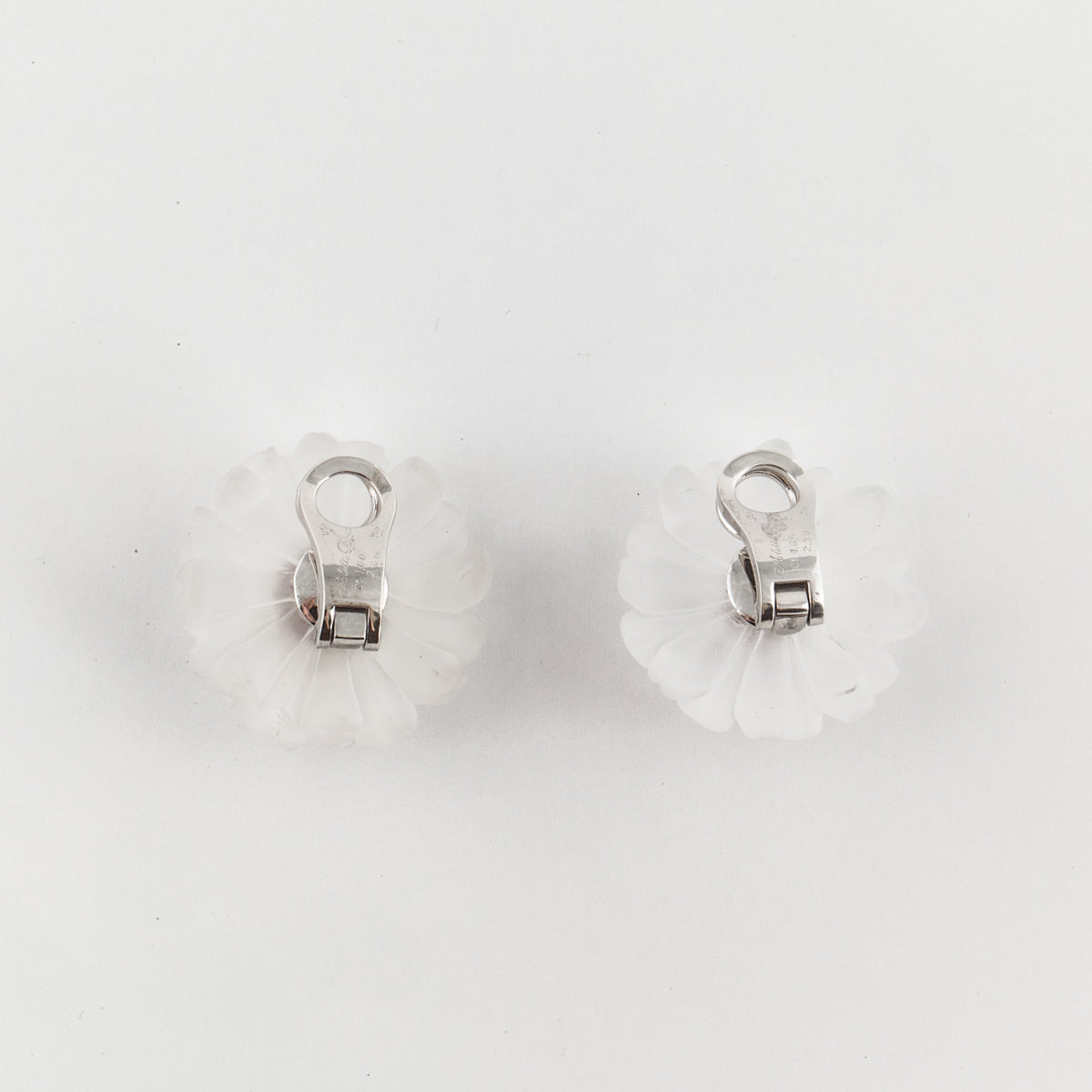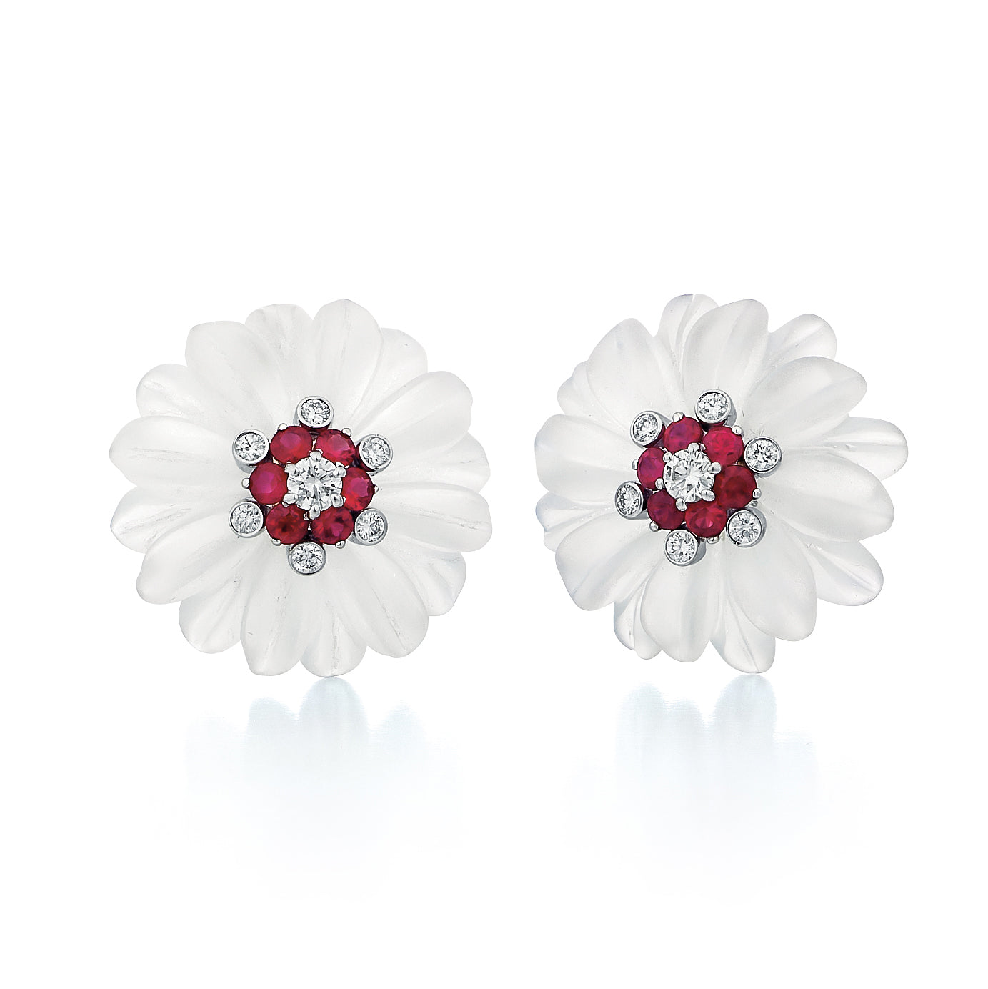 A pair of estate Aletto Brothers carved rock crystal flower earrings with diamond and ruby centers, set in pair of 18K white gold.