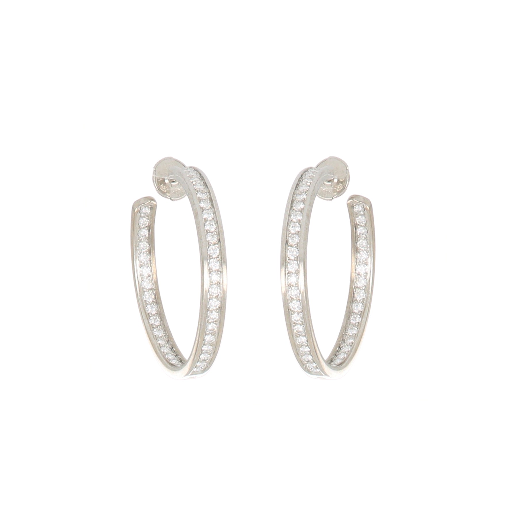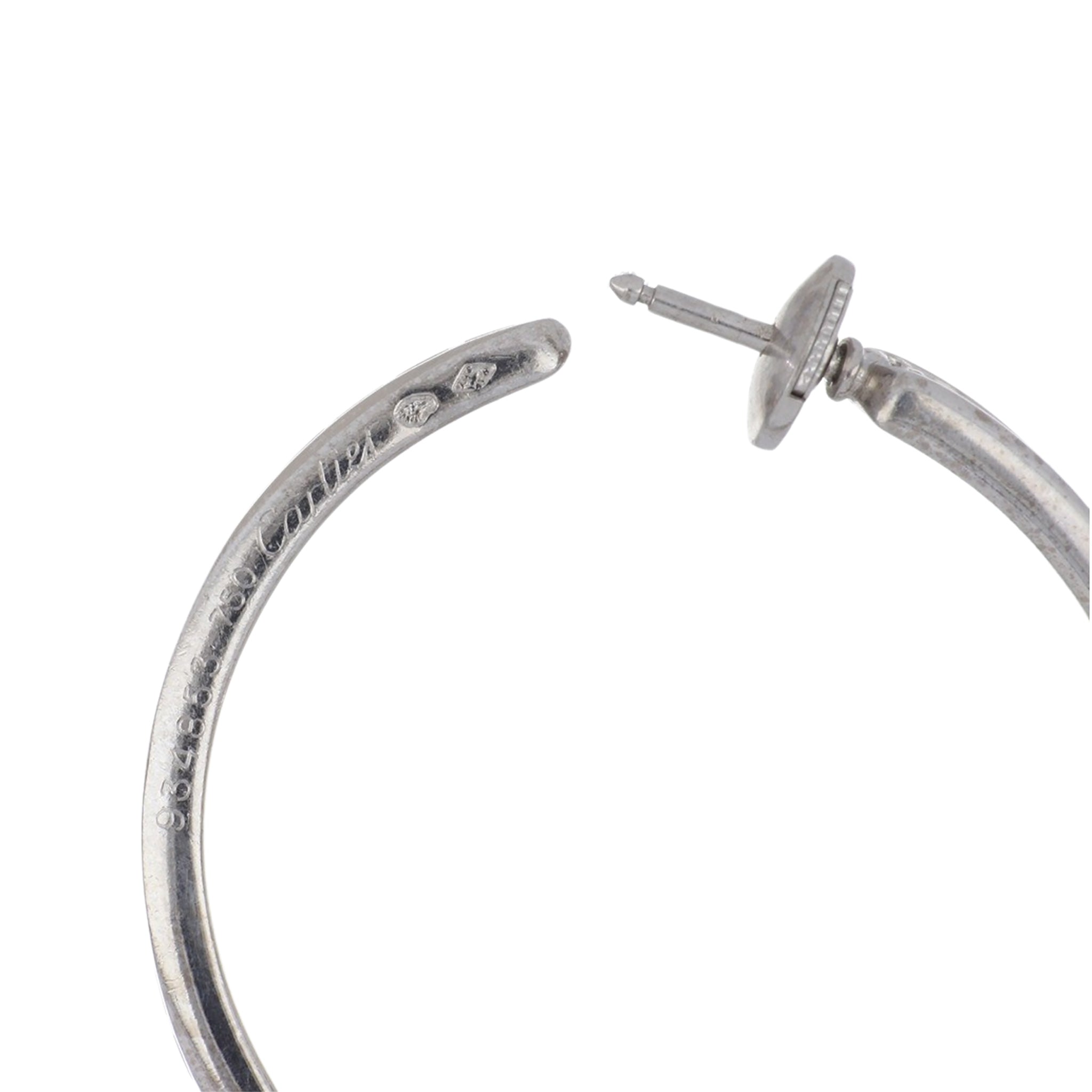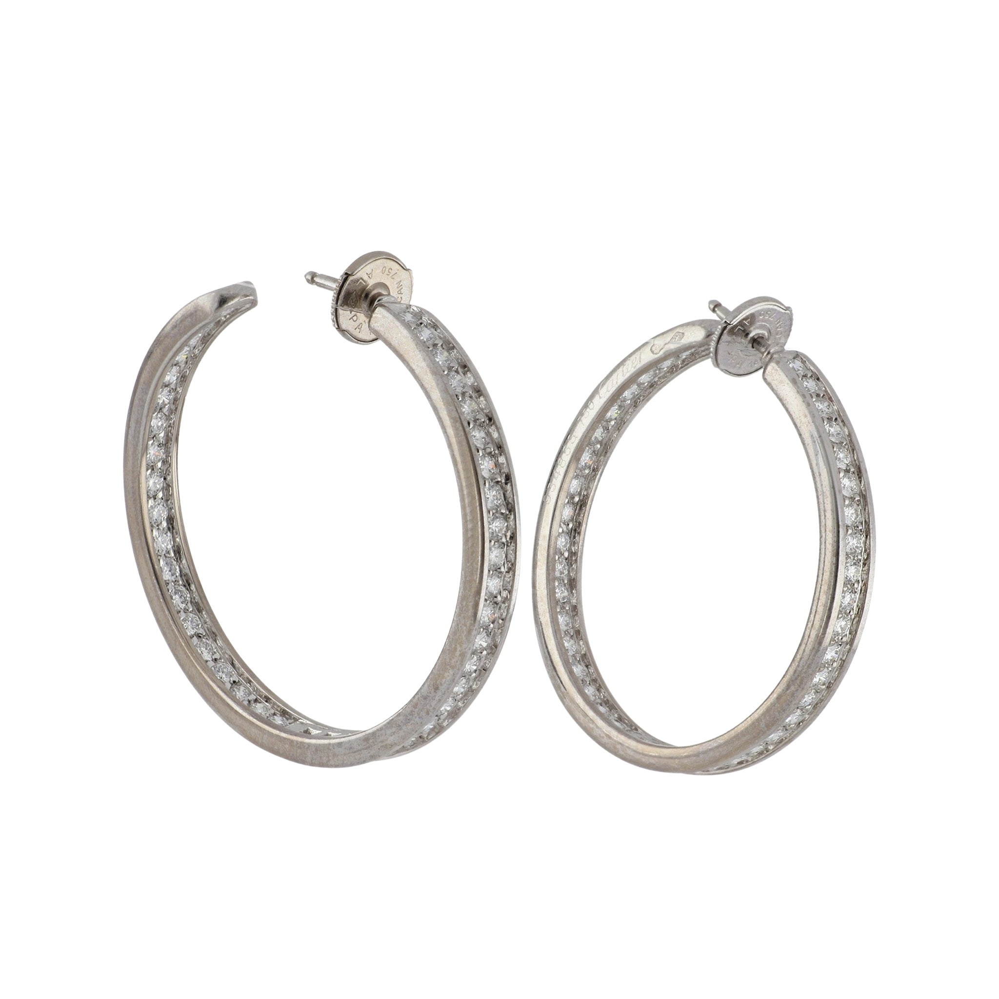 A pair of estate Cartier inside-out round brilliant-cut diamond hoop earrings, set in 18K white gold. French hallmarks, circa 2000.