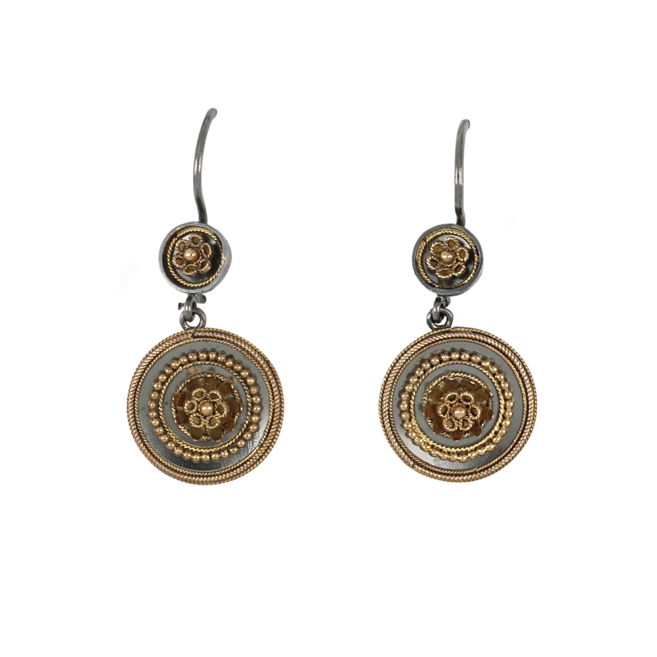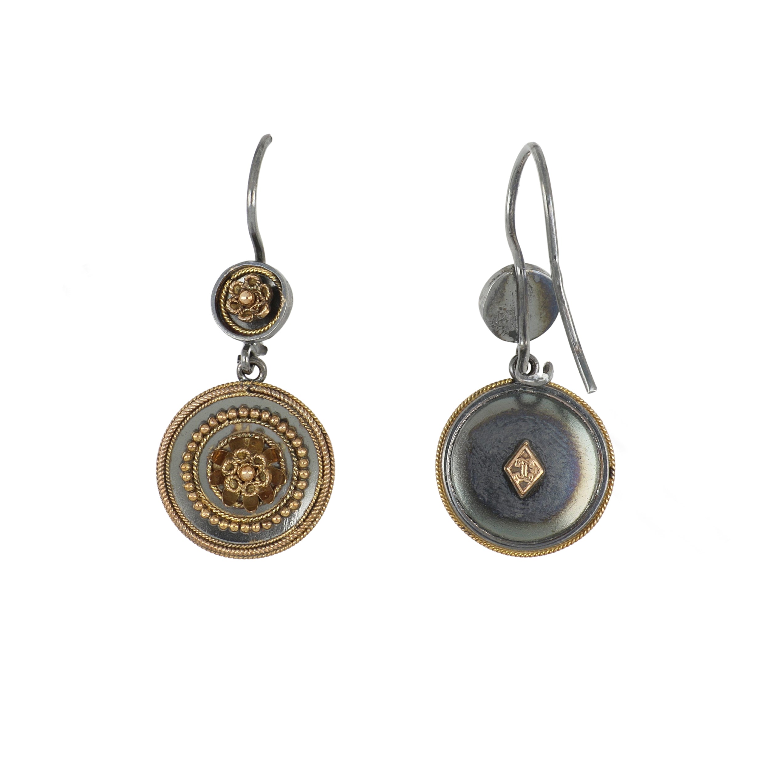 A pair of estate Castellani Etruscan style disc drop earrings with shepherds hooks, set in sterling silver and 18K yellow gold. Circa 2010.