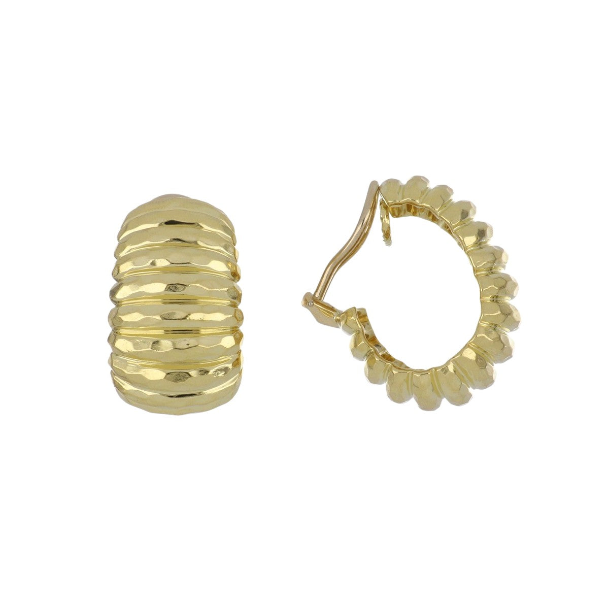 A pair of estate Henry Dunay faceted wide hoop earrings, in 18K yellow gold. Circa 2000.Vintage & Estate CollectionLength: 1"; alterable