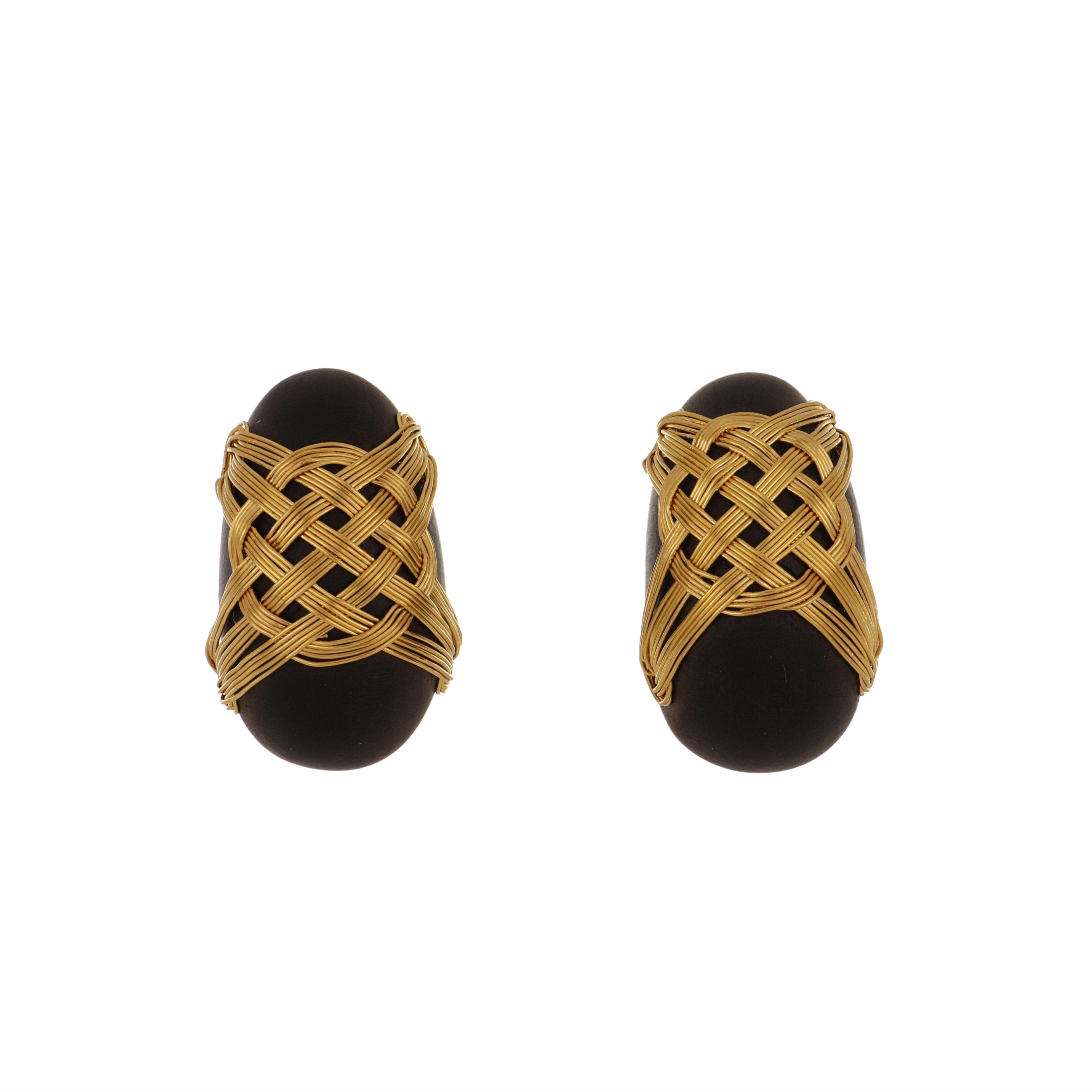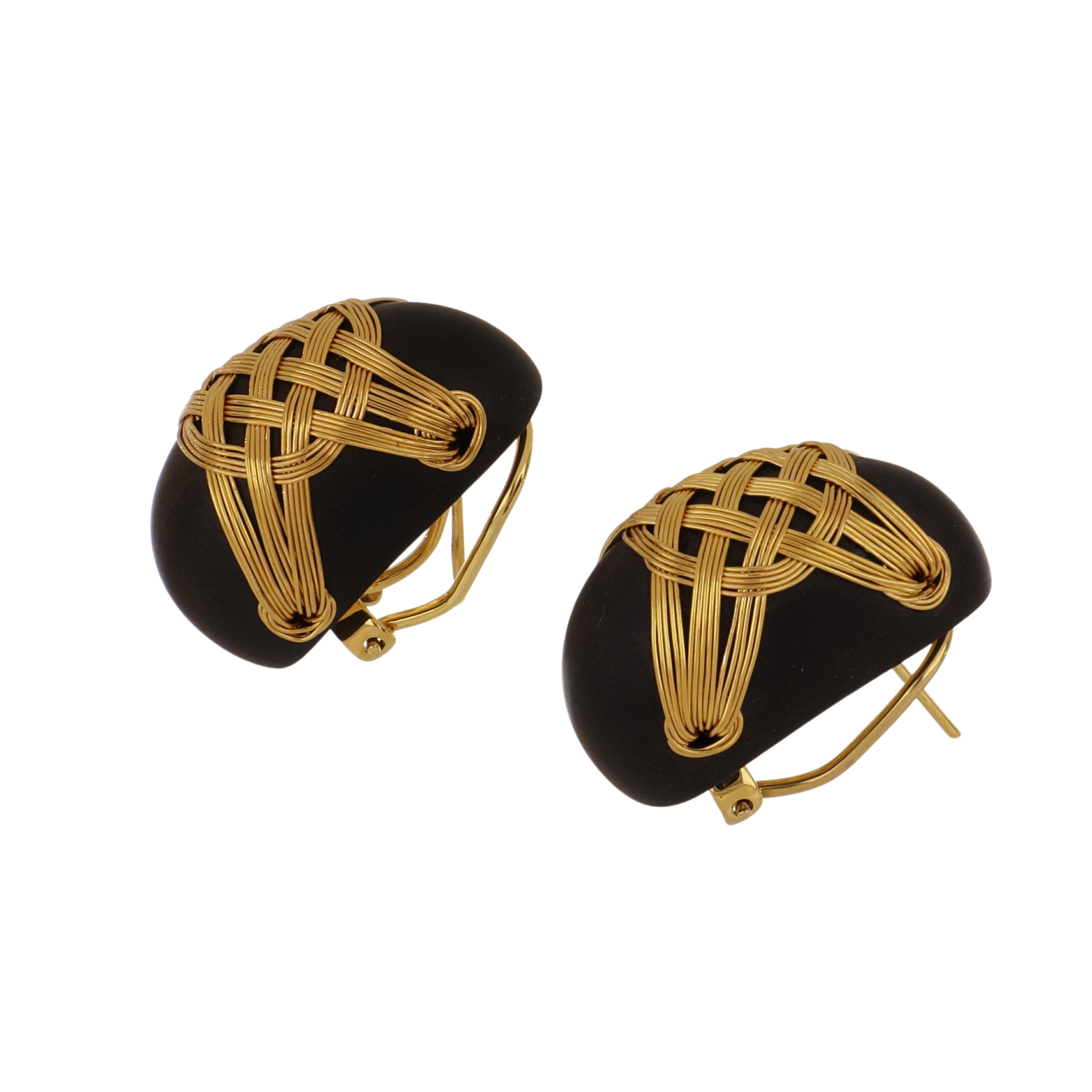 A pair of estate ebony wood earrings with 18K yellow gold woven wirework. Signed Lotus Arts de Vivre, dated 2002.Vintage & Estate Collection