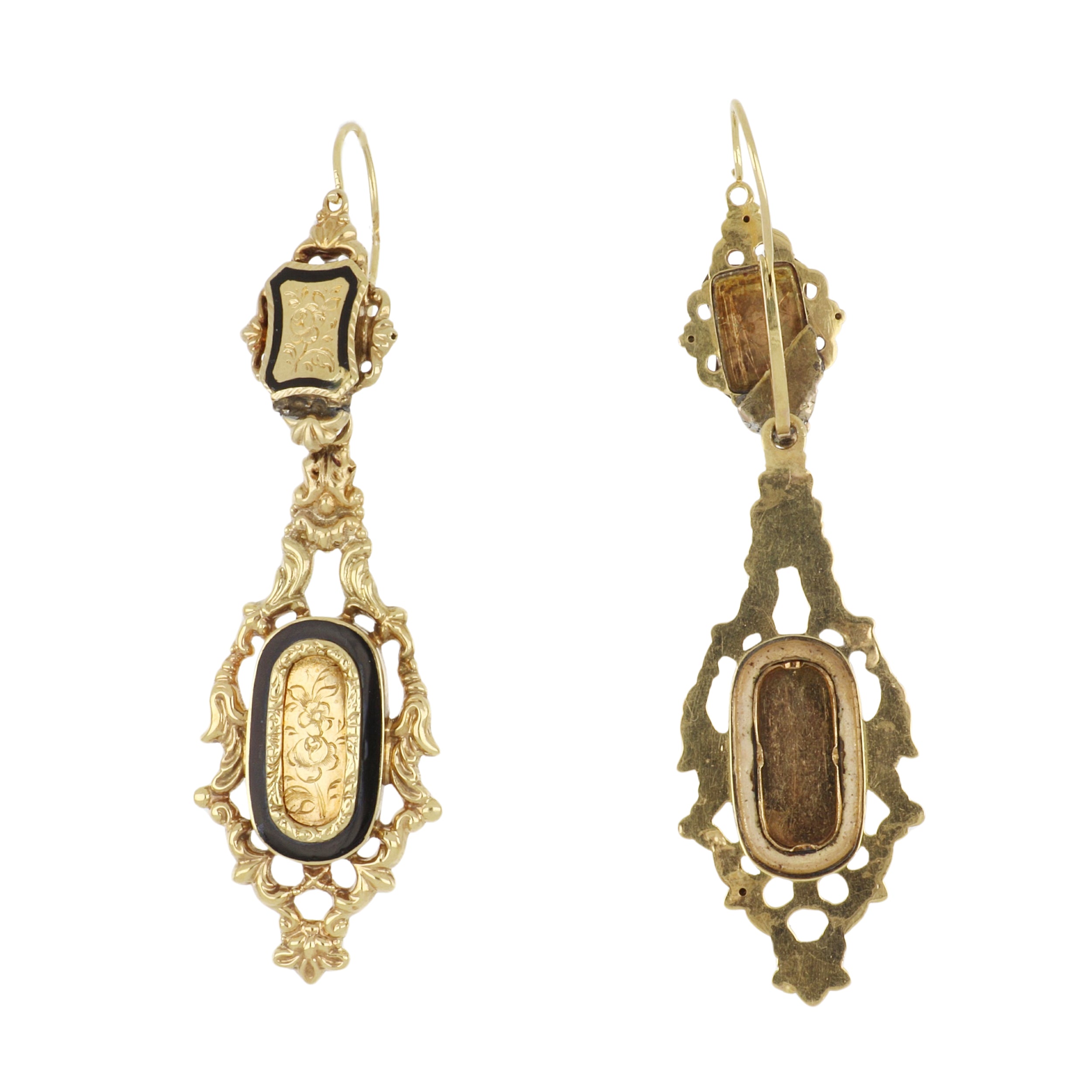 A pair of Georgian back hook repousse day-night earrings with black enamel. Circa 1830.