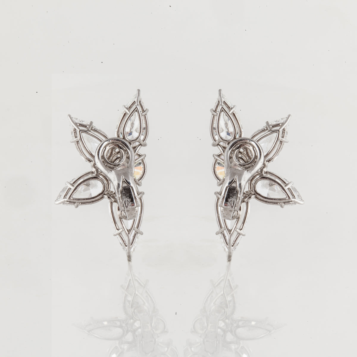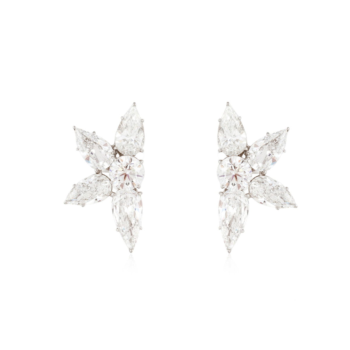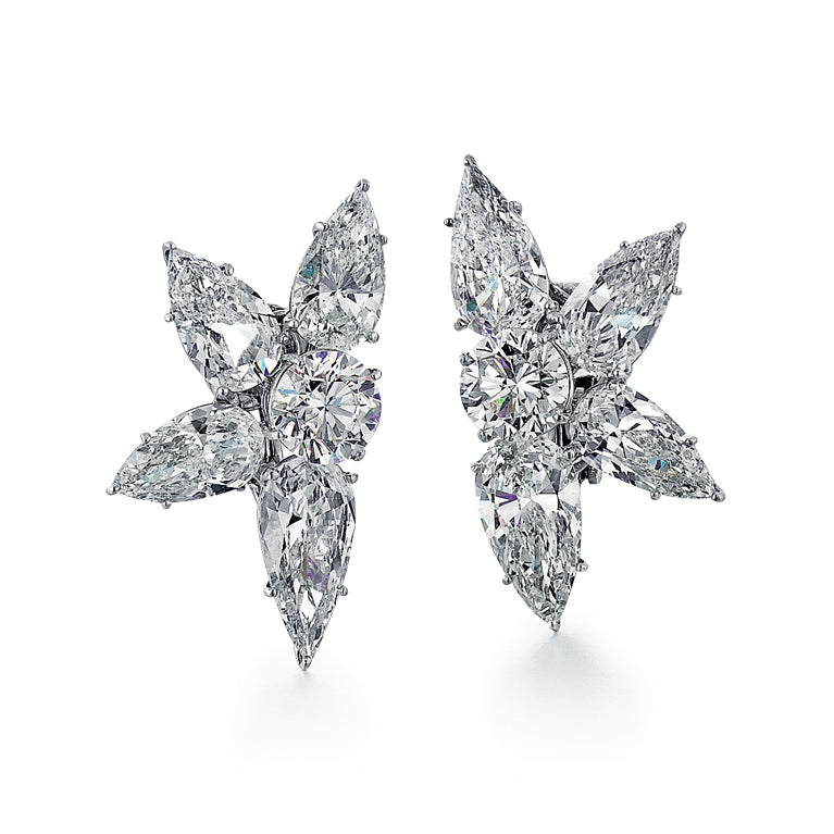 A pair of important estate Cartier pear shape and round brilliant-cut diamond cluster clip earrings, set in platinum. Circa 2000.