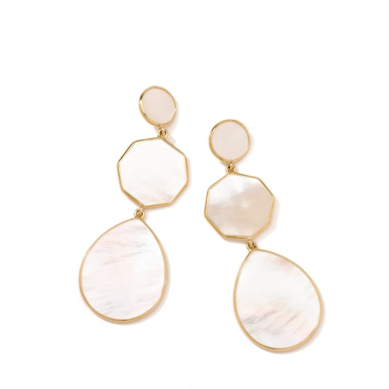 A pair of Ippolita Polished Rock Candy Crazy 8's three-stone drop earrings in mother of pearl, set in 18K yellow gold.