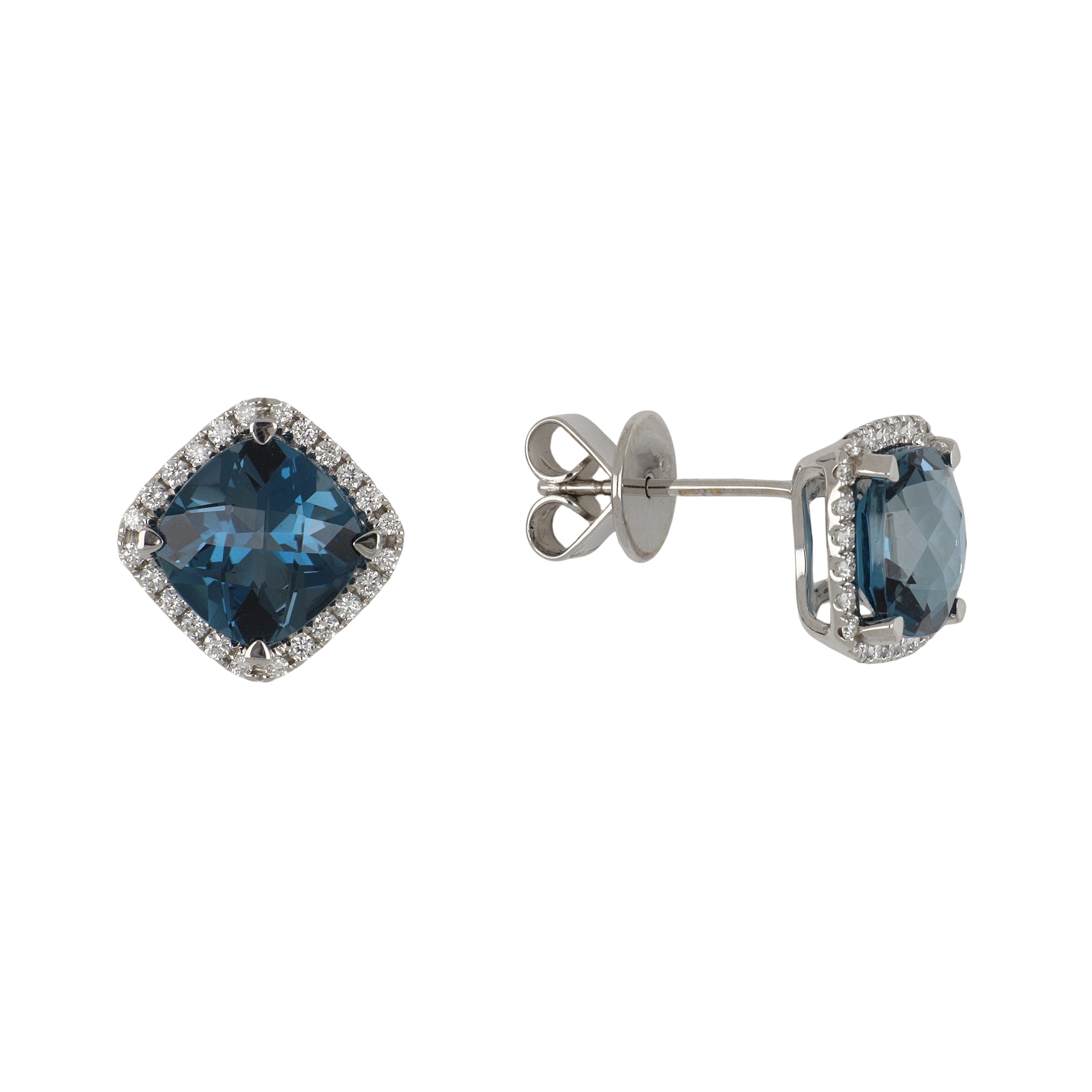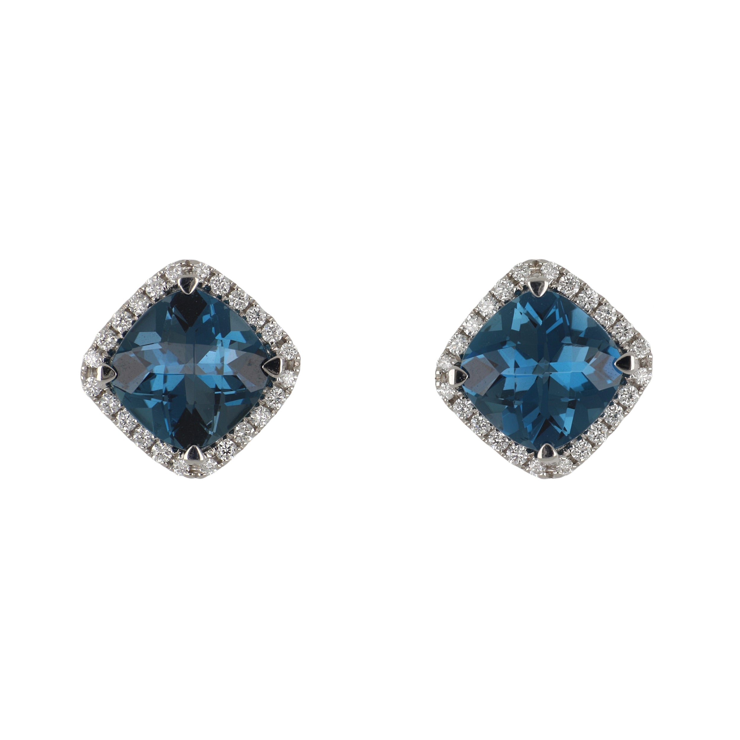 A pair of Lisa Nik 'Rocks' collection stud earrings featuring cushion-shaped London blue topaz with round brilliant-cut diamond halos, set in 18K white gold.