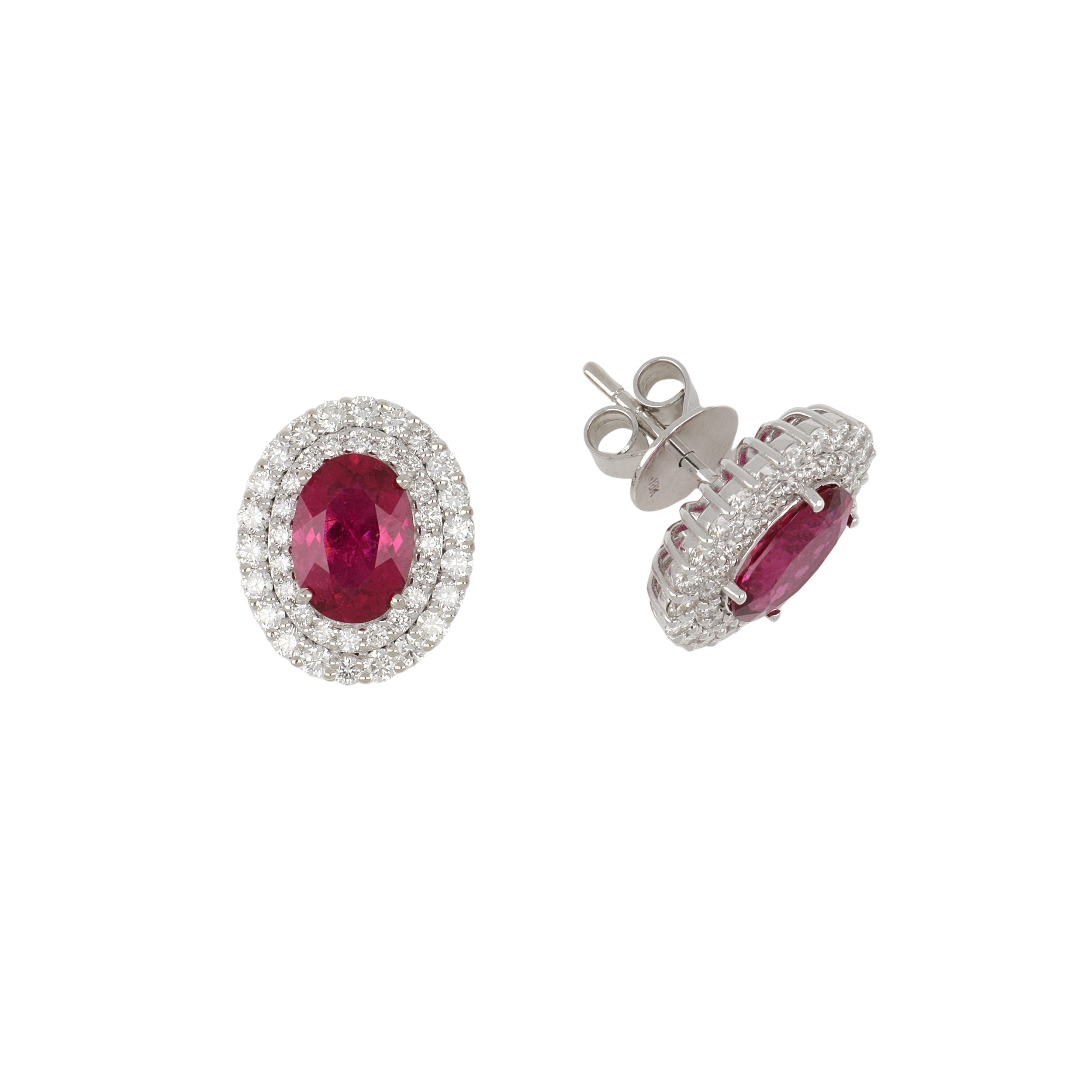 A pair of Maharaja oval-cut pink tourmaline stud earrings with double round brilliant-cut diamond halos, set in 18K white gold.