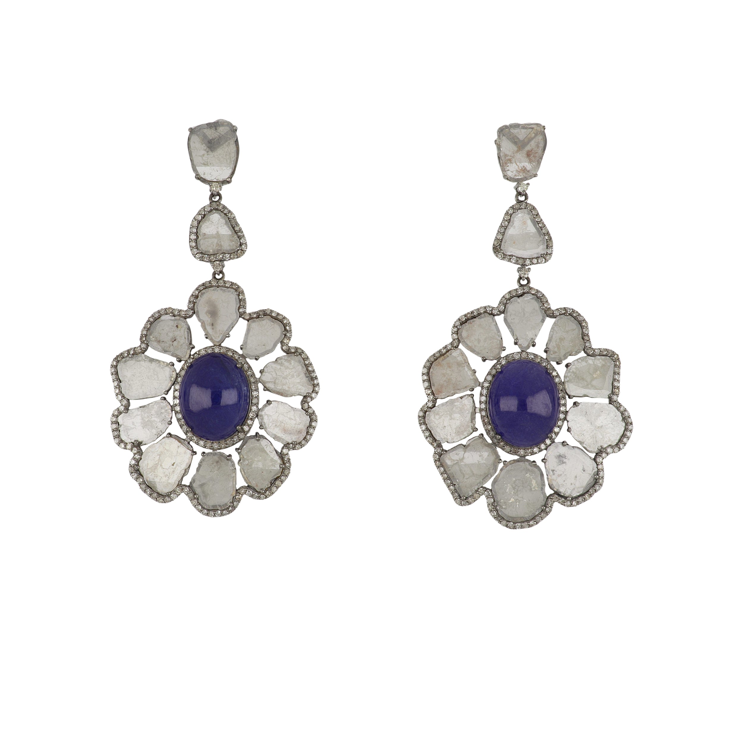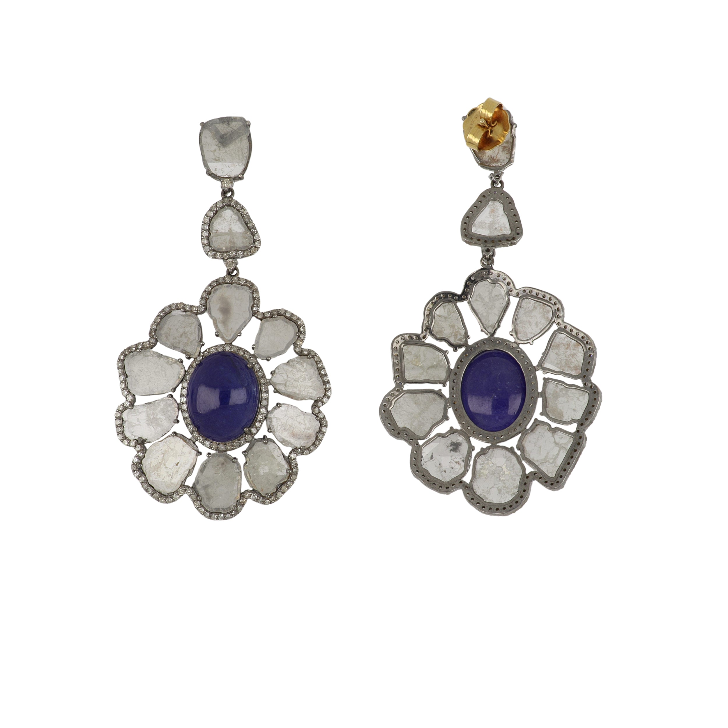 A pair of Maharaja diamond slice drop earrings with cabochon cut tanzanite centers, set in sterling silver.
