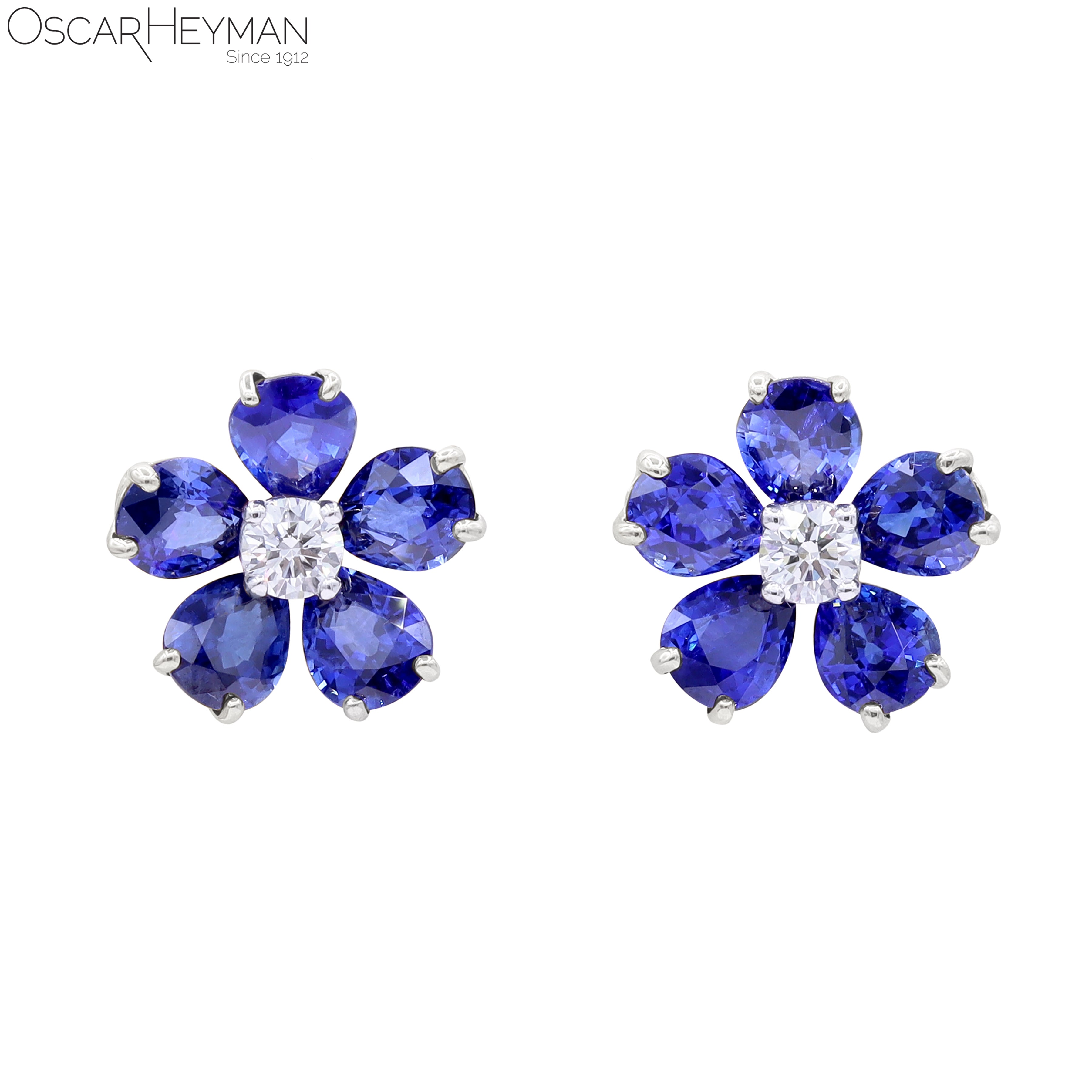 A pair of Oscar Heyman flower earrings with sapphire petals and diamond centers, set in platinum. Signed: Oscar Heyman.