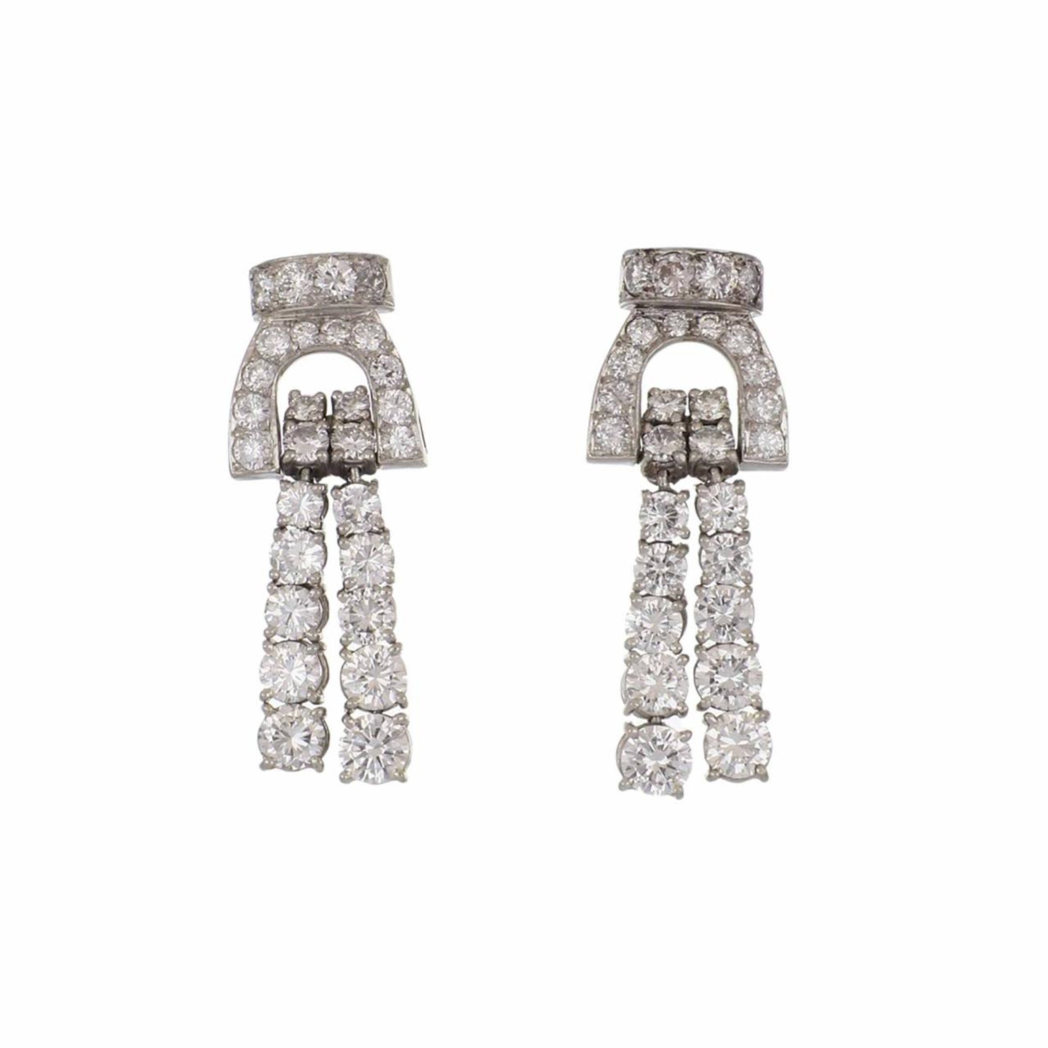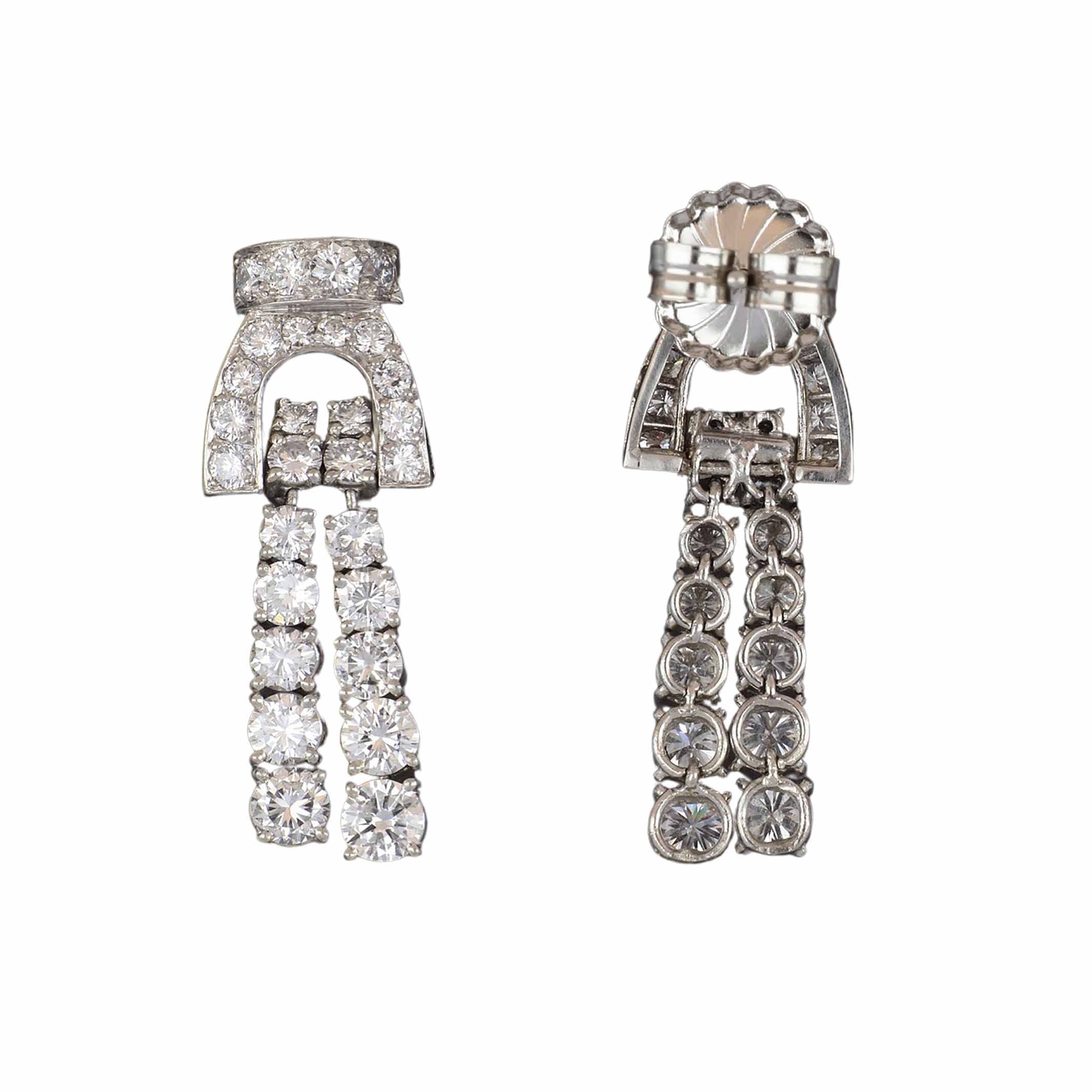 A pair of estate antique double row, prong set round brilliant-cut diamond earrings in platinum.