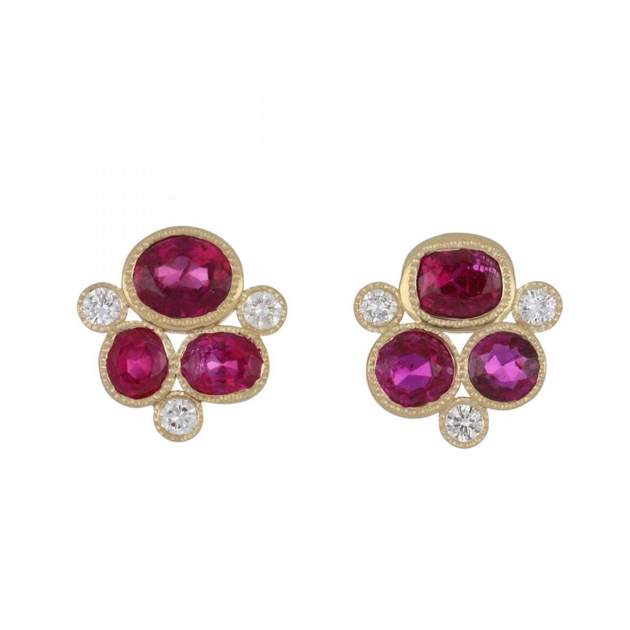 A pair of bezel-set ruby and round diamond cluster stud earrings set in 18k yellow gold.