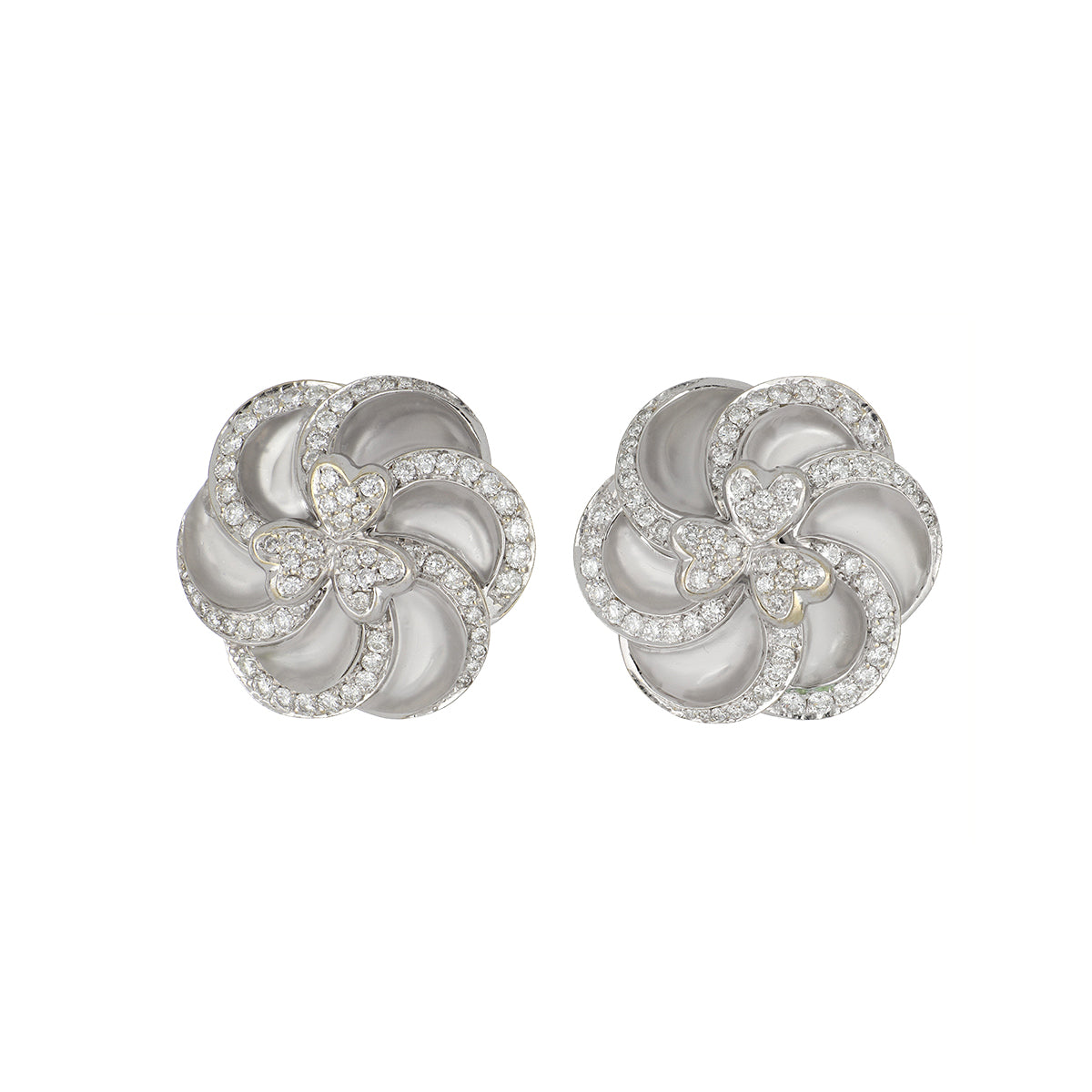 A pair of vintage Andredi carved rock crystal quartz pinwheel earrings with round brilliant-cut diamonds, set in 18K white gold. Circa 1990.