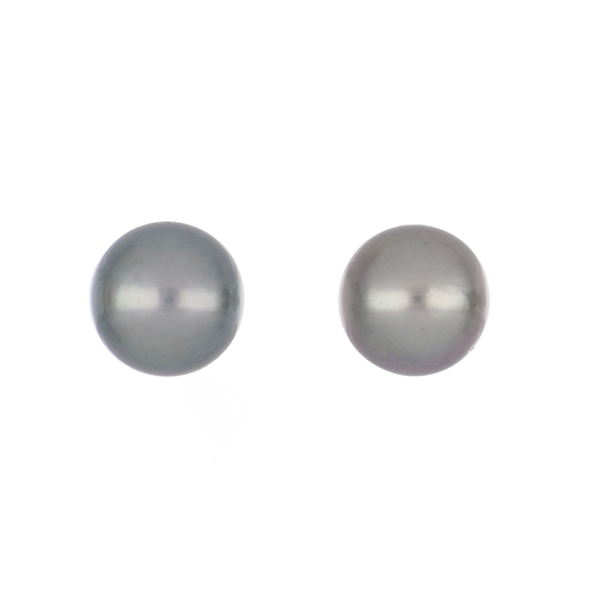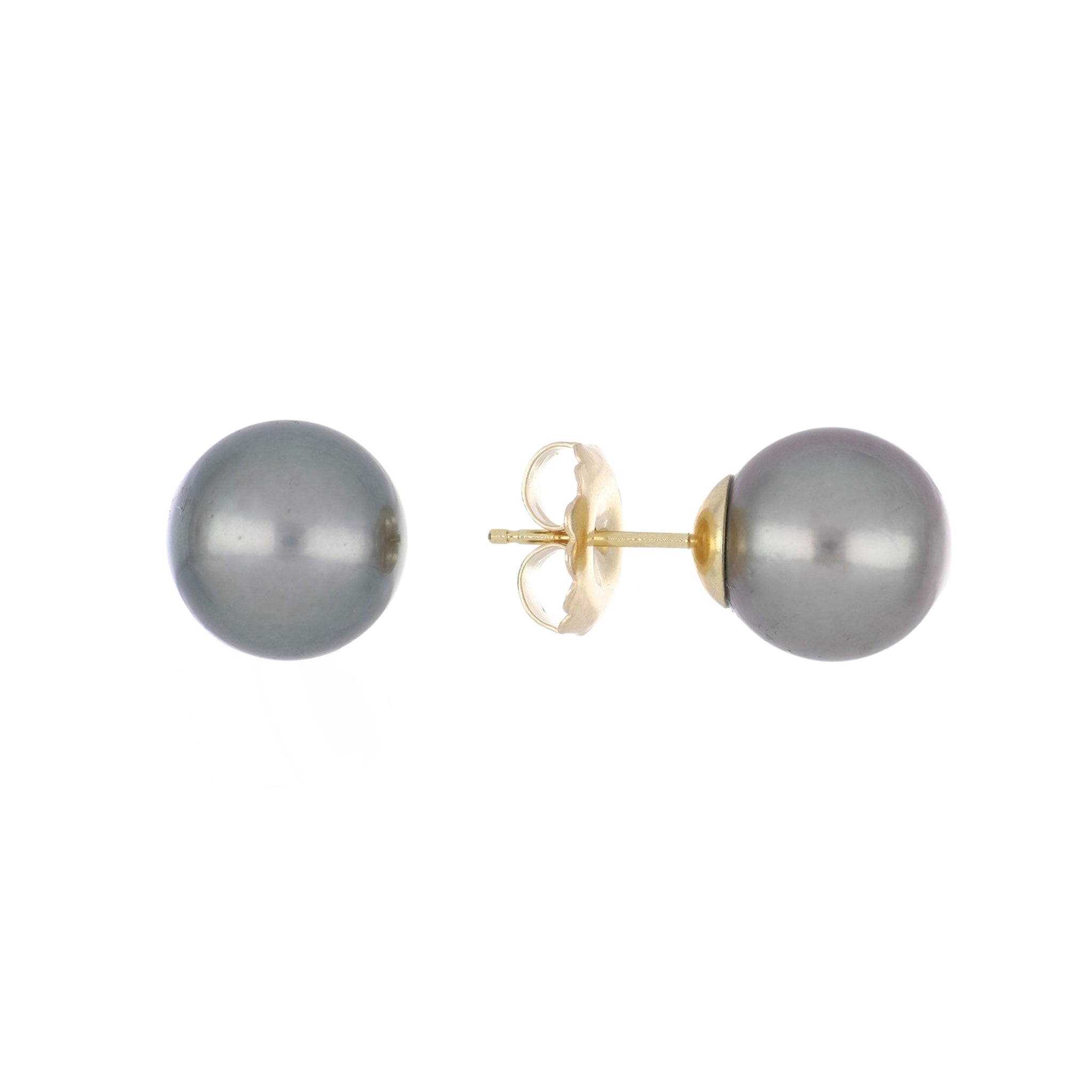 A pair of estate 14K yellow gold Tahitian pearl stud earrings.