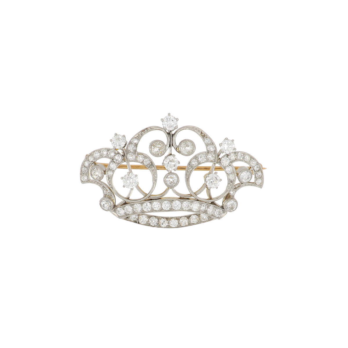 An Edwardian diamond crown brooch, set in platinum and 18K gold. Circa 1905.