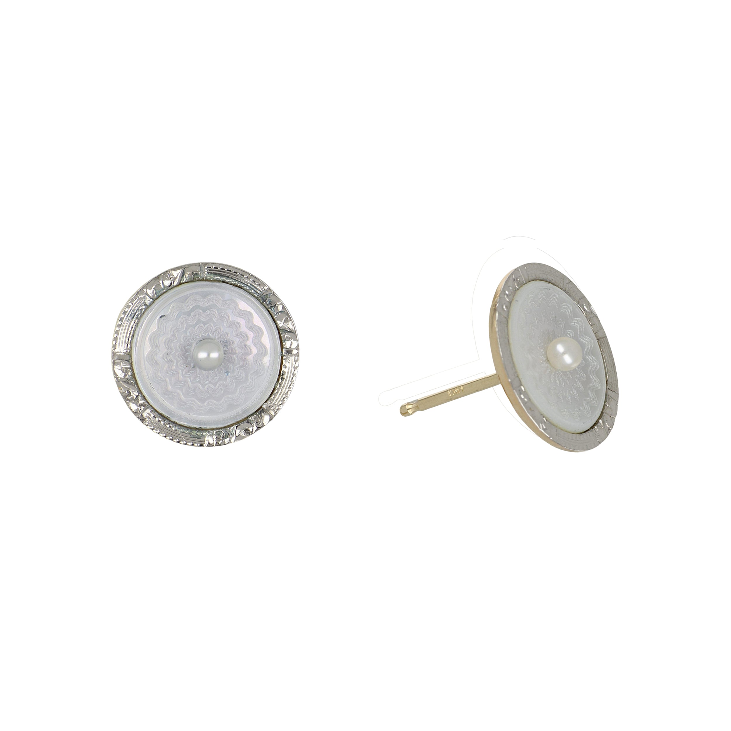 A pair of carved mother-of-pearl stud earrings with pearl centers and engraved platinum borders, and 14K yellow gold backs. Crafted from Edwardian cufflinks, circa 1910.