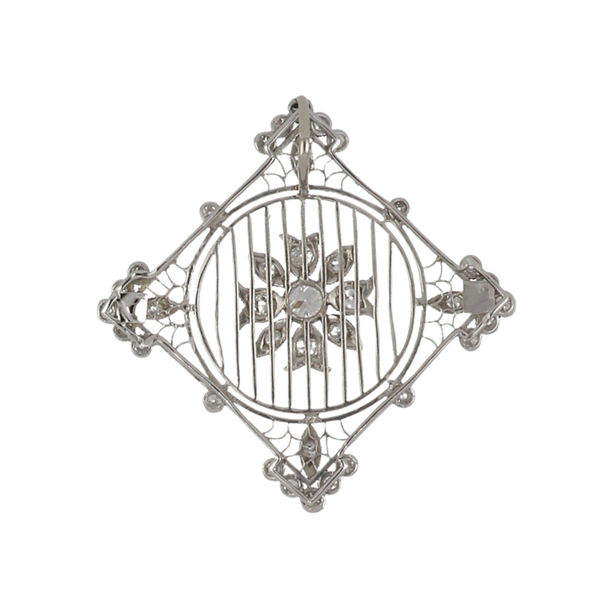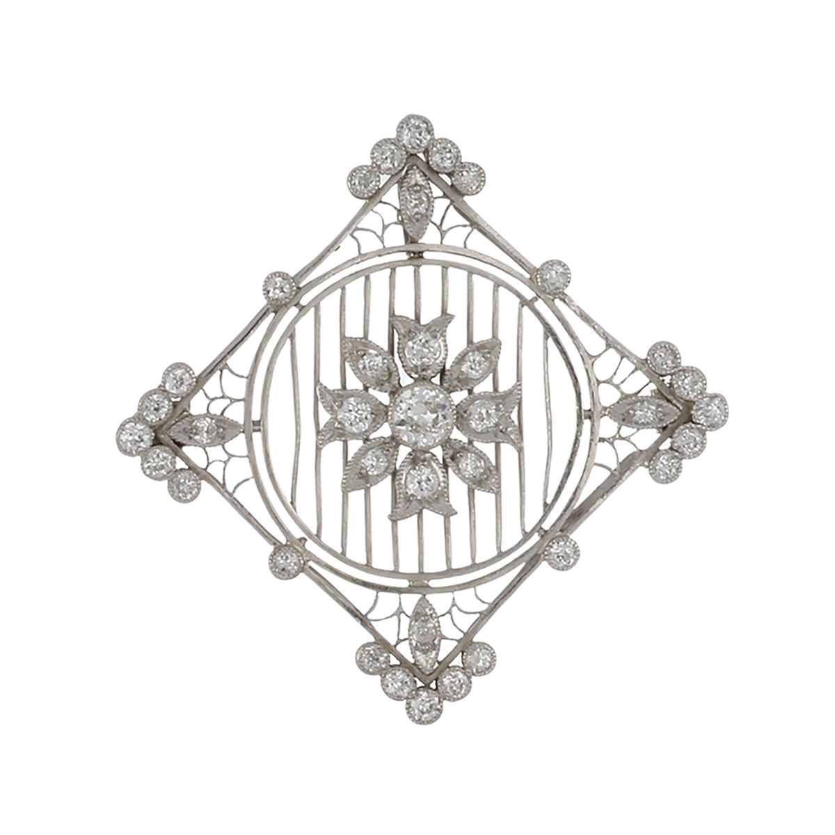 An Edwardian platinum square fretwork filigree pendant with flower motif. Circa 1910.Antique CollectionOld European-cut diamonds= 0.75 carats, G-H color, VS1-VS2 clarityLength: 1 inch -not alterable
