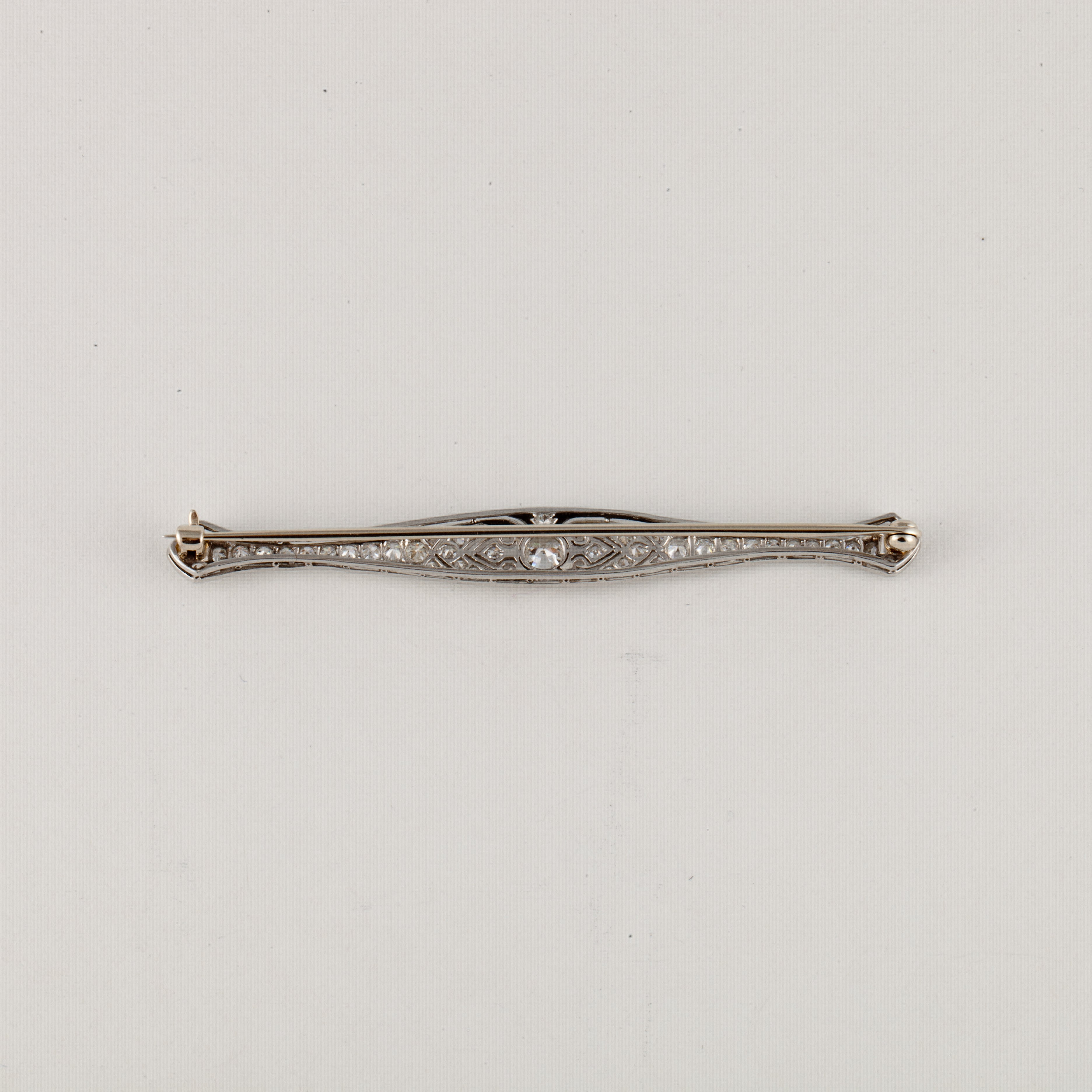 An Edwardian pierced Old European-cut diamond bar pin set in platinum with a 14K yellow gold pin stem. Circa 1910.